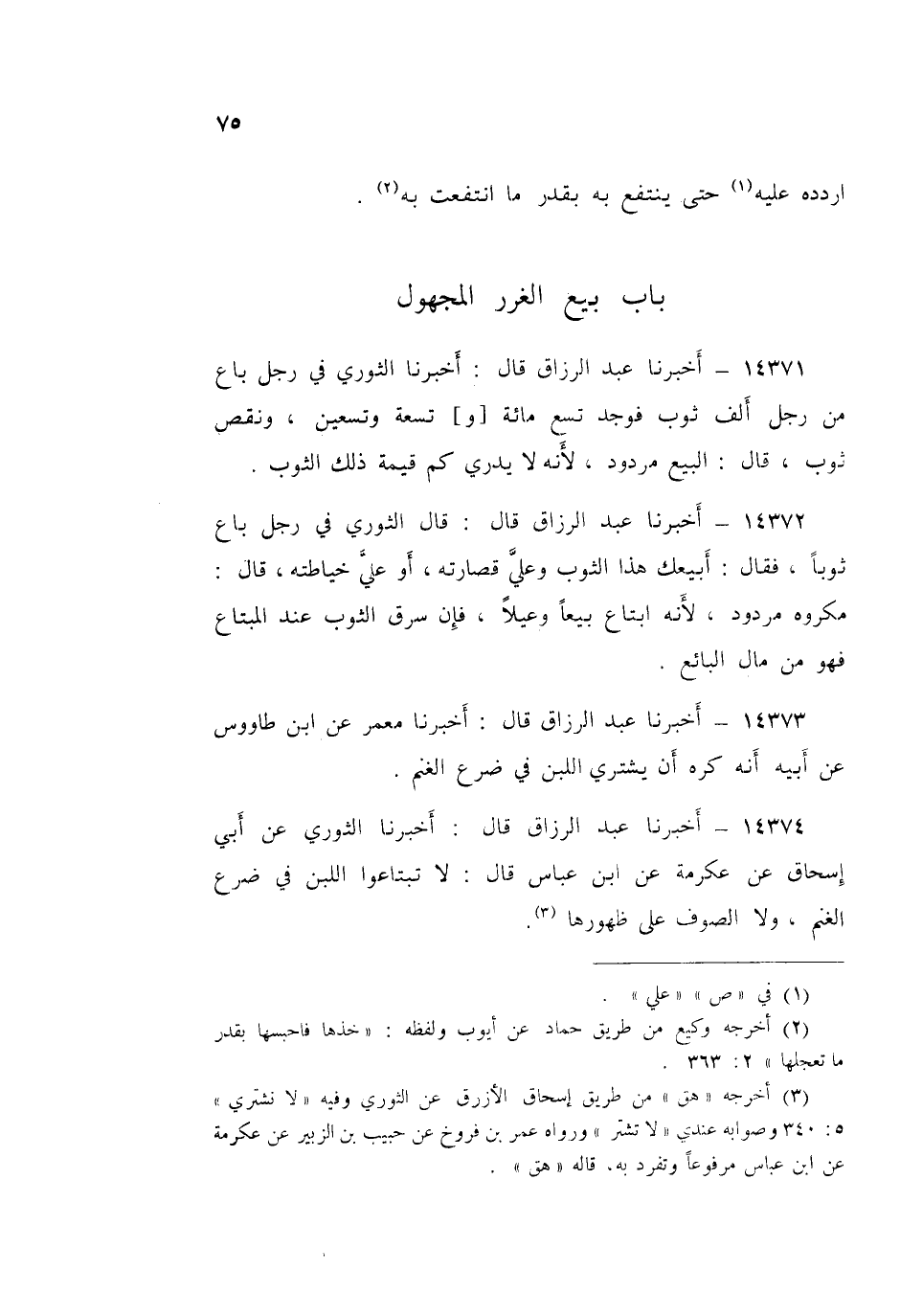 ١٤٣٧٣ - عَبْدُ الرَّزَّاقِ قَالَ: أَخْبَرَنَا مَعْمَرٌ، عَنِ ابْنِ طَاوُسٍ، عَنْ أَبِيهِ، «أَنَّهُ كَرِهَ أَنْ يُشْتَرَى اللَّبَنُ فِي ضَرْعِ الْغَنَمِ»