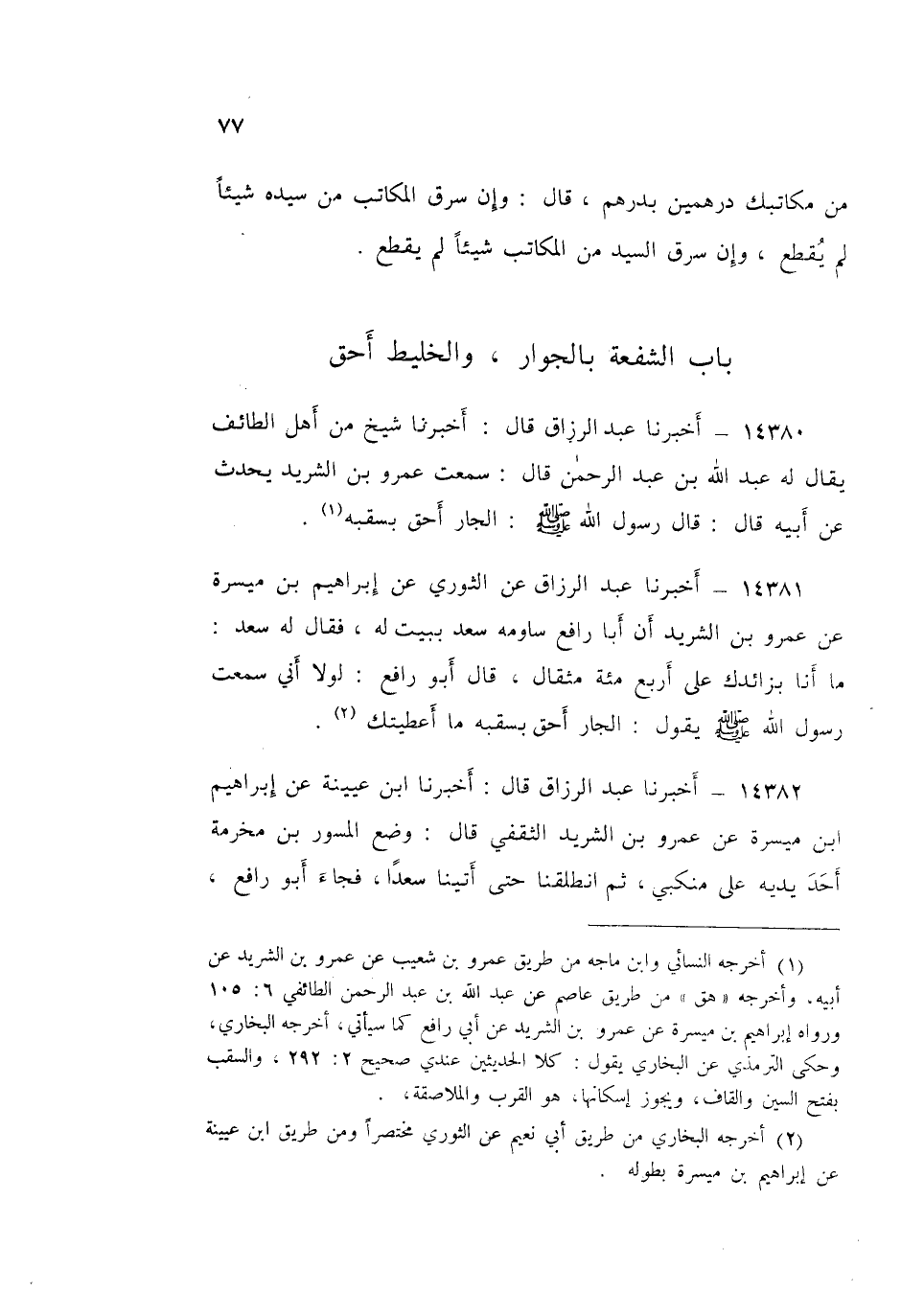 ١٤٣٨٢ - عَبْدُ الرَّزَّاقِ قَالَ: أَخْبَرَنَا ابْنُ عُيَيْنَةَ، عَنْ إِبْرَاهِيمَ بْنِ مَيْسَرَةَ، عَنْ عَمْرِو بْنِ الشَّرِيدِ الثَّقَفِيِّ قَالَ: وَضَعَ الْمُسَوِّرُ بْنُ مَخْرَمَةَ أَحَدَ يَدَيْهِ عَلَى مِنْكَبِي، ثُمَّ انْطَلَقْنَا حَتَّى أَتَيْنَا سَعْدًا، فَجَاءَ أَبُو رَافِعٍ فَقَالَ لِلْمُسَوِّرِ: أَلَا تَأْمُرُ هَذَا يَشْتَرِي مِنِّي؟ فَقَالَ سَعْدٌ: وَاللَّهِ لَا أَزِيدُكَ عَلَى هَذَا، عَلَى أَرْبَعِ مِائَةِ دِينَارٍ، إِمَّا قُطْعَةً، وَإِمَّا مُنَجَّمَةً، فَقَالَ أَبُو رَافِعٍ: سُبْحَانَ اللَّهِ إِنْ كُنْتُ لَأُعْطَى بِهَا خَمْسُ مِائَةٍ نَقْدًا، وَلَوْلَا أَنِّي سَمِعْتُ رَسُولَ اللَّهِ صَلَّى اللهُ عَلَيْهِ وَسَلَّمَ يَقُولُ: «الْجَارُ أَحَقُّ بِسَقَبِهِ» مَا أَعْطَيْتُكَهَا