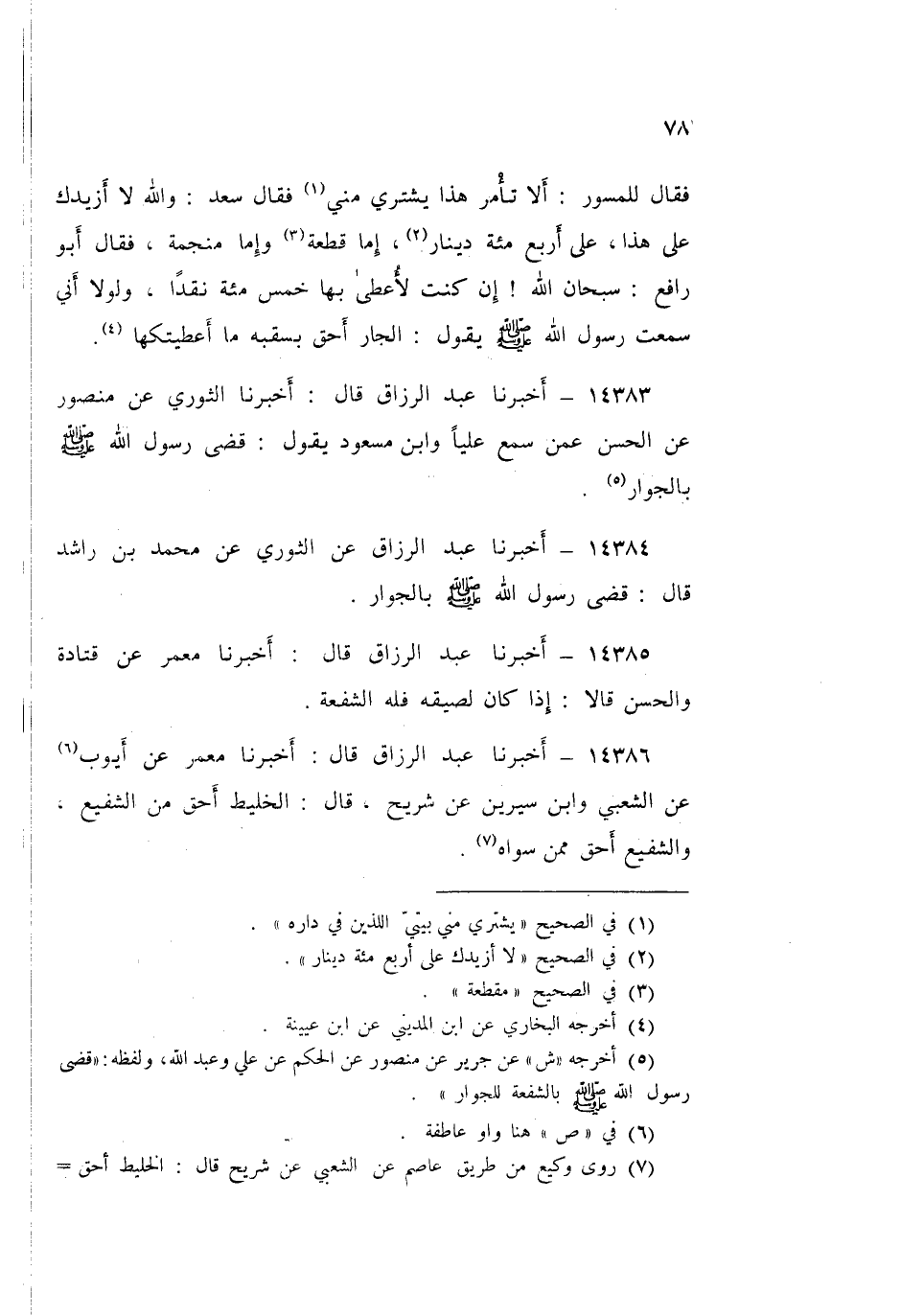 ١٤٣٨٤ - أَخْبَرَنَا عَبْدُ الرَّزَّاقِ، عَنِ الثَّوْرِيِّ، عَنْ مُحَمَّدِ بْنِ رَاشِدٍ قَالَ: «قَضَى رَسُولُ اللَّهِ صَلَّى اللهُ عَلَيْهِ وَسَلَّمَ بِالْجِوَارِ»