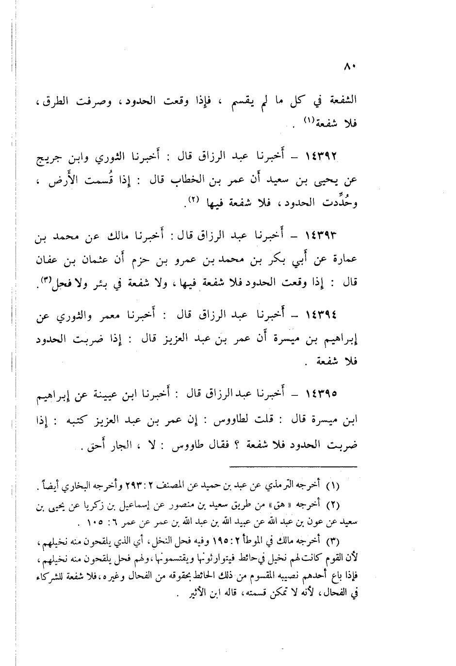 ١٤٣٩٤ - عَبْدُ الرَّزَّاقِ قَالَ: أَخْبَرَنَا مَعْمَرٌ، وَالثَّوْرِيُّ، عَنْ إِبْرَاهِيمَ بْنِ مَيْسَرَةَ، أَنَّ عُمَرَ بْنَ عَبْدِ الْعَزِيزِ قَالَ: «إِذَا ضُرِبَتِ الْحُدُودُ، فَلَا شُفْعَةَ»