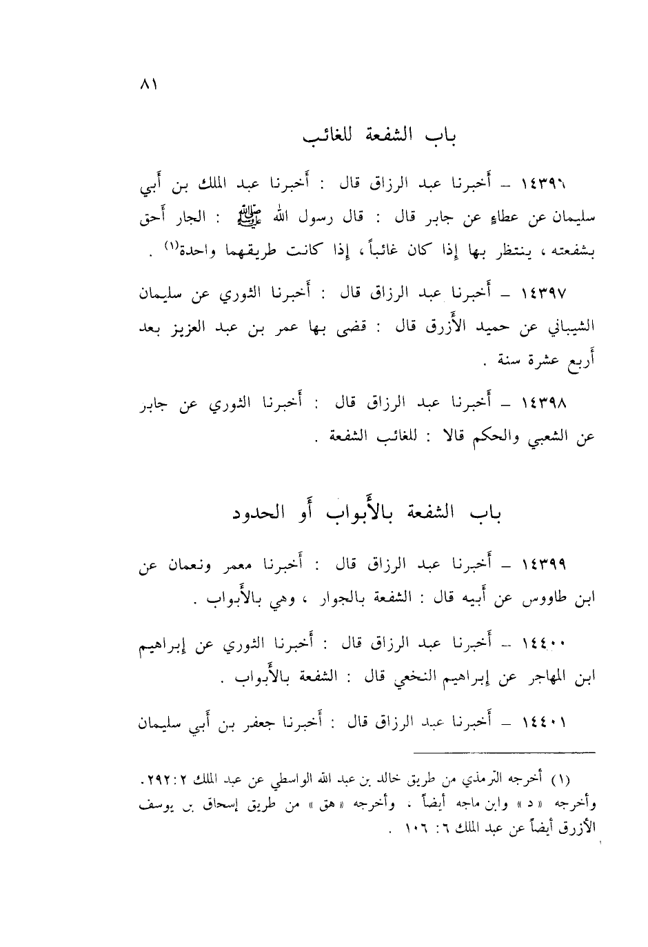 ١٤٤٠٠ - عَبْدُ الرَّزَّاقِ قَالَ: أَخْبَرَنَا الثَّوْرِيُّ، عَنْ إِبْرَاهِيمَ بْنِ الْمُهَاجِرِ، عَنْ إِبْرَاهِيمَ النَّخَعِيِّ قَالَ: «الشُّفْعَةُ بِالْأَبْوَابِ»