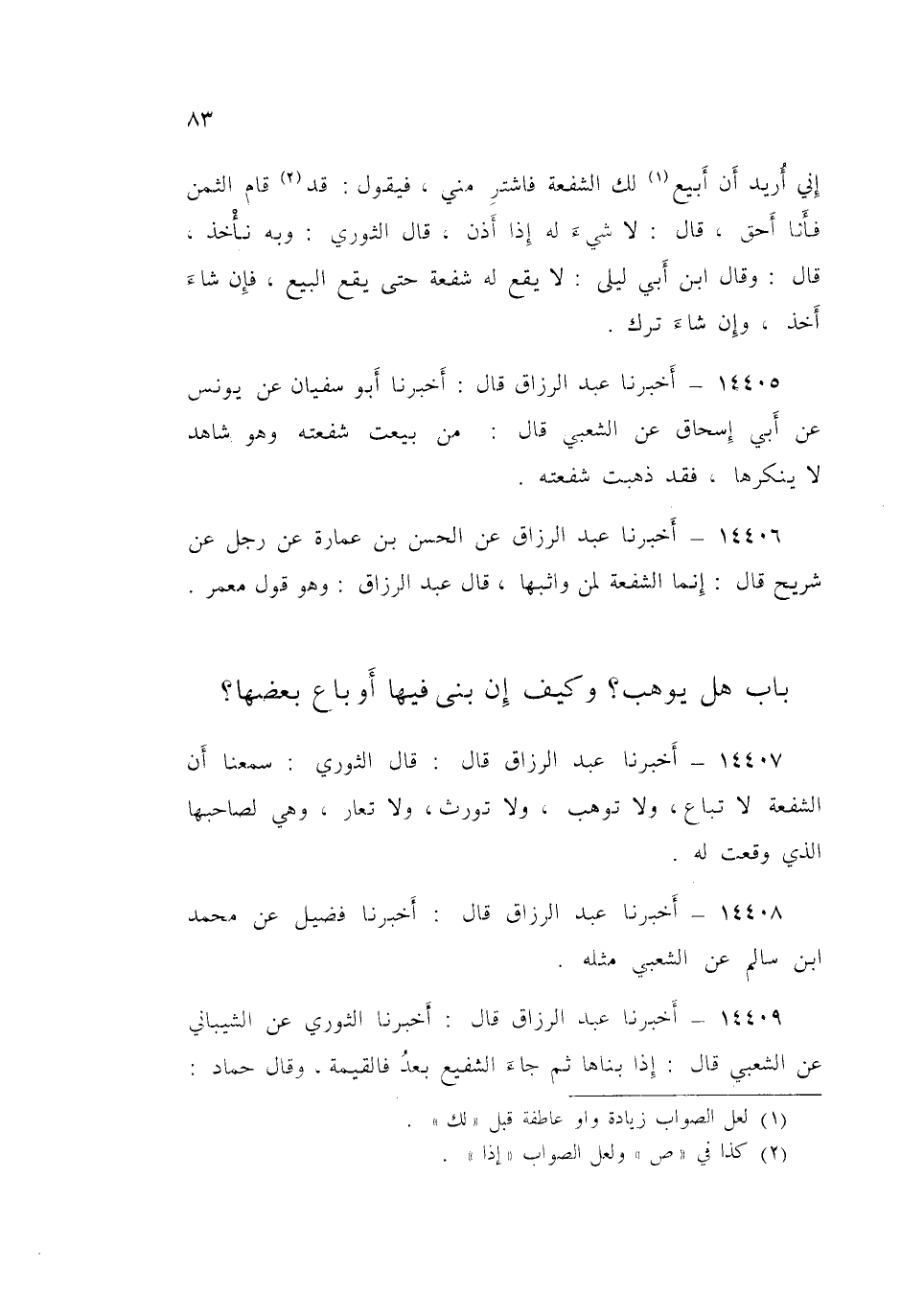 ١٤٤٠٩ - عَبْدُ الرَّزَّاقِ قَالَ: أَخْبَرَنَا الثَّوْرِيُّ، عَنِ الشَّيْبَانِيِّ، عَنِ الشَّعْبِيِّ قَالَ: «إِذَا بَنَاهَا ثُمَّ جَاءَ الشَّفِيعُ بَعْدُ فَالْقِيمَةُ» وَقَالَ حَمَّادٌ: «يُقْلِعُ هَذَا بِنَاءَهُ، وَيَأْخُذُ هَذَا الشُّفْعَةَ مِنَ الْأَرْضِ»، «وَقَولُ حَمَّادٍ أَحَبُّ إِلَى الثَّوْرِيِّ»