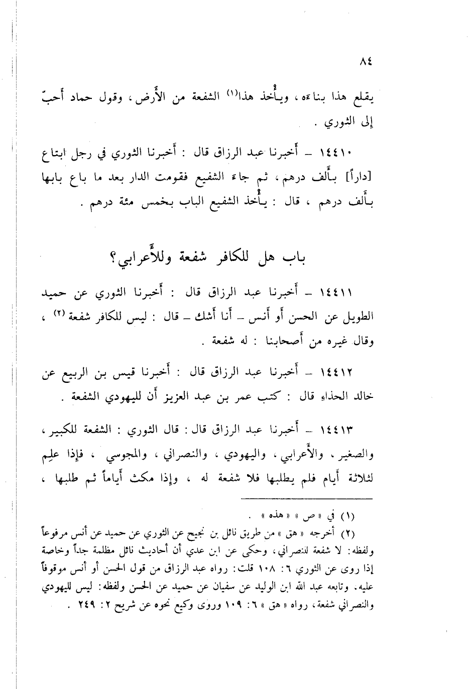 ١٤٤١٤ - عَبْدُ الرَّزَّاقِ قَالَ: أَخْبَرَنَا الثَّوْرِيُّ، عَنْ جَابِرٍ، عَنِ الشَّعْبِيِّ قَالَ: «لَيْسَ لِلْأَعْرَابِيِّ شُفْعَةٌ» وَقَالَ الْحَكَمُ: «لَهُ الشُّفْعَةُ»