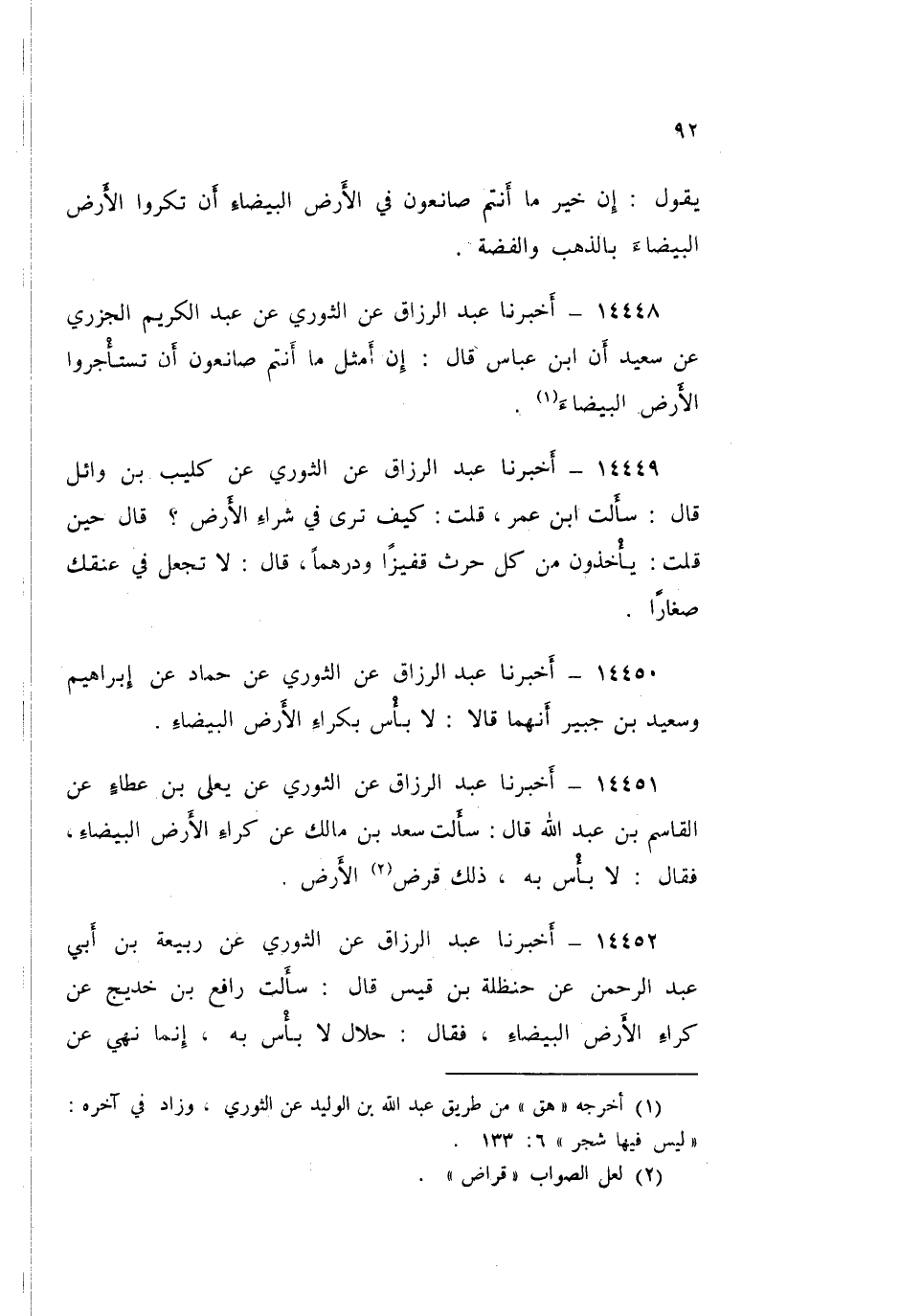 ١٤٤٤٨ - أَخْبَرَنَا عَبْدُ الرَّزَّاقِ، عَنِ الثَّوْرِيِّ، عَنْ عَبْدِ الْكَرِيمِ الْجَزَرِيِّ، عَنْ سَعِيدٍ، أَنَّ ابْنَ عَبَّاسٍ قَالَ: «إِنَّ أَمْثَلَ مَا أَنْتُمْ صَانِعُونَ أَنْ تَسْتَأْجِرُوا الْأَرْضَ الْبَيْضَاءَ»