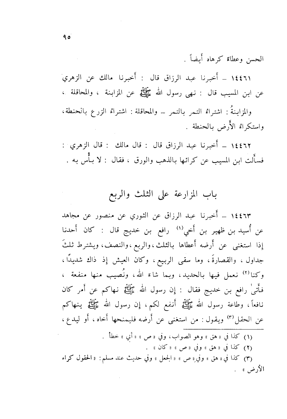 ١٤٤٦٣ - أَخْبَرَنَا عَبْدُ الرَّزَّاقِ قَالَ: عَنِ الثَّوْرِيِّ، عَنْ مَنْصُورٍ، عَنْ مُجَاهِدٍ، عَنْ أُسَيْدِ بْنِ ظَهِيرِ ابْنِ أَخِي رَافِعِ بْنِ خَدِيجٍ قَالَ: كَانَ أَحَدُنَا إِذَا اسْتَغْنَى عَنْ أَرْضِهِ، أَعْطَاهَا بِالثُّلُثِ، وَالرُّبْعِ، وَالنِّصْفِ وَيَشْتَرِطُ ثُلُثَ جَدَاوِلٍ، وَالْقُصَارَةَ، وَمَا سَقَى الرَّبِيعُ، وَكَانَ الْعَيْشُ إِذْ ذَاكَ شَدِيدًا، وَكُنَّا نَعْمَلُ فِيهَا بِالْحَدِيدِ وَبِمَا شَاءَ اللَّهُ، وَنُصِيبُ مِنْهَا مَنْفَعَةً، فَأَتَى رَافِعُ بْنُ خَدِيجٍ فَقَالَ: إِنَّ رَسُولَ اللَّهِ صَلَّى اللهُ عَلَيْهِ وَسَلَّمَ نَهَاكُمْ عَنْ أَمْرٍ كَانَ نَافِعًا، وَطَاعَةُ رَسُولِ اللَّهِ صَلَّى اللهُ عَلَيْهِ وَسَلَّمَ أَنْفَعُ لَكُمْ، إِنَّ رَسُولَ اللَّهِ صَلَّى اللهُ عَلَيْهِ وَسَلَّمَ يَنْهَاكُمْ عَنِ الْحَقْلِ، وَيَقُولُ: «مَنِ اسْتَغْنَى عَنْ أَرْضِهِ فَلْيَمْنَحْهَا أَخَاهُ، أَوْ لِيَدَعْ ⦗٩٦⦘، وَيَنْهَى عَنِ الْمُزَابَنَةِ» وَالْمُزَابَنَةُ أَنْ يَكُونَ الرَّجُلُ لَهُ الْمَالُ الْعَظِيمُ مِنَ النَّخْلِ فَيَأْتِيَهُ الرَّجُلُ فَيَقُولَ: قَدْ أَخَذْتُهُ بِكَذَا وَكَذَا وَسْقًا مِنْ تَمْرٍ "
