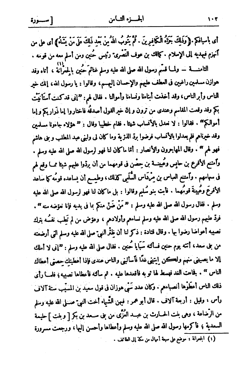 أَيْ بِأَسْيَافِكُمْ. (وَذَلِكَ جَزَاءُ الْكَافِرِينَ. ثُمَّ يَتُوبُ اللَّهُ مِنْ بَعْدِ ذَلِكَ عَلَى مَنْ يَشَاءُ) أَيْ عَلَى مَنِ انْهَزَمَ فَيَهْدِيهِ إِلَى الْإِسْلَامِ. كَمَالِكِ بْنِ عَوْفٍ النَّصْرِيِّ رَئِيسِ حُنَيْنٍ وَمَنْ أسلم معه من قومه. الثانية- وَلَمَّا قَسَمَ رَسُولُ اللَّهِ صَلَّى اللَّهُ عَلَيْهِ وَسَلَّمَ غنائم حنين بالجعرانة «١»، أتاه وفد هو ازن مُسْلِمِينَ رَاغِبِينَ فِي الْعَطْفِ عَلَيْهِمْ وَالْإِحْسَانِ إِلَيْهِمْ، وَقَالُوا: يَا رَسُولَ اللَّهِ، إِنَّكَ خَيْرُ النَّاسِ وَأَبَرُّ النَّاسِ، وَقَدْ أَخَذْتَ أَبْنَاءَنَا وَنِسَاءَنَا وَأَمْوَالَنَا. فَقَالَ لَهُمْ: (إِنِّي قَدْ كُنْتُ اسْتَأْنَيْتُ بِكُمْ وَقَدْ وَقَعَتِ الْمَقَاسِمُ وَعِنْدِي مَنْ تَرَوْنَ وَإِنَّ خَيْرَ الْقَوْلِ أَصْدَقُهُ فَاخْتَارُوا إِمَّا ذَرَارِيَكُمْ وَإِمَّا أَمْوَالَكُمْ (. فَقَالُوا: لَا نَعْدِلُ بِالْأَنْسَابِ شَيْئًا. فَقَامَ خَطِيبًا وَقَالَ:) هَؤُلَاءِ جَاءُونَا مُسْلِمِينَ وَقَدْ خَيَّرْنَاهُمْ فَلَمْ يَعْدِلُوا بِالْأَنْسَابِ فَرَضَوْا بِرَدِّ الذُّرِّيَّةِ وَمَا كَانَ لِي وَلِبَنِي عَبْدِ الْمُطَّلِبِ وَبَنِي هَاشِمٍ فَهُوَ لَهُمْ (. وَقَالَ الْمُهَاجِرُونَ وَالْأَنْصَارُ: أَمَّا مَا كَانَ لَنَا فَهُوَ لِرَسُولِ اللَّهِ صَلَّى اللَّهُ عَلَيْهِ وَسَلَّمَ. وَامْتَنَعَ الْأَقْرَعُ بْنُ حَابِسٍ وَعُيَيْنَةُ بْنُ حِصْنٍ فِي قَوْمِهِمَا مِنْ أَنْ يَرُدُّوا عَلَيْهِمْ شَيْئًا مِمَّا وَقَعَ لَهُمْ فِي سِهَامِهِمْ. وَامْتَنَعَ الْعَبَّاسُ بْنُ مِرْدَاسٍ السُّلَمِيُّ كَذَلِكَ، وَطَمِعَ أَنْ يُسَاعِدَهُ قَوْمُهُ كَمَا سَاعَدَ الْأَقْرَعَ وَعُيَيْنَةَ قَوْمُهُمَا. فَأَبَتْ بَنُو سُلَيْمٍ وَقَالُوا: بَلْ مَا كَانَ لَنَا فَهُوَ لِرَسُولِ اللَّهِ صَلَّى اللَّهُ عَلَيْهِ وَسَلَّمَ. فَقَالَ رَسُولُ اللَّهِ صَلَّى اللَّهُ عَلَيْهِ وَسَلَّمَ: (مَنْ ضَنَّ مِنْكُمْ بِمَا فِي يَدَيْهِ فَإِنَّا نُعَوِّضُهُ مِنْهُ). فَرَدَّ عَلَيْهِمْ رَسُولُ اللَّهِ صَلَّى اللَّهُ عَلَيْهِ وَسَلَّمَ نساء هم وَأَوْلَادَهُمْ، وَعَوَّضَ مَنْ لَمْ تَطِبْ نَفْسُهُ بِتَرْكِ نَصِيبِهِ أَعْوَاضًا رَضَوْا بِهَا. وَقَالَ قَتَادَةُ: ذُكِرَ لَنَا أَنَّ ظِئْرَ النَّبِيِّ صَلَّى اللَّهُ عَلَيْهِ وَسَلَّمَ الَّتِي أَرْضَعَتْهُ مِنْ بَنِي سَعْدٍ أَتَتْهُ يَوْمَ حُنَيْنٍ فَسَأَلَتْهُ سَبَايَا حُنَيْنٍ. فَقَالَ صَلَّى اللَّهُ عَلَيْهِ وَسَلَّمَ: (إِنِّي لَا أَمْلِكُ إِلَّا مَا يُصِيبُنِي مِنْهُمْ وَلَكِنِ ايِتِينِي غَدًا فَاسْأَلِينِي وَالنَّاسُ عِنْدِي فَإِذَا أَعْطَيْتُكِ حِصَّتِي أَعْطَاكِ النَّاسُ). فجاءت الغد فبسط لها ثوبه فأقعد ها عَلَيْهِ. ثُمَّ سَأَلَتْهُ فَأَعْطَاهَا نَصِيبَهُ فَلَمَّا رَأَى ذلك الناس أعطوها أنصباء هم. وكان عدد سبي هو زان فِي قَوْلِ سَعِيدِ بْنِ الْمُسَيَّبِ سِتَّةَ آلَافِ رَأْسٍ. وَقِيلَ: أَرْبَعَةُ آلَافٍ قَالَ أَبُو عُمَرَ: فِيهِنَّ الشَّيْمَاءُ أُخْتُ النَّبِيِّ صَلَّى اللَّهُ عَلَيْهِ وَسَلَّمَ مِنَ الرَّضَاعَةِ، وَهِيَ بِنْتُ الْحَارِثِ بْنِ عَبْدِ الْعُزَّى مِنْ بَنِي سَعْدِ بْنِ بَكْرٍ [وَبِنْتُ] حَلِيمَةَ السَّعْدِيَّةِ، فَأَكْرَمَهَا رَسُولُ اللَّهِ صَلَّى اللَّهُ عَلَيْهِ وَسَلَّمَ وَأَعْطَاهَا وَأَحْسَنَ إِلَيْهَا، وَرَجَعَتْ مسرورة