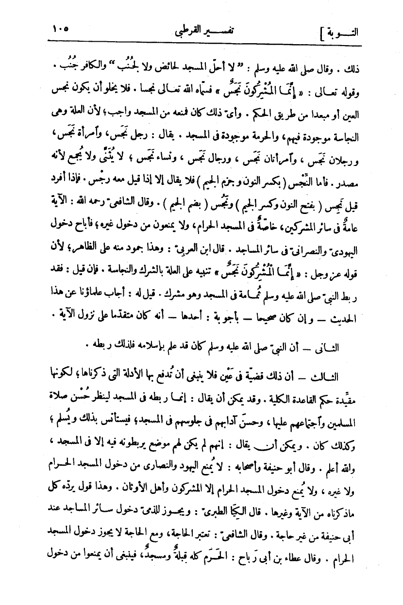 ذَلِكَ. وَقَالَ صَلَّى اللَّهُ عَلَيْهِ وَسَلَّمَ: (لَا أُحِلُّ الْمَسْجِدَ لِحَائِضٍ وَلَا لِجُنُبٍ) وَالْكَافِرُ جُنُبٌ. وَقَوْلُهُ تَعَالَى:" إِنَّمَا الْمُشْرِكُونَ نَجَسٌ" فَسَمَّاهُ اللَّهُ تَعَالَى نَجَسًا. فَلَا يَخْلُو أَنْ يَكُونَ نَجَسَ الْعَيْنِ أَوْ مُبْعَدًا مِنْ طَرِيقِ الْحُكْمِ. وَأَيُّ ذَلِكَ كَانَ فَمَنْعُهُ مِنَ الْمَسْجِدِ وَاجِبٌ لِأَنَّ الْعِلَّةَ وَهِيَ النَّجَاسَةُ مَوْجُودَةٌ فِيهِمْ، وَالْحُرْمَةُ مَوْجُودَةٌ فِي الْمَسْجِدِ. يُقَالُ: رَجُلٌ نَجَسٌ، وَامْرَأَةٌ نَجَسٌ، وَرَجُلَانِ نَجَسٌ، وَامْرَأَتَانِ نَجَسٌ، وَرِجَالٌ نَجَسٌ، وَنِسَاءٌ نَجَسٌ، لَا يُثَنَّى وَلَا يُجْمَعُ لِأَنَّهُ مَصْدَرٌ. فَأَمَّا النِّجْسُ (بِكَسْرِ النُّونِ وَجَزْمِ الْجِيمِ) فَلَا يُقَالُ إِلَّا إِذَا قِيلَ مَعَهُ رِجْسٌ. فَإِذَا أُفْرِدَ قِيلَ نَجِسٌ (بِفَتْحِ النُّونِ وَكَسْرِ الْجِيمِ) وَنَجُسٌ (بِضَمِّ الْجِيمِ). وَقَالَ الشَّافِعِيُّ رَحِمَهُ اللَّهُ: الْآيَةُ عَامَّةٌ فِي سَائِرِ الْمُشْرِكِينَ، خَاصَّةً فِي الْمَسْجِدِ الْحَرَامِ، وَلَا يُمْنَعُونَ مِنْ دُخُولِ غَيْرِهِ، فَأَبَاحَ دُخُولَ الْيَهُودِيِّ وَالنَّصْرَانِيِّ فِي سَائِرِ الْمَسَاجِدِ. قَالَ ابْنُ الْعَرَبِيِّ: وَهَذَا جُمُودٌ مِنْهُ عَلَى الظَّاهِرِ، لِأَنَّ قَوْلَهُ عَزَّ وَجَلَّ:" إِنَّمَا الْمُشْرِكُونَ نَجَسٌ" تَنْبِيهٌ عَلَى الْعِلَّةِ بِالشِّرْكِ وَالنَّجَاسَةِ. فَإِنْ قِيلَ: فَقَدْ رَبَطَ النَّبِيُّ صَلَّى اللَّهُ عَلَيْهِ وَسَلَّمَ ثُمَامَةَ فِي الْمَسْجِدِ وَهُوَ مُشْرِكٌ. قِيلَ لَهُ: أَجَابَ عُلَمَاؤُنَا عَنْ هَذَا الْحَدِيثِ- وَإِنْ كَانَ صَحِيحًا- بِأَجْوِبَةٍ: أَحَدُهَا- أَنَّهُ كَانَ مُتَقَدِّمًا عَلَى نُزُولِ الْآيَةِ. الثَّانِي- أَنَّ النَّبِيَّ صَلَّى اللَّهُ عَلَيْهِ وَسَلَّمَ كَانَ قَدْ عَلِمَ بِإِسْلَامِهِ فَلِذَلِكَ رَبَطَهُ. الثَّالِثُ- أَنَّ ذَلِكَ قَضِيَّةٌ فِي عَيْنٍ فَلَا يَنْبَغِي أَنْ تُدْفَعَ بِهَا الْأَدِلَّةُ الَّتِي ذَكَرْنَاهَا، لِكَوْنِهَا مُقَيِّدَةً حُكْمَ الْقَاعِدَةِ الْكُلِّيَّةِ. وَقَدْ يُمْكِنُ أَنْ يُقَالَ: إِنَّمَا رَبَطَهُ فِي الْمَسْجِدِ لِيَنْظُرَ حُسْنَ صَلَاةِ الْمُسْلِمِينَ وَاجْتِمَاعَهُمْ عَلَيْهَا، وحسن آدا بهم فِي جُلُوسِهِمْ فِي الْمَسْجِدِ، فَيَسْتَأْنِسُ بِذَلِكَ وَيُسْلِمُ، وَكَذَلِكَ كَانَ. وَيُمْكِنُ أَنْ يُقَالَ: إِنَّهُمْ لَمْ يَكُنْ لَهُمْ مَوْضِعٌ يَرْبِطُونَهُ فِيهِ إِلَّا فِي الْمَسْجِدِ، وَاللَّهُ أَعْلَمُ. وَقَالَ أَبُو حَنِيفَةَ وَأَصْحَابُهُ: لَا يُمْنَعُ الْيَهُودُ وَالنَّصَارَى مِنْ دُخُولِ الْمَسْجِدِ الْحَرَامِ وَلَا غَيْرِهِ، وَلَا يُمْنَعُ دُخُولُ الْمَسْجِدِ الْحَرَامِ إِلَّا الْمُشْرِكُونَ وَأَهْلُ الْأَوْثَانِ. وَهَذَا قَوْلٌ يَرُدُّهُ كُلُّ مَا ذَكَرْنَاهُ مِنَ الْآيَةِ وَغَيْرِهَا. قَالَ الْكِيَا الطَّبَرِيُّ: وَيَجُوزُ لِلذِّمِّيِّ دُخُولُ سَائِرِ الْمَسَاجِدِ عِنْدَ أَبِي حَنِيفَةَ مِنْ غَيْرِ حَاجَةٍ. وقال الشافعي: تعتبر الحاجة، ومع الْحَاجَةِ لَا يَجُوزُ دُخُولُ الْمَسْجِدِ الْحَرَامِ. وَقَالَ عَطَاءُ بْنُ أَبِي رَبَاحٍ: الْحَرَمُ كُلُّهُ قِبْلَةٌ وَمَسْجِدٌ، فَيَنْبَغِي أَنْ يُمْنَعُوا مِنْ دُخُولِ