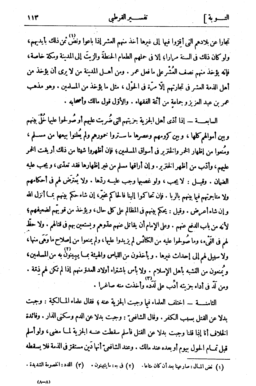 تُجَّارًا عَنْ بِلَادِهِمُ الَّتِي أُقِرُّوا فِيهَا إِلَى غير ها أُخِذَ مِنْهُمُ الْعُشْرُ إِذَا بَاعُوا وَنَضَّ «١» ثَمَنُ ذَلِكَ بِأَيْدِيهِمْ وَلَوْ كَانَ ذَلِكَ فِي السَّنَةِ مِرَارًا إِلَّا فِي حَمْلِهِمُ الطَّعَامَ الْحِنْطَةَ وَالزَّيْتَ إِلَى الْمَدِينَةِ وَمَكَّةَ خَاصَّةً، فَإِنَّهُ يُؤْخَذُ مِنْهُمْ نِصْفُ الْعُشْرِ عَلَى مَا فَعَلَ عُمَرُ. وَمِنْ أَهْلِ الْمَدِينَةِ مَنْ لَا يَرَى أَنْ يُؤْخَذَ مِنْ أَهْلِ الذِّمَّةِ الْعُشْرُ فِي تِجَارَتِهِمْ إِلَّا مَرَّةً فِي الْحَوْلِ، مِثْلَ مَا يُؤْخَذُ مِنَ الْمُسْلِمِينَ. وَهُوَ مَذْهَبُ عُمَرَ بْنِ عَبْدِ الْعَزِيزِ وَجَمَاعَةٍ مِنْ أَئِمَّةِ الْفُقَهَاءِ. وَالْأَوَّلُ قَوْلُ مَالِكٍ وَأَصْحَابِهِ. السَّابِعَةُ- إِذَا أَدَّى أَهْلُ الْجِزْيَةِ جِزْيَتَهُمْ الَّتِي ضُرِبَتْ عَلَيْهِمْ أَوْ صُولِحُوا عَلَيْهَا خُلِّيَ بينهم وبين أموالهم كلها، وبين كرومهم وعصر ها ما ستروا خمور هم وَلَمْ يُعْلِنُوا بَيْعَهَا مِنْ مُسْلِمٍ وَمُنِعُوا مِنْ إِظْهَارِ الْخَمْرِ وَالْخِنْزِيرِ فِي أَسْوَاقِ الْمُسْلِمِينَ، فَإِنْ أَظْهَرُوا شَيْئًا مِنْ ذَلِكَ أُرِيقَتِ الْخَمْرُ عَلَيْهِمْ، وَأُدِّبَ مَنْ أَظْهَرَ الْخِنْزِيرَ. وَإِنْ أَرَاقَهَا مُسْلِمٌ مِنْ غَيْرِ إِظْهَارِهَا فَقَدْ تَعَدَّى، وَيَجِبُ عَلَيْهِ الضَّمَانُ. وَقِيلَ: لَا يَجِبُ وَلَوْ غَصَبَهَا وَجَبَ عَلَيْهِ رَدُّهَا. وَلَا يُعْتَرَضُ لَهُمْ فِي أَحْكَامِهِمْ وَلَا مُتَاجَرَتِهِمْ فِيمَا بَيْنَهُمْ بِالرِّبَا. فَإِنْ تَحَاكَمُوا إِلَيْنَا فَالْحَاكِمُ مُخَيَّرٌ، إِنْ شَاءَ حَكَمَ بَيْنَهُمْ بِمَا أَنْزَلَ اللَّهُ وَإِنْ شَاءَ أَعْرَضَ. وَقِيلَ: يَحْكُمُ بَيْنَهُمْ فِي الْمَظَالِمِ عَلَى كُلِّ حَالٍ، وَيُؤْخَذُ مِنْ قَوِيِّهِمْ لِضَعِيفِهِمْ، لِأَنَّهُ مِنْ بَابِ الدَّفْعِ عَنْهُمْ وَعَلَى الْإِمَامِ أَنْ يُقَاتِلَ عَنْهُمْ عدو هم وَيَسْتَعِينَ بِهِمْ فِي قِتَالِهِمْ. وَلَا حَظَّ لَهُمْ فِي الْفَيْءِ، وَمَا صُولِحُوا عَلَيْهِ مِنَ الْكَنَائِسِ لَمْ يَزِيدُوا عَلَيْهَا، وَلَمْ يُمْنَعُوا مِنْ إِصْلَاحٍ مَا وَهَى مِنْهَا، وَلَا سَبِيلَ لَهُمْ إِلَى إِحْدَاثِ غَيْرِهَا. وَيَأْخُذُونَ مِنَ اللِّبَاسِ وَالْهَيْئَةِ بِمَا يَبِينُونَ «٢» بِهِ مِنَ الْمُسْلِمِينَ، وَيُمْنَعُونَ مِنَ التَّشَبُّهِ بِأَهْلِ الْإِسْلَامِ. وَلَا بَأْسَ بِاشْتِرَاءِ أَوْلَادِ الْعَدُوِّ مِنْهُمْ إِذَا لَمْ تَكُنْ لَهُمْ ذِمَّةٌ. وَمَنْ لَدَّ فِي أَدَاءِ جِزْيَتِهِ أُدِّبَ عَلَى لَدَدِهِ «٣» وَأُخِذَتْ مِنْهُ صَاغِرًا. الثَّامِنَةُ- اخْتَلَفَ الْعُلَمَاءُ فِيمَا وَجَبَتِ الْجِزْيَةُ عَنْهُ، فَقَالَ عُلَمَاءُ الْمَالِكِيَّةِ: وَجَبَتْ بَدَلًا عَنِ الْقَتْلِ بِسَبَبِ الْكُفْرِ. وَقَالَ الشَّافِعِيُّ: وَجَبَتْ بَدَلًا عَنِ الدَّمِ وَسُكْنَى الدَّارِ. وَفَائِدَةُ الْخِلَافِ أَنَّا إِذَا قُلْنَا وَجَبَتْ بَدَلًا عَنِ الْقَتْلِ فَأَسْلَمَ سَقَطَتْ عَنْهُ الْجِزْيَةُ لِمَا مَضَى، وَلَوْ أَسْلَمَ قَبْلَ تَمَامِ الْحَوْلِ بِيَوْمٍ أَوْ بَعْدَهُ عِنْدَ مَالِكٍ. وَعِنْدَ الشَّافِعِيِّ أَنَّهَا دَيْنٌ مستقر في الذمة فلا يسقطه