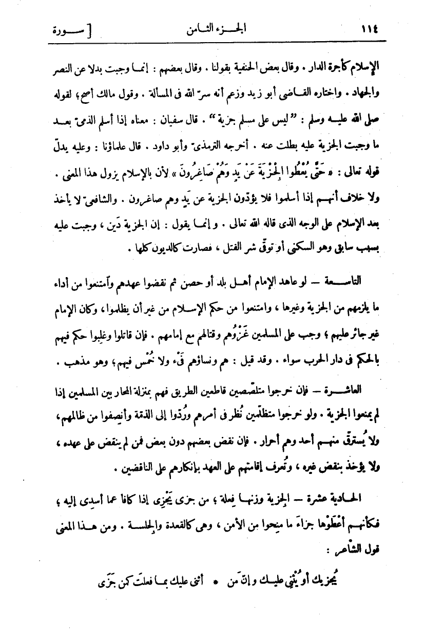 الْإِسْلَامُ كَأُجْرَةِ الدَّارِ. وَقَالَ بَعْضُ الْحَنَفِيَّةِ بِقَوْلِنَا. وَقَالَ بَعْضُهُمْ: إِنَّمَا وَجَبَتْ بَدَلًا عَنِ النَّصْرِ وَالْجِهَادِ. وَاخْتَارَهُ الْقَاضِي أَبُو زَيْدٍ وَزَعَمَ أَنَّهُ سِرُّ اللَّهِ فِي الْمَسْأَلَةِ. وَقَوْلُ مَالِكٍ أَصَحُّ، لِقَوْلِهِ صَلَّى اللَّهُ عَلَيْهِ وَسَلَّمَ: (لَيْسَ عَلَى مُسْلِمٍ جِزْيَةٌ). قَالَ سُفْيَانُ: مَعْنَاهُ إِذَا أَسْلَمَ الذِّمِّيُّ بَعْدَ مَا وَجَبَتِ الْجِزْيَةُ عَلَيْهِ بَطَلَتْ عَنْهُ. أَخْرَجَهُ التِّرْمِذِيُّ وَأَبُو دَاوُدَ. قَالَ عُلَمَاؤُنَا: وَعَلَيْهِ يَدُلُّ قَوْلُهُ تَعَالَى:" حَتَّى يُعْطُوا الْجِزْيَةَ عَنْ يَدٍ وَهُمْ صاغِرُونَ" لِأَنَّ بِالْإِسْلَامِ يَزُولُ هَذَا الْمَعْنَى. وَلَا خِلَافَ أَنَّهُمْ إِذَا أَسْلَمُوا فَلَا يُؤَدُّونَ الْجِزْيَةَ عَنْ يَدٍ وَهُمْ صَاغِرُونَ. وَالشَّافِعِيُّ لَا يَأْخُذُ بَعْدَ الْإِسْلَامِ عَلَى الْوَجْهِ الَّذِي قَالَهُ اللَّهُ تَعَالَى. وَإِنَّمَا يَقُولُ: إِنَّ الْجِزْيَةَ دَيْنٌ، وَجَبَتْ عَلَيْهِ بِسَبَبٍ سَابِقٍ وَهُوَ السُّكْنَى أَوْ تَوَقِّي شَرِّ الْقَتْلِ، فَصَارَتْ كَالدُّيُونِ كُلِّهَا. التَّاسِعَةُ- لَوْ عَاهَدَ الْإِمَامُ أَهْلَ بَلَدٍ أَوْ حِصْنٍ ثُمَّ نَقَضُوا عَهْدَهُمْ وَامْتَنَعُوا مِنْ أداء ما يلزمهم من الجزية وغير ها وَامْتَنَعُوا مِنْ حُكْمِ الْإِسْلَامِ مِنْ غَيْرِ أَنْ يُظْلَمُوا وَكَانَ الْإِمَامُ غَيْرَ جَائِرٍ عَلَيْهِمْ وَجَبَ عَلَى الْمُسْلِمِينَ غَزْوُهُمْ وَقِتَالُهُمْ مَعَ إِمَامِهِمْ. فَإِنْ قَاتَلُوا وَغُلِبُوا حَكَمَ فِيهِمْ بِالْحُكْمِ فِي دَارِ الحرب سواء. وقد قيل: هم ونساؤهم في وَلَا خُمُسَ فِيهِمْ، وَهُوَ مَذْهَبٌ. الْعَاشِرَةُ- فَإِنْ خَرَجُوا مُتَلَصِّصِينَ قَاطِعِينَ الطَّرِيقَ فَهُمْ بِمَنْزِلَةِ الْمُحَارِبِينَ الْمُسْلِمِينَ إِذَا لَمْ يَمْنَعُوا الْجِزْيَةَ. وَلَوْ خَرَجُوا متظلمين نظر في أمر هم وَرُدُّوا إِلَى الذِّمَّةِ وَأُنْصِفُوا مِنْ ظَالِمِهِمْ وَلَا يُسْتَرَقُّ مِنْهُمْ أَحَدٌ وَهُمْ أَحْرَارٌ. فَإِنْ نَقَضَ بَعْضُهُمْ دُونَ بَعْضٍ فَمَنْ لَمْ يَنْقُضْ عَلَى عَهْدِهِ، وَلَا يُؤْخَذُ بِنَقْضِ غَيْرِهِ وَتُعْرَفُ إِقَامَتُهُمْ على العهد بإنكار هم عَلَى النَّاقِضِينَ. الْحَادِيَةَ عَشْرَةَ- الْجِزْيَةُ وَزْنُهَا فِعْلَةٌ، مِنْ جَزَى يَجْزِي إِذَا كَافَأَ عَمَّا أُسْدِيَ إِلَيْهِ، فَكَأَنَّهُمْ أَعْطَوْهَا جَزَاءَ مَا مُنِحُوا مِنَ الْأَمْنِ، وَهِيَ كَالْقِعْدَةِ وَالْجِلْسَةِ. وَمِنْ هَذَا الْمَعْنَى قَوْلُ الشَّاعِرِ: