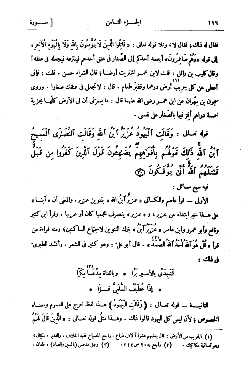 فيه سبع مسائل: الاولى- قَرَأَ عَاصِمٌ وَالْكِسَائِيُّ" عُزَيْرٌ ابْنُ اللَّهِ" بِتَنْوِينِ عُزَيْرٌ. وَالْمَعْنَى أَنَّ" ابْنًا" عَلَى هَذَا خَبَرُ ابْتِدَاءٍ عَنْ عُزَيْرٌ وَ" عُزَيْرٌ" يَنْصَرِفُ عَجَمِيًّا كَانَ أَوْ عَرَبِيًّا. وَقَرَأَ ابْنُ كَثِيرٍ وَنَافِعٌ وَأَبُو عَمْرٍو وَابْنُ عَامِرٍ" عُزَيْرُ ابْنُ" بِتَرْكِ التَّنْوِينِ لِاجْتِمَاعِ السَّاكِنَيْنِ، وَمِنْهُ قِرَاءَةُ مَنْ قَرَأَ" قل هو الله أحد الله الصمد" «٢» [الإخلاص: ٢ - ١]. قَالَ أَبُو عَلِيٍّ: وَهُوَ كَثِيرٌ فِي الشِّعْرِ. وَأَنْشَدَ الطَّبَرِيُّ فِي ذَلِكَ: