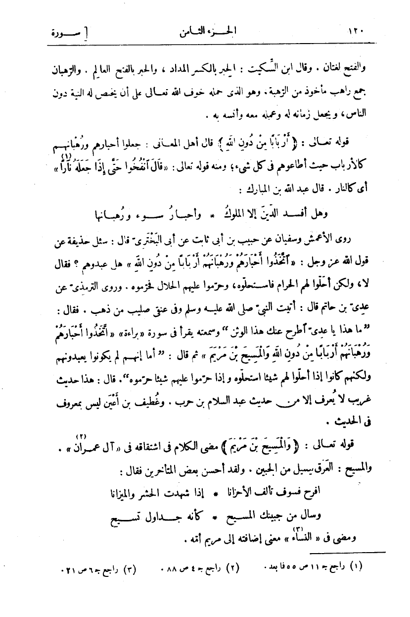 رَوَى الْأَعْمَشُ وَسُفْيَانُ عَنْ حَبِيبِ بْنِ أَبِي ثَابِتٍ عَنْ أَبَى الْبَخْتَرِيِّ قَالَ: سُئِلَ حُذَيْفَةُ عَنْ قَوْلِ اللَّهِ عَزَّ وَجَلَّ:" اتَّخَذُوا أَحْبارَهُمْ وَرُهْبانَهُمْ أَرْباباً مِنْ دُونِ اللَّهِ" هَلْ عبد وهم؟ فَقَالَ لَا، وَلَكِنْ أَحَلُّوا لَهُمُ الْحَرَامَ فَاسْتَحَلُّوهُ، وَحَرَّمُوا عَلَيْهِمُ الْحَلَالَ فَحَرَّمُوهُ. وَرَوَى التِّرْمِذِيُّ عَنْ عَدِيِّ بْنِ حَاتِمٍ قَالَ: أَتَيْتُ النَّبِيَّ صَلَّى اللَّهُ عَلَيْهِ وَسَلَّمَ وَفِي عُنُقِي صَلِيبٌ مِنْ ذَهَبٍ. فَقَالَ: (مَا هَذَا يَا عَدِيُّ اطْرَحْ عَنْكَ هَذَا الْوَثَنَ) وَسَمِعْتُهُ يَقْرَأُ فِي سُورَةِ" بَرَاءَةٌ"" اتَّخَذُوا أَحْبارَهُمْ وَرُهْبانَهُمْ أَرْباباً مِنْ دُونِ اللَّهِ وَالْمَسِيحَ ابْنَ مَرْيَمَ" ثُمَّ قَالَ: (أَمَا إنهم لم يكونوا يعبد ونهم وَلَكِنَّهُمْ كَانُوا إِذَا أَحَلُّوا لَهُمْ شَيْئًا اسْتَحَلُّوهُ وَإِذَا حَرَّمُوا عَلَيْهِمْ شَيْئًا حَرَّمُوهُ). قَالَ: هَذَا حَدِيثٌ غَرِيبٌ لَا يُعْرَفُ إِلَّا مِنْ حَدِيثِ عَبْدِ السَّلَامِ بْنِ حَرْبٍ. وَغُطَيْفُ بْنُ أَعْيَنَ لَيْسَ بِمَعْرُوفٍ فِي الْحَدِيثِ. قَوْلُهُ تَعَالَى: (وَالْمَسِيحَ ابْنَ مَرْيَمَ) مَضَى الْكَلَامُ فِي اشْتِقَاقِهِ فِي [آلِ عِمْرَانَ «٢»]. وَالْمَسِيحُ: الْعَرَقُ يَسِيلُ مِنَ الْجَبِينِ. وَلَقَدْ أَحْسَنَ بَعْضُ الْمُتَأَخِّرِينَ فَقَالَ: