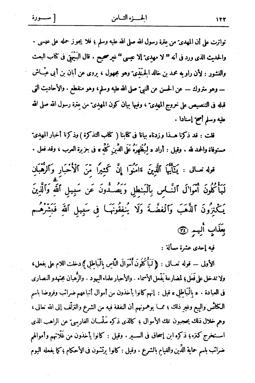 تَوَاتَرَتْ عَلَى أَنَّ الْمَهْدِيَّ مِنْ عِتْرَةِ رَسُولِ اللَّهِ صَلَّى اللَّهُ عَلَيْهِ وَسَلَّمَ، فَلَا يَجُوزُ حَمْلُهُ عَلَى عِيسَى. وَالْحَدِيثُ الَّذِي وَرَدَ فِي أَنَّهُ (لَا مَهْدِيَّ إِلَّا عِيسَى) غَيْرُ صَحِيحٍ. قَالَ الْبَيْهَقِيُّ فِي كِتَابِ الْبَعْثِ وَالنُّشُورِ: لِأَنَّ رَاوِيَهُ مُحَمَّدُ بْنُ خَالِدٍ الْجُنْدِيُّ وَهُوَ مَجْهُولٌ، يَرْوِي عَنْ أَبَانِ بْنِ أَبِي عَيَّاشٍ- وَهُوَ مَتْرُوكٌ- عَنِ الْحَسَنِ عَنِ النَّبِيِّ صَلَّى اللَّهُ عَلَيْهِ وَسَلَّمَ، وَهُوَ مُنْقَطِعٌ. وَالْأَحَادِيثُ الَّتِي قَبْلَهُ فِي التَّنْصِيصِ عَلَى خُرُوجِ الْمَهْدِيِّ، وَفِيهَا بَيَانُ كَوْنِ الْمَهْدِيِّ مِنْ عِتْرَةِ رَسُولِ اللَّهِ صَلَّى اللَّهُ عَلَيْهِ وَسَلَّمَ أَصَحُّ إِسْنَادًا. قُلْتُ: قَدْ ذَكَرْنَا هَذَا وَزِدْنَاهُ بَيَانًا فِي كِتَابِنَا (كِتَابِ التَّذْكِرَةِ) وَذَكَرْنَا أَخْبَارَ الْمَهْدِيِّ مُسْتَوْفَاةً وَالْحَمْدُ لِلَّهِ. وَقِيلَ: أَرَادَ" لِيُظْهِرَهُ عَلَى الدِّينِ كُلِّهِ" فِي جزيرة العرب، وقد فعل.