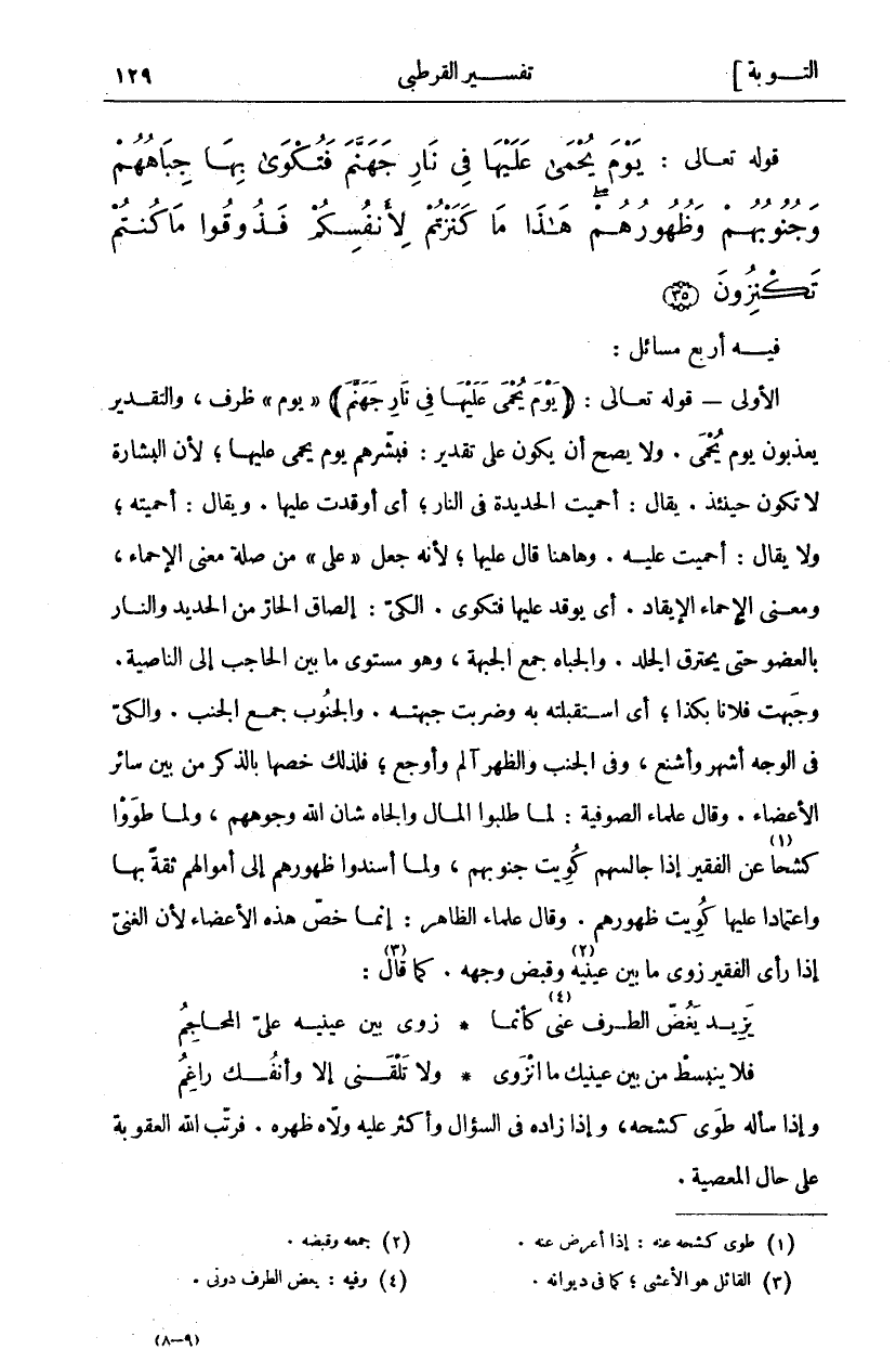 فِيهِ أَرْبَعُ مَسَائِلَ: الْأُولَى- قَوْلُهُ تَعَالَى: (يَوْمَ يُحْمى عَلَيْها فِي نارِ جَهَنَّمَ) " يَوْمَ" ظَرْفٌ، وَالتَّقْدِيرُ يُعَذَّبُونَ يَوْمَ يُحْمَى. وَلَا يَصِحُّ أَنْ يَكُونَ عَلَى تقدير: فبشر هم يَوْمَ يُحْمَى عَلَيْهَا، لِأَنَّ الْبِشَارَةَ لَا تَكُونُ حِينَئِذٍ. يُقَالُ: أَحْمَيْتُ الْحَدِيدَةَ فِي النَّارِ، أَيْ أَوْقَدْتُ عَلَيْهَا. وَيُقَالُ: أَحْمَيْتُهُ، وَلَا يُقَالُ: أَحْمَيْتُ عليه. وها هنا قَالَ عَلَيْهَا، لِأَنَّهُ جَعَلَ" عَلَى" مِنْ صِلَةِ مَعْنَى الْإِحْمَاءِ، وَمَعْنَى الْإِحْمَاءِ الْإِيقَادُ. أَيْ يُوقَدُ عَلَيْهَا فَتُكْوَى. الْكَيُّ: إِلْصَاقُ الْحَارِّ مِنَ الْحَدِيدِ وَالنَّارِ بِالْعُضْوِ حَتَّى يَحْتَرِقَ الْجِلْدُ. وَالْجِبَاهُ جَمْعُ الْجَبْهَةِ، وَهُوَ مُسْتَوى مَا بَيْنَ الْحَاجِبِ إِلَى النَّاصِيَةِ. وَجَبَهْتُ فُلَانًا بِكَذَا، أَيِ اسْتَقْبَلْتُهُ بِهِ وَضَرَبْتُ جَبْهَتَهُ. وَالْجُنُوبُ جَمْعُ الْجَنْبِ. وَالْكَيُّ فِي الْوَجْهِ أَشْهَرُ وَأَشْنَعُ، وَفِي الْجَنْبِ وَالظَّهْرِ آلَمُ وَأَوْجَعُ، فَلِذَلِكَ خَصَّهَا بِالذِّكْرِ مِنْ بَيْنِ سَائِرِ الْأَعْضَاءِ. وَقَالَ عُلَمَاءُ الصُّوفِيَّةِ: لَمَّا طَلَبُوا الْمَالَ وَالْجَاهَ شَانَ اللَّهُ وُجُوهَهُمْ، وَلَمَّا طَوَوْا كَشْحًا «١» عَنِ الْفَقِيرِ إِذَا جَالَسَهُمْ كُوِيَتْ جُنُوبُهُمْ، وَلَمَّا أسندوا ظهور هم إِلَى أَمْوَالِهِمْ ثِقَةً بِهَا وَاعْتِمَادًا عَلَيْهَا كُوِيَتْ ظهور هم. وَقَالَ عُلَمَاءُ الظَّاهِرِ: إِنَّمَا خَصَّ هَذِهِ الْأَعْضَاءَ لِأَنَّ الْغَنِيَّ إِذَا رَأَى الْفَقِيرَ زَوَى مَا بَيْنَ عَيْنَيْهِ «٢» وَقَبَضَ وَجْهَهُ. كَمَا قَالَ «٣»: