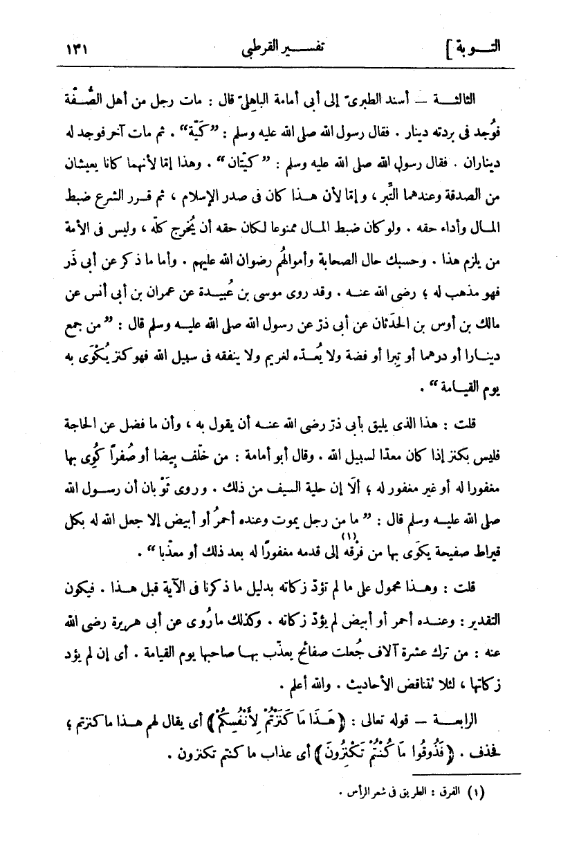 الثَّالِثَةُ- أَسْنَدَ الطَّبَرِيُّ إِلَى أَبِي أُمَامَةَ الْبَاهِلِيِّ قَالَ: مَاتَ رَجُلٌ مِنْ أَهْلِ الصُّفَّةِ فَوُجِدَ فِي بُرْدَتِهِ دِينَارٌ. فَقَالَ رَسُولُ اللَّهِ صَلَّى اللَّهُ عَلَيْهِ وَسَلَّمَ: (كَيَّةٌ). ثُمَّ مَاتَ آخَرُ فَوُجِدَ لَهُ دِينَارَانِ. فَقَالَ رَسُولُ اللَّهِ صَلَّى اللَّهُ عَلَيْهِ وَسَلَّمَ (كَيَّتَانِ). وَهَذَا إِمَّا لِأَنَّهُمَا كَانَا يَعِيشَانِ مِنَ الصَّدَقَةِ وَعِنْدَهُمَا التِّبْرُ، وَإِمَّا لِأَنَّ هَذَا كَانَ فِي صَدْرِ الْإِسْلَامِ، ثُمَّ قَرَّرَ الشَّرْعُ ضَبْطَ الْمَالِ وَأَدَاءَ حَقِّهِ. وَلَوْ كَانَ ضَبْطُ الْمَالِ مَمْنُوعًا لَكَانَ حَقُّهُ أَنْ يُخْرَجَ كُلُّهُ، وَلَيْسَ فِي الْأُمَّةِ مَنْ يُلْزَمُ هَذَا. وَحَسْبُكَ حَالُ الصَّحَابَةِ وَأَمْوَالُهُمْ رِضْوَانُ اللَّهِ عَلَيْهِمْ. وَأَمَّا مَا ذُكِرَ عَنْ أَبِي ذَرٍّ فَهُوَ مَذْهَبٌ لَهُ، رَضِيَ اللَّهُ عَنْهُ. وَقَدْ رَوَى مُوسَى بْنُ عُبَيْدَةَ عَنْ عِمْرَانَ بْنِ أَبِي أَنَسٍ عَنْ مَالِكِ بْنِ أَوْسِ بْنِ الْحَدَثَانِ عَنْ أَبِي ذَرٍّ عَنْ رَسُولِ اللَّهِ صَلَّى اللَّهُ عَلَيْهِ وَسَلَّمَ قَالَ: (مَنْ جَمَعَ دينارا أو در هما أَوْ تِبْرًا أَوْ فِضَّةً وَلَا يَعُدُّهُ لِغَرِيمٍ وَلَا يُنْفِقُهُ فِي سَبِيلِ اللَّهِ فَهُوَ كَنْزٌ يُكْوَى بِهِ يَوْمَ الْقِيَامَةِ (. قُلْتُ: هَذَا الَّذِي يَلِيقُ بِأَبِي ذَرٍّ رَضِيَ اللَّهُ عَنْهُ أَنْ يَقُولَ بِهِ، وَأَنَّ مَا فَضَلَ عَنِ الْحَاجَةِ فَلَيْسَ بِكَنْزٍ إِذَا كَانَ مُعَدًّا لِسَبِيلِ اللَّهِ. وَقَالَ أَبُو أُمَامَةَ: مَنْ خَلَّفَ بِيضًا أَوْ صُفْرًا كُوِيَ بِهَا مَغْفُورًا لَهُ أَوْ غَيْرَ مَغْفُورٍ لَهُ، أَلَا إِنَّ حِلْيَةَ السَّيْفِ مِنْ ذَلِكَ. وَرَوَى ثَوْبَانُ أَنَّ رَسُولَ اللَّهِ صَلَّى اللَّهُ عَلَيْهِ وَسَلَّمَ قَالَ: (مَا مِنْ رَجُلٍ يَمُوتُ وَعِنْدَهُ أَحْمَرُ أَوْ أَبْيَضُ إِلَّا جَعَلَ اللَّهُ لَهُ بِكُلِّ قِيرَاطٍ صَفِيحَةً يُكْوَى بِهَا مِنْ فَرْقِهِ «١» إِلَى قَدَمِهِ مَغْفُورًا لَهُ بَعْدَ ذَلِكَ أَوْ مُعَذَّبًا). قُلْتُ: وَهَذَا مَحْمُولٌ عَلَى مَا لَمْ تُؤَدَّ زَكَاتُهُ بِدَلِيلِ مَا ذَكَرْنَا فِي الْآيَةِ قَبْلَ هَذَا. فَيَكُونُ التَّقْدِيرُ: وَعِنْدَهُ أَحْمَرُ أَوْ أَبْيَضُ لَمْ يُؤَدِّ زَكَاتَهُ. وَكَذَلِكَ مَا رُوِيَ عَنْ أَبِي هُرَيْرَةَ رَضِيَ اللَّهُ عَنْهُ: مَنْ تَرَكَ عَشَرَةَ آلَافٍ جُعِلَتْ صَفَائِحَ يُعَذَّبُ بِهَا صَاحِبُهَا يَوْمَ الْقِيَامَةِ. أَيْ إِنْ لَمْ يُؤَدِّ زَكَاتَهَا، لِئَلَّا تَتَنَاقَضَ الْأَحَادِيثُ. وَاللَّهُ أَعْلَمُ. الرَّابِعَةُ- قَوْلُهُ تَعَالَى: (هَذَا مَا كَنَزْتُمْ لِأَنْفُسِكُمْ) أَيْ يُقَالُ لَهُمْ هَذَا مَا كَنَزْتُمْ، فَحَذَفَ. (فَذُوقُوا مَا كُنْتُمْ تَكْنِزُونَ) أَيْ عَذَابَ ما كنتم تكنزون.