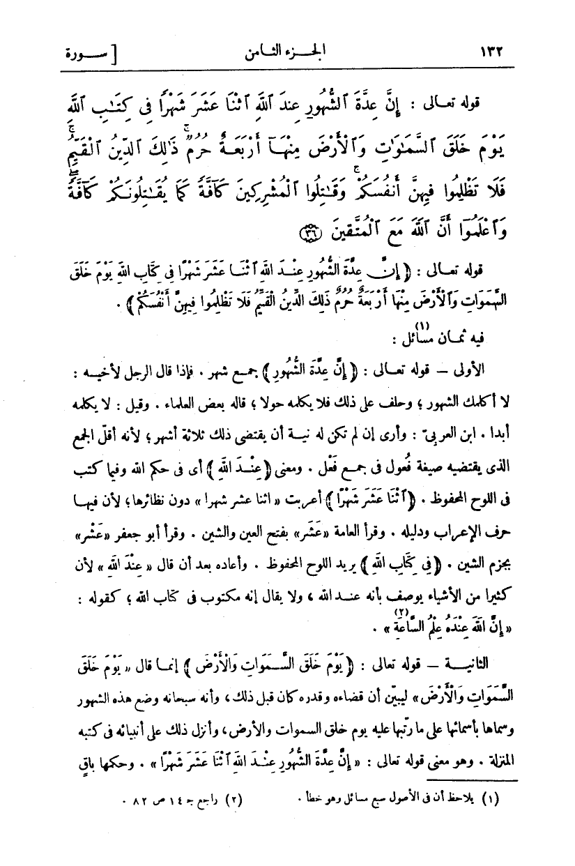 قَوْلُهُ تَعَالَى: (إِنَّ عِدَّةَ الشُّهُورِ عِنْدَ اللَّهِ اثْنا عَشَرَ شَهْراً فِي كِتابِ اللَّهِ يَوْمَ خَلَقَ السَّماواتِ وَالْأَرْضَ مِنْها أَرْبَعَةٌ حُرُمٌ ذلِكَ الدِّينُ الْقَيِّمُ فَلا تَظْلِمُوا فِيهِنَّ أَنْفُسَكُمْ.) فِيهِ ثَمَانِ مَسَائِلَ «١»: الْأُولَى- قَوْلُهُ تَعَالَى: (إِنَّ عِدَّةَ الشُّهُورِ) جَمْعُ شَهْرٍ. فَإِذَا قَالَ الرَّجُلُ لِأَخِيهِ: لَا أُكَلِّمُكَ الشُّهُورَ، وَحَلَفَ عَلَى ذَلِكَ فَلَا يُكَلِّمُهُ حَوْلًا، قَالَهُ بَعْضُ الْعُلَمَاءِ. وَقِيلَ: لَا يُكَلِّمُهُ أَبَدًا. ابْنُ الْعَرَبِيِّ: وَأَرَى إِنْ لَمْ تَكُنْ لَهُ نِيَّةٌ أَنْ يَقْتَضِيَ ذَلِكَ ثَلَاثَةَ أَشْهُرٍ لِأَنَّهُ أَقَلُّ الْجَمْعِ الَّذِي يَقْتَضِيهِ صيغة فعول في جمع فعل. ومعنى (عِنْدَ اللَّهِ) أَيْ فِي حُكْمِ اللَّهِ وَفِيمَا كَتَبَ فِي اللَّوْحِ الْمَحْفُوظِ. (اثْنا عَشَرَ شَهْراً) أعربت" اثْنا عَشَرَ شَهْراً" دون نظائر ها، لِأَنَّ فِيهَا حَرْفَ الْإِعْرَابِ وَدَلِيلَهُ. وَقَرَأَ الْعَامَّةُ" عَشَرَ" بِفَتْحِ الْعَيْنِ وَالشِّينِ. وَقَرَأَ أَبُو جَعْفَرٍ" عَشْرَ" بِجَزْمِ الشِّينِ. (فِي كِتابِ اللَّهِ) يُرِيدُ اللَّوْحَ الْمَحْفُوظَ. وَأَعَادَهُ بَعْدَ أَنْ قَالَ" عِنْدَ اللَّهِ" لِأَنَّ كَثِيرًا مِنَ الْأَشْيَاءِ يُوصَفُ بِأَنَّهُ عِنْدَ اللَّهِ، وَلَا يُقَالُ إِنَّهُ مَكْتُوبٌ فِي كِتَابِ اللَّهِ، كَقَوْلِهِ:" إِنَّ اللَّهَ عِنْدَهُ عِلْمُ السَّاعَةِ" «٢» [لقمان: ٣٤]. الثَّانِيَةُ- قَوْلُهُ تَعَالَى: (يَوْمَ خَلَقَ السَّماواتِ وَالْأَرْضَ) إِنَّمَا قَالَ" يَوْمَ خَلَقَ السَّماواتِ وَالْأَرْضَ" لِيُبَيِّنَ أَنَّ قَضَاءَهُ وَقَدَرَهُ كَانَ قَبْلَ ذَلِكَ، وَأَنَّهُ سُبْحَانَهُ وَضَعَ هَذِهِ الشُّهُورَ وَسَمَّاهَا بِأَسْمَائِهَا عَلَى ما رتبها عليه يوم خلق السموات وَالْأَرْضَ، وَأَنْزَلَ ذَلِكَ عَلَى أَنْبِيَائِهِ فِي كُتُبِهِ الْمُنَزَّلَةِ. وَهُوَ مَعْنَى قَوْلِهِ تَعَالَى:" إِنَّ عِدَّةَ الشُّهُورِ عِنْدَ اللَّهِ اثْنا عَشَرَ شَهْراً". وَحُكْمُهَا باق