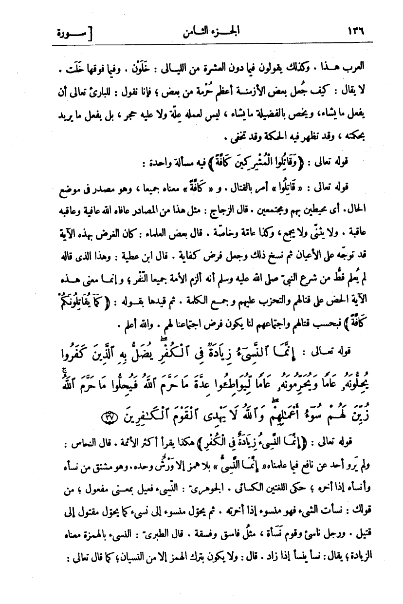 الْعَرَبِ هَذَا. وَكَذَلِكَ يَقُولُونَ فِيمَا دُونَ الْعَشَرَةِ مِنَ اللَّيَالِي: خَلَوْنَ. وَفِيمَا فَوْقَهَا خَلَتْ. لَا يُقَالُ: كَيْفَ جَعَلَ بَعْضَ الْأَزْمِنَةِ أَعْظَمَ حُرْمَةً مِنْ بَعْضٍ، فَإِنَّا نَقُولُ: لِلْبَارِئِ تَعَالَى أَنْ يَفْعَلَ مَا يَشَاءُ، وَيَخُصُّ بِالْفَضِيلَةِ مَا يَشَاءُ، لَيْسَ لِعَمَلِهِ عِلَّةٌ وَلَا عَلَيْهِ حَجْرٌ، بَلْ يَفْعَلُ مَا يُرِيدُ بِحِكْمَتِهِ، وَقَدْ تَظْهَرُ فِيهِ الْحِكْمَةُ وَقَدْ تَخْفَى. قَوْلُهُ تَعَالَى: (وَقاتِلُوا الْمُشْرِكِينَ كَافَّةً) فِيهِ مَسْأَلَةٌ وَاحِدَةٌ: قَوْلُهُ تَعَالَى:" قاتِلُوا" أَمْرٌ بِالْقِتَالِ. وَ" كَافَّةً" مَعْنَاهُ جَمِيعًا، وَهُوَ مَصْدَرٌ فِي مَوْضِعِ الْحَالِ. أَيْ مُحِيطِينَ بِهِمْ وَمُجْتَمِعِينَ. قَالَ الزَّجَّاجُ: مِثْلُ هَذَا مِنَ الْمَصَادِرِ عَافَاهُ اللَّهُ عَافِيَةً وَعَاقَبَهُ عَاقِبَةً. وَلَا يُثَنَّى وَلَا يُجْمَعُ، وَكَذَا عَامَّةً وَخَاصَّةً. قَالَ بَعْضُ العلماء: كان الغرض بهذه الآية قد توجه على الا عيان ثُمَّ نُسِخَ ذَلِكَ وَجُعِلَ فَرْضَ كِفَايَةٍ. قَالَ ابْنُ عَطِيَّةَ: وَهَذَا الَّذِي قَالَهُ لَمْ يُعْلَمْ قَطُّ مِنْ شَرْعِ النَّبِيِّ صَلَّى اللَّهُ عَلَيْهِ وَسَلَّمَ أَنَّهُ أَلْزَمَ الْأُمَّةَ جَمِيعًا النَّفْرَ، وَإِنَّمَا مَعْنَى هَذِهِ الْآيَةِ الْحَضُّ عَلَى قِتَالِهِمْ وَالتَّحَزُّبُ عَلَيْهِمْ وَجَمْعُ الْكَلِمَةِ. ثُمَّ قَيَّدَهَا بِقَوْلِهِ:" كَما يُقاتِلُونَكُمْ كَافَّةً" فَبِحَسَبِ قِتَالِهِمْ وَاجْتِمَاعِهِمْ لَنَا يَكُونُ فرض اجتماعنا لهم. والله أعلم.
