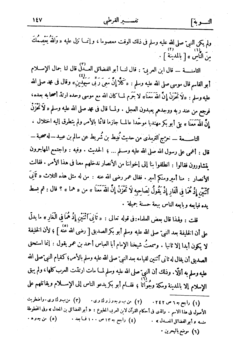 وَلَمْ يَكُنِ النَّبِيِّ صَلَّى اللَّهُ عَلَيْهِ وَسَلَّمَ فِي ذَلِكَ الْوَقْتِ مَعْصُومًا وَإِنَّمَا نَزَلَ عَلَيْهِ" وَاللَّهُ يَعْصِمُكَ مِنَ النَّاسِ" «١» [المائدة: ٦٧] بِالْمَدِينَةِ [«٢». الثَّامِنَةُ- قَالَ ابْنُ الْعَرَبِيِّ: قَالَ لَنَا أَبُو الْفَضَائِلِ الْعَدْلُ «٣» قَالَ لَنَا جَمَالُ الْإِسْلَامِ أَبُو الْقَاسِمِ قَالَ مُوسَى صَلَّى اللَّهُ عَلَيْهِ وَسَلَّمَ:" كَلَّا إِنَّ مَعِي رَبِّي سَيَهْدِينِ" «٤» [الشعراء: ٦٢] وَقَالَ فِي مُحَمَّدٍ صَلَّى اللَّهُ عَلَيْهِ وَسَلَّمَ:" لَا تَحْزَنْ إِنَّ اللَّهَ مَعَنا" لَا جَرَمَ لَمَّا كَانَ اللَّهُ مَعَ مُوسَى وَحْدَهُ ارْتَدَّ أصحابه بعده، فرجع من عند ربه ووجد هم يَعْبُدُونَ الْعِجْلَ. وَلَمَّا قَالَ فِي مُحَمَّدٍ صَلَّى اللَّهُ عَلَيْهِ وَسَلَّمَ" لَا تَحْزَنْ إِنَّ اللَّهَ مَعَنا" بَقِيَ أَبُو بَكْرٍ مُهْتَدِيًا مُوَحِّدًا عَالِمًا جَازِمًا قَائِمًا بِالْأَمْرِ وَلَمْ يَتَطَرَّقْ إِلَيْهِ اخْتِلَالٌ. التَّاسِعَةُ- خَرَّجَ التِّرْمِذِيُّ مِنْ حَدِيثِ نُبَيْطِ بْنِ شُرَيْطٍ عَنْ سَالِمِ بْنِ عُبَيْدٍ- لَهُ صُحْبَةٌ- قَالَ: أُغْمِيَ عَلَى رَسُولِ اللَّهِ صَلَّى اللَّهُ عَلَيْهِ وَسَلَّمَ ... ، الْحَدِيثَ. وَفِيهِ: وَاجْتَمَعَ الْمُهَاجِرُونَ يَتَشَاوَرُونَ فَقَالُوا: انْطَلِقُوا بِنَا إِلَى إِخْوَانِنَا مِنَ الْأَنْصَارِ نُدْخِلُهُمْ مَعَنَا فِي هَذَا الْأَمْرِ. فَقَالَتِ الْأَنْصَارُ: مِنَّا أَمِيرٌ وَمِنْكُمْ أَمِيرٌ. فَقَالَ عُمَرُ رَضِيَ اللَّهُ عَنْهُ: مَنْ لَهُ مِثْلُ هَذِهِ الثَّلَاثِ" ثانِيَ اثْنَيْنِ إِذْ هُما فِي الْغارِ إِذْ يَقُولُ لِصاحِبِهِ لَا تَحْزَنْ إِنَّ اللَّهَ مَعَنا" مَنْ" هُما"؟ قَالَ: ثُمَّ بَسَطَ يَدَهُ فَبَايَعَهُ وَبَايَعَهُ النَّاسُ بَيْعَةً حَسَنَةً جَمِيلَةً. قُلْتُ: وَلِهَذَا قَالَ بَعْضُ الْعُلَمَاءِ: فِي قَوْلِهِ تَعَالَى:" ثانِيَ اثْنَيْنِ إِذْ هُما فِي الْغارِ" مَا يَدُلُّ عَلَى أَنَّ الْخَلِيفَةَ بَعْدَ النَّبِيِّ صَلَّى اللَّهُ عَلَيْهِ وَسَلَّمَ أَبُو بَكْرٍ الصِّدِّيقُ [رَضِيَ اللَّهُ عَنْهُ «٥»]، لِأَنَّ الْخَلِيفَةَ لَا يَكُونُ أَبَدًا إِلَّا ثَانِيًا. وَسَمِعْتُ شَيْخَنَا الْإِمَامَ أَبَا الْعَبَّاسِ أَحْمَدَ بْنَ عُمَرَ يَقُولُ: إِنَّمَا اسْتَحَقَّ الصِّدِّيقُ أَنْ يُقَالَ لَهُ ثَانِي اثْنَيْنِ لِقِيَامِهِ بَعْدَ النَّبِيِّ صَلَّى اللَّهُ عَلَيْهِ وَسَلَّمَ بِالْأَمْرِ، كَقِيَامِ النَّبِيِّ صَلَّى اللَّهُ عَلَيْهِ وَسَلَّمَ بِهِ أَوَّلًا. وَذَلِكَ أَنَّ النَّبِيَّ صَلَّى اللَّهُ عَلَيْهِ وَسَلَّمَ لَمَّا مَاتَ ارْتَدَّتِ الْعَرَبُ كُلُّهَا، وَلَمْ يَبْقَ الْإِسْلَامُ إلا بالمد ينه وَمَكَّةَ وَجُوَاثَا «٦»، فَقَامَ أَبُو بَكْرٍ يَدْعُو النَّاسَ إلى الإسلام ويقاتلهم على