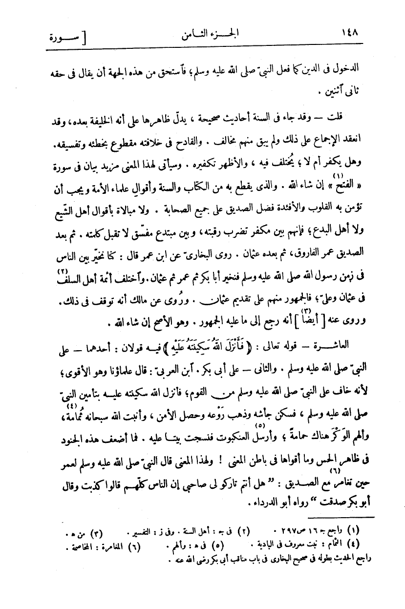 الدُّخُولِ فِي الدِّينِ كَمَا فَعَلَ النَّبِيُّ صَلَّى اللَّهُ عَلَيْهِ وَسَلَّمَ، فَاسْتَحَقَّ مِنْ هَذِهِ الْجِهَةِ أَنْ يُقَالَ فِي حَقِّهِ ثَانِيَ اثْنَيْنِ. قُلْتُ- وَقَدْ جَاءَ فِي السُّنَّةِ أَحَادِيثُ صَحِيحَةٌ، يَدُلُّ ظَاهِرُهَا عَلَى أَنَّهُ الْخَلِيفَةُ بَعْدَهُ، وَقَدِ انْعَقَدَ الْإِجْمَاعُ عَلَى ذَلِكَ وَلَمْ يَبْقَ مِنْهُمْ مُخَالِفٌ. وَالْقَادِحُ فِي خِلَافَتِهِ مَقْطُوعٌ بِخَطَئِهِ وَتَفْسِيقِهِ. وَهَلْ يَكْفُرُ أَمْ لَا، يُخْتَلَفُ فِيهِ، وَالْأَظْهَرُ تَكْفِيرُهُ. وَسَيَأْتِي لِهَذَا الْمَعْنَى مَزِيدُ بَيَانٍ فِي سُورَةِ [الْفَتْحِ «١»] إِنْ شَاءَ اللَّهُ. وَالَّذِي يُقْطَعُ بِهِ مِنَ الْكِتَابِ وَالسُّنَّةِ وَأَقْوَالِ عُلَمَاءِ الْأُمَّةِ وَيَجِبُ أَنْ تُؤْمِنَ بِهِ الْقُلُوبُ وَالْأَفْئِدَةُ فَضْلُ الصِّدِّيقِ عَلَى جَمِيعِ الصَّحَابَةِ. وَلَا مُبَالَاةَ بِأَقْوَالِ أَهْلِ الشِّيَعِ وَلَا أَهْلِ الْبِدَعِ، فَإِنَّهُمْ بَيْنَ مُكَفَّرٍ تُضْرَبُ رَقَبَتُهُ، وَبَيْنَ مُبْتَدِعٍ مُفَسَّقٍ لَا تُقْبَلُ كَلِمَتُهُ. ثُمَّ بَعْدَ الصِّدِّيقِ عُمَرُ الْفَارُوقُ، ثُمَّ بَعْدَهُ عُثْمَانُ. رَوَى الْبُخَارِيُّ عَنِ ابْنِ عُمَرَ قَالَ: كُنَّا نُخَيِّرُ بَيْنَ النَّاسِ فِي زَمَنِ رَسُولِ اللَّهِ صَلَّى اللَّهُ عَلَيْهِ وَسَلَّمَ فَنُخَيِّرُ أَبَا بَكْرٍ ثُمَّ عُمَرَ ثُمَّ عُثْمَانَ. وَاخْتَلَفَ أَئِمَّةُ أَهْلِ السَّلَفِ «٢» فِي عُثْمَانَ وَعَلِيٍّ، فَالْجُمْهُورُ مِنْهُمْ عَلَى تَقْدِيمِ عُثْمَانَ. وَرُوِيَ عَنْ مَالِكٍ أَنَّهُ تَوَقَّفَ فِي ذَلِكَ. وَرُوِيَ عَنْهُ [أَيْضًا «٣»] أَنَّهُ رَجَعَ إِلَى مَا عَلَيْهِ الْجُمْهُورُ. وَهُوَ الْأَصَحُّ إِنْ شَاءَ اللَّهُ. الْعَاشِرَةُ- قَوْلُهُ تَعَالَى: (فَأَنْزَلَ اللَّهُ سَكِينَتَهُ عَلَيْهِ) فيه قولان: أحد هما: عَلَى النَّبِيِّ صَلَّى اللَّهُ عَلَيْهِ وَسَلَّمَ. وَالثَّانِي: عَلَى أَبِي بَكْرٍ. ابْنُ الْعَرَبِيِّ: قَالَ عُلَمَاؤُنَا وَهُوَ الْأَقْوَى، لِأَنَّهُ خَافَ عَلَى النَّبِيِّ صَلَّى اللَّهُ عَلَيْهِ وَسَلَّمَ مِنَ الْقَوْمِ فَأَنْزَلَ اللَّهُ سَكِينَتَهُ عَلَيْهِ بِتَأْمِينِ النَّبِيِّ صَلَّى اللَّهُ عَلَيْهِ وَسَلَّمَ، فَسَكَنَ جَأْشُهُ وَذَهَبَ رَوْعُهُ وَحَصَلَ الْأَمْنُ وَأَنْبَتَ اللَّهُ سُبْحَانَهُ ثُمَامَةً، «٤» وَأَلْهَمَ الْوَكْرَ هُنَاكَ حَمَامَةً وَأَرْسَلَ «٥» الْعَنْكَبُوتَ فَنَسَجَتْ بَيْتًا عَلَيْهِ. فَمَا أَضْعَفَ هَذِهِ الْجُنُودَ فِي ظَاهِرِ الْحِسِّ وَمَا أَقْوَاهَا فِي بَاطِنِ الْمَعْنَى! وَلِهَذَا الْمَعْنَى قَالَ النَّبِيُّ صَلَّى اللَّهُ عَلَيْهِ وَسَلَّمَ لِعُمَرَ حِينَ تَغَامَرَ «٦» مَعَ الصِّدِّيقِ: (هَلْ أَنْتُمْ تَارِكُو لِي صَاحِبِي إِنَّ النَّاسَ كُلَّهُمْ قَالُوا كَذَبْتَ وَقَالَ أبو بكر صدقت) رواه أبو الدرداء.