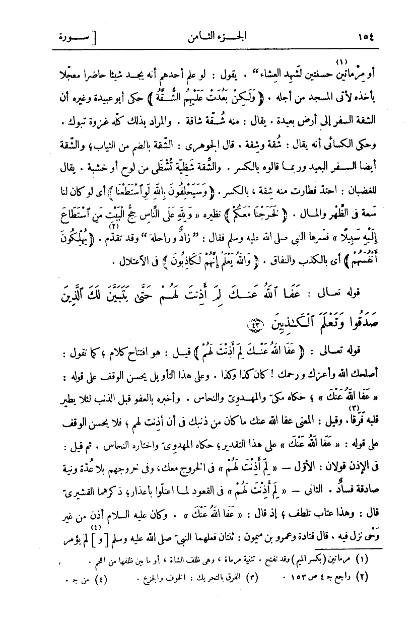 قَوْلُهُ تَعَالَى: (عَفَا اللَّهُ عَنْكَ لِمَ أَذِنْتَ لَهُمْ) قِيلَ: هُوَ افْتِتَاحُ كَلَامٍ، كَمَا تَقُولُ: أَصْلَحَكَ اللَّهُ وَأَعَزَّكَ وَرَحِمَكَ! كَانَ كَذَا وَكَذَا. وَعَلَى هَذَا التَّأْوِيلِ يَحْسُنُ الْوَقْفُ عَلَى قَوْلِهِ:" عَفَا اللَّهُ عَنْكَ"، حَكَاهُ مَكِّيٌّ وَالْمَهْدَوِيُّ وَالنَّحَّاسُ. وَأَخْبَرَهُ بِالْعَفْوِ قَبْلَ الذَّنْبِ لِئَلَّا يَطِيرَ قَلْبُهُ فَرَقًا «٣». وَقِيلَ: الْمَعْنَى عَفَا اللَّهُ عَنْكَ مَا كَانَ مِنْ ذَنْبِكَ فِي أَنْ أَذِنْتَ لَهُمْ، فَلَا يَحْسُنُ الْوَقْفُ عَلَى قَوْلِهِ:" عَفَا اللَّهُ عَنْكَ" عَلَى هَذَا التَّقْدِيرِ، حَكَاهُ الْمَهْدَوِيُّ وَاخْتَارَهُ النَّحَّاسُ. ثُمَّ قِيلَ: فِي الْإِذْنِ قَوْلَانِ: [الْأَوَّلُ [" لِمَ أَذِنْتَ لَهُمْ" فِي الْخُرُوجِ مَعَكَ، وَفِي خُرُوجِهِمْ بِلَا عِدَّةٍ وَنِيَّةٍ صَادِقَةٍ فَسَادٌ. [الثَّانِي [-" لِمَ أَذِنْتَ لَهُمْ" فِي الْقُعُودِ لَمَّا اعْتَلُّوا بِأَعْذَارٍ، ذكرهما الْقُشَيْرِيُّ قَالَ: وَهَذَا عِتَابُ تَلَطُّفٍ إِذْ قَالَ:" عَفَا اللَّهُ عَنْكَ". وَكَانَ عَلَيْهِ السَّلَامُ أَذِنَ مِنْ غَيْرِ وَحْيٍ نَزَلَ فِيهِ. قَالَ قَتَادَةُ وَعَمْرُو بْنُ مَيْمُونٍ: ثِنْتَانِ فَعَلَهُمَا النَّبِيُّ صَلَّى اللَّهُ عَلَيْهِ وَسَلَّمَ] و [«٤» لم يؤمر