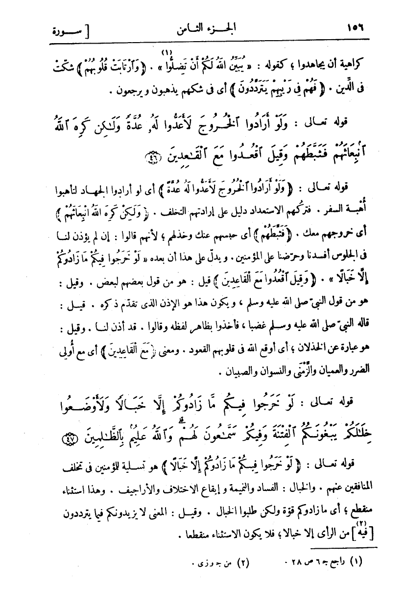 قَوْلُهُ تَعَالَى: (وَلَوْ أَرادُوا الْخُرُوجَ لَأَعَدُّوا لَهُ عُدَّةً) أَيْ لَوْ أَرَادُوا الْجِهَادَ لَتَأَهَّبُوا أُهْبَةَ السَّفَرِ. فَتَرْكُهُمُ الِاسْتِعْدَادَ دَلِيلٌ عَلَى إِرَادَتِهِمُ التَّخَلُّفَ. (وَلكِنْ كَرِهَ اللَّهُ انْبِعاثَهُمْ) أَيْ خُرُوجَهُمْ مَعَكَ. (فَثَبَّطَهُمْ) أَيْ حَبَسَهُمْ عَنْكَ وَخَذَلَهُمْ، لِأَنَّهُمْ قَالُوا: إِنْ لَمْ يُؤْذَنْ لَنَا فِي الْجُلُوسِ أَفْسَدْنَا وَحَرَّضْنَا عَلَى الْمُؤْمِنِينَ. وَيَدُلُّ عَلَى هَذَا أَنَّ بَعْدَهُ" لَوْ خَرَجُوا فِيكُمْ مَا زادُوكُمْ إِلَّا خَبالًا". (وَقِيلَ اقْعُدُوا مَعَ الْقاعِدِينَ) قِيلَ: هُوَ مِنْ قَوْلِ بَعْضِهِمْ لِبَعْضٍ. وَقِيلَ: هُوَ مِنْ قَوْلِ النَّبِيِّ صَلَّى اللَّهُ عَلَيْهِ وَسَلَّمَ، وَيَكُونُ هَذَا هُوَ الْإِذْنَ الَّذِي تَقَدَّمَ ذِكْرُهُ. قِيلَ: قَالَهُ النَّبِيُّ صَلَّى اللَّهُ عَلَيْهِ وَسَلَّمَ غَضَبًا فَأَخَذُوا بِظَاهِرِ لَفْظِهِ وَقَالُوا. قَدْ أَذِنَ لَنَا. وَقِيلَ: هُوَ عِبَارَةٌ عَنِ الْخِذْلَانِ، أَيْ أَوْقَعَ اللَّهُ فِي قُلُوبِهِمُ الْقُعُودَ. وَمَعْنَى (مَعَ الْقاعِدِينَ) أَيْ مَعَ أُولِي الضَّرَرِ وَالْعُمْيَانِ وَالزَّمْنَى والنسوان والصبيان.