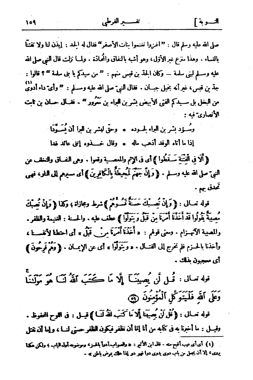 صَلَّى اللَّهُ عَلَيْهِ وَسَلَّمَ قَالَ: (اغْزُوا تَغْنَمُوا بنات الأصفر) فقال له الجد: ائذن لَنَا وَلَا تَفْتِنَّا بِالنِّسَاءِ. وَهَذَا مَنْزَعٌ غَيْرُ الْأَوَّلِ، وَهُوَ أَشْبَهُ بِالنِّفَاقِ وَالْمُحَادَّةِ. وَلَمَّا نَزَلَتْ قَالَ النَّبِيُّ صَلَّى اللَّهُ عَلَيْهِ وَسَلَّمَ لِبَنِي سَلِمَةَ- وَكَانَ الْجَدُّ بْنُ قَيْسٍ مِنْهُمْ: (مَنْ سَيِّدُكُمْ يَا بَنِي سَلِمَةَ)؟ قَالُوا: جَدُّ بْنُ قَيْسٍ، غَيْرَ أَنَّهُ بَخِيلٌ جَبَانٌ. فَقَالَ النَّبِيُّ صَلَّى اللَّهُ عَلَيْهِ وَسَلَّمَ: (وَأَيُّ دَاءٍ أَدْوَى «١» مِنَ الْبُخْلِ بَلْ سَيِّدُكُمُ الْفَتَى الْأَبْيَضُ بِشْرُ بْنُ الْبَرَاءِ بْنِ مَعْرُورٍ). فَقَالَ حَسَّانُ بْنُ ثَابِتٍ الْأَنْصَارِيُّ فِيهِ: