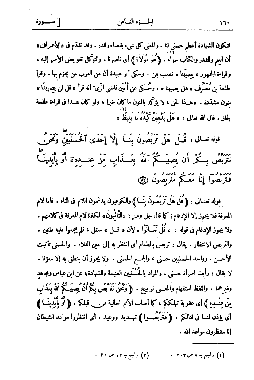 قَوْلُهُ تَعَالَى" قُلْ هَلْ تَرَبَّصُونَ بِنا" وَالْكُوفِيُّونَ يُدْغِمُونَ اللَّامَ فِي التَّاءِ. فَأَمَّا لَامُ الْمَعْرِفَةِ فَلَا يَجُوزُ إِلَّا الْإِدْغَامُ، كَمَا قَالَ عز وجل:" التَّائِبُونَ" [التوبة: ١١٢] لِكَثْرَةِ لَامِ الْمَعْرِفَةِ فِي كَلَامِهِمْ. وَلَا يَجُوزُ الإدغام في قوله:" قُلْ تَعالَوْا" [الانعام: ١٥١] لِأَنَّ" قُلْ" مُعْتَلٌّ، فَلَمْ يَجْمَعُوا عَلَيْهِ عِلَّتَيْنِ. وَالتَّرَبُّصُ الِانْتِظَارُ. يُقَالُ: تَرَبَّصَ بِالطَّعَامِ أَيِ انْتَظَرَ بِهِ إِلَى حِينِ الْغَلَاءِ. وَالْحُسْنَى تَأْنِيثُ الْأَحْسَنِ. وَوَاحِدُ الْحُسْنَيَيْنِ حُسْنَى، وَالْجَمْعُ الْحُسْنَى. وَلَا يَجُوزُ أَنْ يَنْطِقَ بِهِ إِلَّا مُعَرَّفًا. لَا يُقَالُ: رَأَيْتُ امْرَأَةً حُسْنَى. وَالْمُرَادُ بِالْحُسْنَيَيْنِ الْغَنِيمَةُ وَالشَّهَادَةُ، عن ابن عباس ومجاهد وغير هما. وَاللَّفْظُ اسْتِفْهَامٌ وَالْمَعْنَى تَوْبِيخٌ. (وَنَحْنُ نَتَرَبَّصُ بِكُمْ أَنْ يُصِيبَكُمُ اللَّهُ بِعَذابٍ مِنْ عِنْدِهِ) أَيْ عُقُوبَةٍ تُهْلِكُكُمْ كَمَا أَصَابَ الْأُمَمَ الْخَالِيَةَ مِنْ قَبْلِكُمْ. (أَوْ بِأَيْدِينا) أَيْ يُؤْذَنُ لَنَا فِي قِتَالِكُمْ. (فَتَرَبَّصُوا) تَهْدِيدٌ وَوَعِيدٌ. أَيِ انْتَظِرُوا مَوَاعِدَ الشيطان إنا منتظرون مواعد الله.