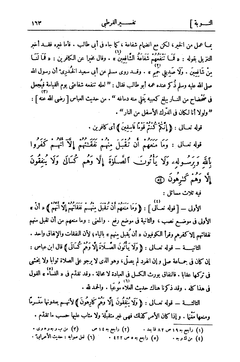 فِيهِ ثَلَاثُ مَسَائِلَ: الْأُولَى-[قَوْلُهُ تَعَالَى «٤»]: (وَما مَنَعَهُمْ أَنْ تُقْبَلَ مِنْهُمْ نَفَقاتُهُمْ إِلَّا أَنَّهُمْ) " أَنْ" الْأُولَى فِي مَوْضِعِ نَصْبٍ، وَالثَّانِيَةُ فِي مَوْضِعِ رَفْعٍ. وَالْمَعْنَى: وَمَا مَنَعَهُمْ مِنْ أَنْ تُقْبَلَ مِنْهُمْ نَفَقَاتُهُمْ إِلَّا كُفْرُهُمْ وَقَرَأَ الْكُوفِيُّونَ" أَنْ يُقْبَلَ مِنْهُمْ" بِالْيَاءِ، لِأَنَّ النَّفَقَاتِ وَالْإِنْفَاقَ وَاحِدٌ. الثَّانِيَةُ- قَوْلُهُ تَعَالَى: (وَلا يَأْتُونَ الصَّلاةَ إِلَّا وَهُمْ كُسالى) قَالَ ابْنُ عَبَّاسٍ: إِنْ كَانَ فِي جَمَاعَةٍ صَلَّى وَإِنِ انْفَرَدَ لَمْ يُصَلِّ، وَهُوَ الَّذِي لَا يَرْجُو عَلَى الصَّلَاةِ ثَوَابًا وَلَا يَخْشَى فِي تَرْكِهَا عِقَابًا. فَالنِّفَاقُ يُورِثُ الْكَسَلَ فِي الْعِبَادَةِ لَا مَحَالَةَ. وَقَدْ تَقَدَّمَ فِي [النِّسَاءِ «٥»] الْقَوْلُ فِي هَذَا كُلِّهِ. وَقَدْ ذَكَرْنَا هُنَاكَ حَدِيثَ الْعَلَاءِ «٦» مُوعَبًا. وَالْحَمْدُ لِلَّهِ. الثَّالِثَةُ- قَوْلُهُ تَعَالَى: (وَلا يُنْفِقُونَ إِلَّا وَهُمْ كارِهُونَ) لِأَنَّهُمْ يَعُدُّونَهَا مَغْرَمًا وَمَنْعَهَا مَغْنَمًا وَإِذَا كَانَ الْأَمْرُ كَذَلِكَ فَهِيَ غَيْرُ مُتَقَبَّلَةٍ وَلَا مُثَابٍ عَلَيْهَا حَسْبَ مَا تَقَدَّمَ.