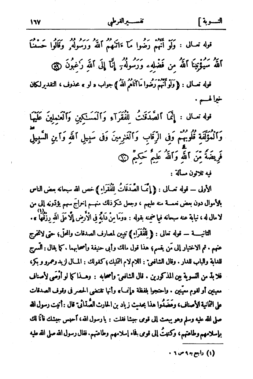 فِيهِ ثَلَاثُونَ مَسْأَلَةً: الْأُولَى- قَوْلُهُ تَعَالَى: (إِنَّمَا الصَّدَقاتُ لِلْفُقَراءِ) خَصَّ اللَّهُ سُبْحَانَهُ بَعْضَ النَّاسِ بِالْأَمْوَالِ دُونَ بَعْضٍ نِعْمَةً مِنْهُ عَلَيْهِمْ، وَجَعَلَ شُكْرَ ذَلِكَ مِنْهُمْ إِخْرَاجَ سَهْمٍ يُؤَدُّونَهُ إِلَى مَنْ لَا مَالَ لَهُ، نِيَابَةً عَنْهُ سُبْحَانَهُ فِيمَا ضَمِنَهُ بِقَوْلِهِ:" وَما مِنْ دَابَّةٍ فِي الْأَرْضِ إِلَّا عَلَى اللَّهِ رِزْقُها" «١» [هود: ٦]. الثَّانِيَةُ- قَوْلُهُ تَعَالَى:" لِلْفُقَراءِ" تَبْيِينٌ لِمَصَارِفِ الصَّدَقَاتِ وَالْمَحَلِّ، حَتَّى لَا تَخْرُجَ عَنْهُمْ. ثُمَّ الِاخْتِيَارُ إِلَى مَنْ يُقْسَمُ، هَذَا قَوْلُ مَالِكٍ وَأَبِي حَنِيفَةَ وَأَصْحَابِهِمَا. كَمَا يُقَالُ: السَّرْجُ لِلدَّابَّةِ وَالْبَابِ لِلدَّارِ. وَقَالَ الشَّافِعِيُّ: اللَّامُ لَامُ التَّمْلِيكِ، كَقَوْلِكَ: الْمَالُ لِزَيْدٍ وَعَمْرٍو وَبَكْرٍ، فَلَا بُدَّ مِنَ التَّسْوِيَةِ بَيْنَ الْمَذْكُورِينَ. قَالَ الشَّافِعِيُّ وَأَصْحَابُهُ: وَهَذَا كَمَا لَوْ أَوْصَى لِأَصْنَافٍ مُعَيَّنِينَ أَوْ لِقَوْمٍ مُعَيَّنِينَ. وَاحْتَجُّوا بِلَفْظَةِ" إِنَّمَا" وَأَنَّهَا تَقْتَضِي الْحَصْرَ فِي وُقُوفِ الصَّدَقَاتِ عَلَى الثَّمَانِيَةِ الْأَصْنَافِ وَعَضَّدُوا هَذَا بِحَدِيثِ زِيَادِ بْنِ الْحَارِثِ الصُّدَائِيِّ قَالَ: أَتَيْتُ رَسُولَ اللَّهِ صَلَّى اللَّهُ عَلَيْهِ وَسَلَّمَ وَهُوَ يَبْعَثُ إِلَى قَوْمِي جَيْشًا فَقُلْتُ: يَا رَسُولَ اللَّهِ احْبِسْ جَيْشَكَ فَأَنَا لَكَ بِإِسْلَامِهِمْ وَطَاعَتِهِمْ، وَكَتَبْتُ إِلَى قَوْمِي فَجَاءَ إِسْلَامُهُمْ وَطَاعَتُهُمْ. فقال رسول الله صلى الله عليه