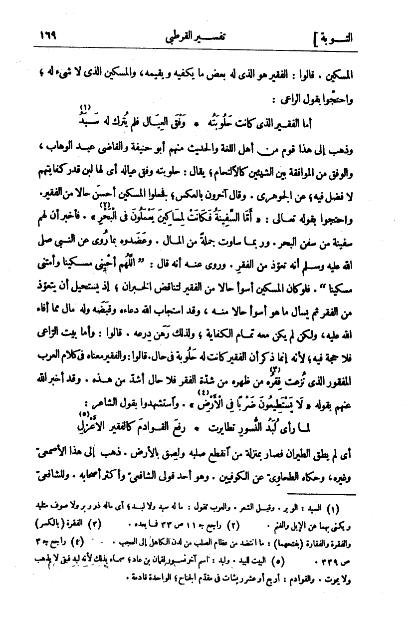 وَذَهَبَ إِلَى هَذَا قَوْمٌ مِنْ أَهْلِ اللُّغَةِ وَالْحَدِيثِ مِنْهُمْ أَبُو حَنِيفَةَ وَالْقَاضِي عَبْدُ الْوَهَّابِ، وَالْوَفْقُ مِنَ الْمُوَافَقَةِ بَيْنَ الشَّيْئَيْنِ كَالِالْتِحَامِ، يُقَالُ: حَلُوبَتُهُ وَفْقَ عِيَالِهِ أَيْ لَهَا لَبَنٌ قَدْرَ كِفَايَتِهِمْ لَا فَضْلَ فِيهِ، عَنِ الْجَوْهَرِيِّ. وَقَالَ آخَرُونَ بِالْعَكْسِ، فَجَعَلُوا الْمِسْكِينَ أَحْسَنَ حَالًا مِنَ الْفَقِيرِ. وَاحْتَجُّوا بِقَوْلِهِ تَعَالَى:" أَمَّا السَّفِينَةُ فَكانَتْ لِمَساكِينَ يَعْمَلُونَ فِي الْبَحْرِ" «٢» [الكهف: ٧٩]. فَأَخْبَرَ أَنَّ لَهُمْ سَفِينَةً مِنْ سُفُنِ الْبَحْرِ. وَرُبَّمَا سَاوَتْ جُمْلَةً مِنَ الْمَالِ. وَعَضَّدُوهُ بِمَا رُوِيَ عَنِ النَّبِيِّ صَلَّى اللَّهُ عَلَيْهِ وَسَلَّمَ أَنَّهُ تَعَوَّذَ مِنَ الْفَقْرِ. وَرُوِيَ عَنْهُ أَنَّهُ قَالَ:" اللَّهُمَّ أَحْيِنِي مِسْكِينًا وَأَمِتْنِي مِسْكِينًا". فَلَوْ كَانَ الْمِسْكِينُ أَسْوَأَ حَالًا مِنَ الْفَقِيرِ لَتَنَاقَضَ الْخَبَرَانِ، إِذْ يَسْتَحِيلُ أَنْ يَتَعَوَّذَ مِنَ الْفَقْرِ ثُمَّ يَسْأَلُ مَا هُوَ أَسْوَأَ حَالًا مِنْهُ، وقد استجاب الله دعاءه وقبضه وله مِمَّا أَفَاءَ اللَّهُ عَلَيْهِ، وَلَكِنْ لَمْ يَكُنْ مَعَهُ تَمَامَ الْكِفَايَةِ، وَلِذَلِكَ رَهَنَ دِرْعَهُ. قَالُوا: وَأَمَّا بَيْتُ الرَّاعِي فَلَا حُجَّةَ فِيهِ، لِأَنَّهُ إِنَّمَا ذَكَرَ أَنَّ الْفَقِيرَ كَانَتْ لَهُ حَلُوبَةٌ فِي حَالٍ. قَالُوا: وَالْفَقِيرُ مَعْنَاهُ فِي كَلَامِ الْعَرَبِ الْمَفْقُورُ الَّذِي نُزِعَتْ فِقَرُهُ «٣» مِنْ ظَهْرِهِ مِنْ شِدَّةِ الْفَقْرِ فَلَا حَالَ أَشَدُّ مِنْ هَذِهِ. وَقَدْ أَخْبَرَ اللَّهُ عَنْهُمْ بِقَوْلِهِ" لَا يَسْتَطِيعُونَ ضَرْباً فِي الْأَرْضِ" «٤» [البقرة: ٢٧٣]. وَاسْتَشْهَدُوا بِقَوْلِ الشَّاعِرِ: