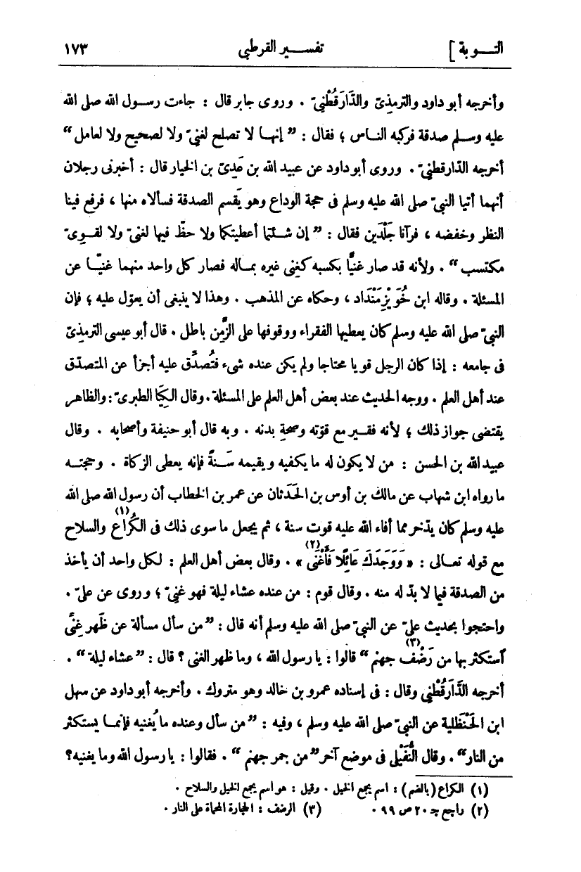 وَأَخْرَجَهُ أَبُو دَاوُدَ وَالتِّرْمِذِيُّ وَالدَّارَقُطْنِيُّ. وَرَوَى جَابِرٌ قَالَ: جَاءَتْ رَسُولَ اللَّهِ صَلَّى اللَّهُ عَلَيْهِ وَسَلَّمَ صَدَقَةٌ فَرَكِبَهُ النَّاسُ، فَقَالَ: (إِنَّهَا لَا تَصْلُحُ لِغَنِيٍّ وَلَا لِصَحِيحٍ وَلَا لِعَامِلٍ) أَخْرَجَهُ الدَّارَقُطْنِيُّ. وَرَوَى أَبُو دَاوُدَ عَنْ عُبَيْدِ اللَّهِ بْنِ عَدِيِّ بْنِ الْخِيَارِ قَالَ: أَخْبَرَنِي رَجُلَانِ أَنَّهُمَا أَتَيَا النَّبِيِّ صَلَّى اللَّهُ عَلَيْهِ وَسَلَّمَ فِي حَجَّةِ الْوَدَاعِ وَهُوَ يَقْسِمُ الصَّدَقَةَ فَسَأَلَاهُ مِنْهَا، فَرَفَعَ فِينَا النَّظَرَ وَخَفَضَهُ، فَرَآنَا جَلْدَيْنِ فَقَالَ: (إِنْ شِئْتُمَا أَعْطَيْتُكُمَا وَلَا حَظَّ فِيهَا لِغَنِيٍّ وَلَا لِقَوِيٍّ مُكْتَسِبٍ). وَلِأَنَّهُ قَدْ صَارَ غَنِيًّا بِكَسْبِهِ كَغِنَى غَيْرِهِ بِمَالِهِ فَصَارَ كُلٌّ وَاحِدٍ مِنْهُمَا غَنِيًّا عَنْ الْمَسْأَلَةِ. وَقَالَهُ ابْنُ خويز منداد، وَحَكَاهُ عَنِ الْمَذْهَبِ. وَهَذَا لَا يَنْبَغِي أَنْ يُعَوَّلَ عَلَيْهِ، فَإِنَّ النَّبِيَّ صَلَّى اللَّهُ عَلَيْهِ وَسَلَّمَ كَانَ يُعْطِيهَا الْفُقَرَاءَ وَوُقُوفُهَا عَلَى الزَّمِنِ بَاطِلٌ. قَالَ أَبُو عِيسَى التِّرْمِذِيُّ فِي جَامِعِهِ: إِذَا كَانَ الرَّجُلُ قَوِيًّا مُحْتَاجًا وَلَمْ يَكُنْ عنده شي فَتُصُدِّقَ عَلَيْهِ أَجْزَأَ عَنِ الْمُتَصَدِّقِ عِنْدَ أَهْلِ الْعِلْمِ. وَوَجْهُ الْحَدِيثِ عِنْدَ بَعْضِ أَهْلِ الْعِلْمِ عَلَى الْمَسْأَلَةِ. وَقَالَ الْكِيَا الطَّبَرِيُّ: وَالظَّاهِرُ يَقْتَضِي جَوَازَ ذَلِكَ، لِأَنَّهُ فَقِيرٌ مَعَ قُوَّتِهِ وَصِحَّةِ بَدَنِهِ. وَبِهِ قَالَ أَبُو حَنِيفَةَ وَأَصْحَابُهُ. وَقَالَ عُبَيْدُ اللَّهِ بْنُ الْحَسَنِ: مَنْ لَا يَكُونُ لَهُ مَا يَكْفِيهِ وَيُقِيمُهُ سَنَةً فَإِنَّهُ يُعْطَى الزَّكَاةَ. وَحُجَّتُهُ مَا رَوَاهُ ابْنُ شِهَابٍ عَنْ مَالِكِ بْنِ أَوْسِ بْنِ الْحَدَثَانِ عَنْ عُمَرَ بْنِ الْخَطَّابِ أَنَّ رَسُولَ اللَّهِ صَلَّى اللَّهُ عَلَيْهِ وَسَلَّمَ كَانَ يَدَّخِرُ مِمَّا أَفَاءَ اللَّهُ عَلَيْهِ قُوتَ سَنَةٍ، ثُمَّ يَجْعَلُ مَا سِوَى ذَلِكَ فِي الْكُرَاعِ «١» وَالسِّلَاحِ مَعَ قَوْلِهِ تَعَالَى:" وَوَجَدَكَ عائِلًا فَأَغْنى " «٢» [الضحى: ٨]. وَقَالَ بَعْضُ أَهْلِ الْعِلْمِ: لِكُلِّ وَاحِدٍ أَنْ يَأْخُذَ مِنَ الصَّدَقَةِ فِيمَا لَا بُدَّ لَهُ مِنْهُ. وَقَالَ قَوْمٌ: مَنْ عِنْدَهُ عَشَاءُ لَيْلَةٍ فَهُوَ غَنِيٌّ وَرُوِيَ عَنْ عَلِيٍّ. وَاحْتَجُّوا بِحَدِيثِ عَلِيٍّ عَنِ النَّبِيِّ صَلَّى اللَّهُ عَلَيْهِ وَسَلَّمَ أَنَّهُ قَالَ: (مَنْ سَأَلَ مَسْأَلَةً عَنْ ظَهْرِ غِنًى اسْتَكْثَرَ بِهَا مِنْ رَضْفِ «٣» جَهَنَّمَ) قَالُوا: يَا رَسُولَ اللَّهِ، وَمَا ظَهْرُ الْغِنَى؟ قَالَ: (عَشَاءُ لَيْلَةٍ) أَخْرَجَهُ الدَّارَقُطْنِيُّ وَقَالَ: فِي إِسْنَادِهِ عَمْرُو بْنُ خَالِدٍ وَهُوَ مَتْرُوكٌ. وَأَخْرَجَهُ أَبُو داود عن سهل ابن الْحَنْظَلِيَّةِ عَنِ النَّبِيِّ صَلَّى اللَّهُ عَلَيْهِ وَسَلَّمَ، وَفِيهِ: (مَنْ سَأَلَ وَعِنْدَهُ مَا يُغْنِيهِ فَإِنَّمَا يَسْتَكْثِرُ مِنَ النَّارِ). وَقَالَ النُّفَيْلِيُّ فِي مَوْضِعٍ آخَرَ (مِنْ جَمْرِ جَهَنَّمَ). فَقَالُوا: يَا رَسُولَ الله وما يغنيه؟
