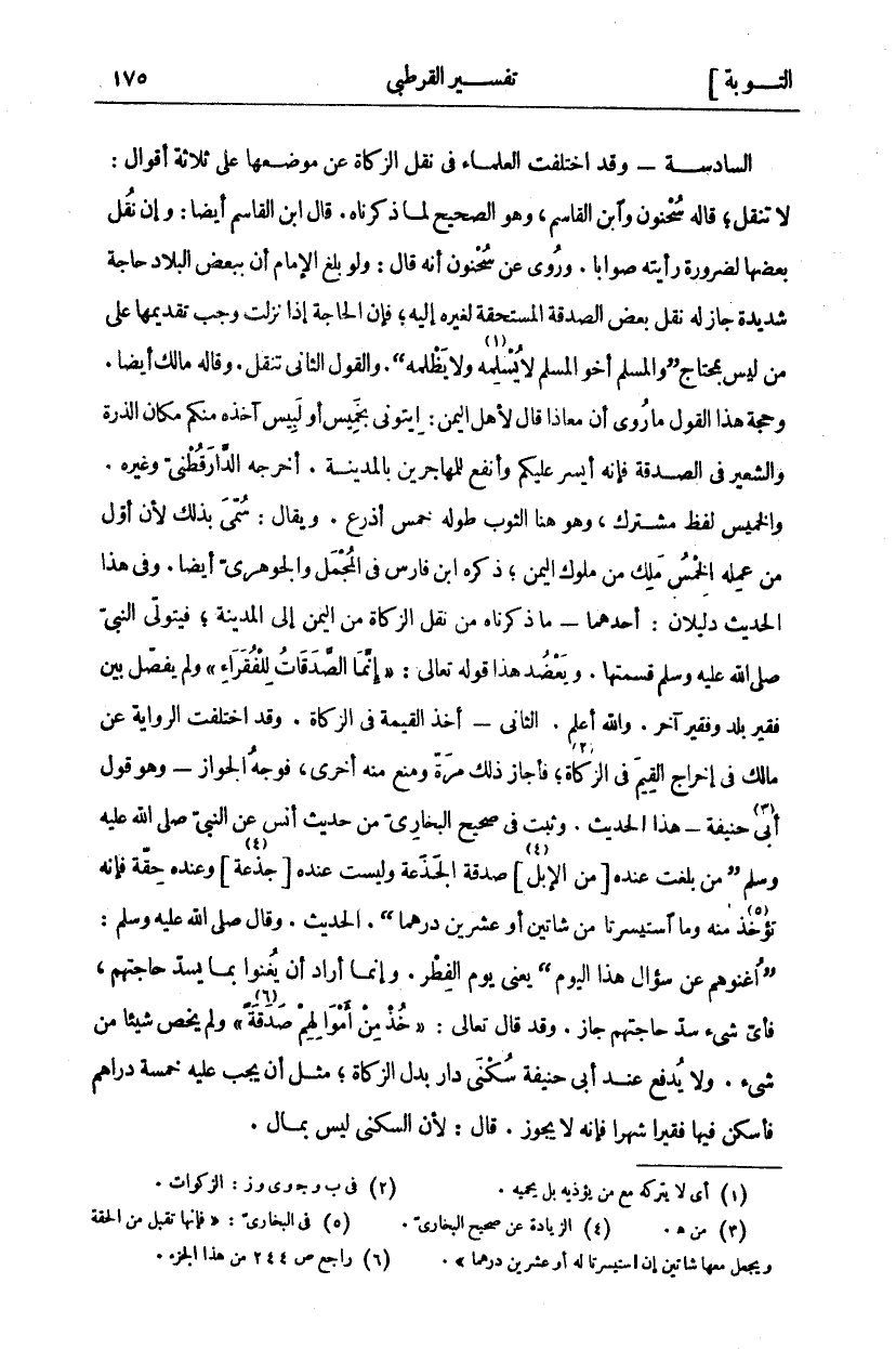 السَّادِسَةُ- وَقَدِ اخْتَلَفَتِ الْعُلَمَاءُ فِي نَقْلِ الزَّكَاةِ عن موضعها على ثلاثة أقوال لَا تُنْقَلُ، قَالَهُ سَحْنُونٌ وَابْنُ الْقَاسِمِ، وَهُوَ الصَّحِيحُ لِمَا ذَكَرْنَاهُ. قَالَ ابْنُ الْقَاسِمِ أَيْضًا: وَإِنْ نُقِلَ بَعْضُهَا لِضَرُورَةٍ رَأَيْتُهُ صَوَابًا. وَرُوِيَ عَنْ سَحْنُونٍ أَنَّهُ قَالَ: وَلَوْ بَلَغَ الْإِمَامَ أَنَّ بِبَعْضِ الْبِلَادِ حَاجَةً شَدِيدَةً جَازَ لَهُ نَقْلُ بَعْضِ الصَّدَقَةِ الْمُسْتَحَقَّةِ لِغَيْرِهِ إِلَيْهِ، فَإِنَّ الْحَاجَةَ إِذَا نَزَلَتْ وَجَبَ تَقْدِيمُهَا عَلَى مَنْ لَيْسَ بِمُحْتَاجٍ (وَالْمُسْلِمُ أَخُو الْمُسْلِمِ لَا يُسْلِمُهُ «١» وَلَا يَظْلِمُهُ). وَالْقَوْلُ الثَّانِي تُنْقَلُ. وَقَالَهُ مَالِكٌ أَيْضًا. وَحُجَّةُ هَذَا الْقَوْلِ مَا رُوِيَ أَنَّ مُعَاذًا قَالَ لِأَهْلِ الْيَمَنِ: ايِتُونِي بِخَمِيسٍ أَوْ لَبِيسٍ آخُذُهُ مِنْكُمْ مَكَانَ الذُّرَةِ وَالشَّعِيرِ فِي الصَّدَقَةِ فَإِنَّهُ أَيْسَرُ عَلَيْكُمْ وَأَنْفَعُ لِلْمُهَاجِرِينَ بِالْمَدِينَةِ. أَخْرَجَهُ الدَّارَقُطْنِيُّ وَغَيْرُهُ. وَالْخَمِيسُ لَفْظٌ مُشْتَرَكٌ، وَهُوَ هنا الثوب طوله خمس أَذْرُعٍ. وَيُقَالُ: سُمِّيَ بِذَلِكَ لِأَنَّ أَوَّلَ مَنْ عَمِلَهُ الْخِمْسُ مَلِكٌ مِنْ مُلُوكِ الْيَمَنِ، ذَكَرَهُ ابْنُ فَارِسٍ فِي الْمُجْمَلِ وَالْجَوْهَرِيُّ أَيْضًا. وَفِي هَذَا الْحَدِيثِ دَلِيلَانِ: أَحَدُهُمَا: مَا ذَكَرْنَاهُ مِنْ نَقْلِ الزَّكَاةِ مِنَ الْيَمَنِ إِلَى الْمَدِينَةِ، فَيَتَوَلَّى النَّبِيُّ صَلَّى اللَّهُ عَلَيْهِ وَسَلَّمَ قِسْمَتَهَا. وَيَعْضُدُ هَذَا قَوْلُهُ تَعَالَى:" إِنَّمَا الصَّدَقاتُ لِلْفُقَراءِ" وَلَمْ يَفْصِلْ بَيْنَ فَقِيرِ بَلَدٍ وَفَقِيرِ آخَرَ. وَاللَّهُ أَعْلَمُ. الثَّانِي- أَخْذُ الْقِيمَةِ فِي الزَّكَاةِ. وَقَدِ اخْتَلَفَتِ الرِّوَايَةُ عَنْ مَالِكٍ فِي إِخْرَاجِ الْقِيَمِ فِي الزَّكَاةِ «٢»، فَأَجَازَ ذَلِكَ مَرَّةً وَمَنَعَ مِنْهُ أُخْرَى، فَوَجْهُ الْجَوَازِ- وَهُوَ قَوْلُ أَبِي «٣» حَنِيفَةَ- هَذَا الْحَدِيثُ. وَثَبَتَ فِي صَحِيحِ الْبُخَارِيِّ مِنْ حَدِيثِ أَنَسٍ عَنِ النَّبِيِّ صَلَّى اللَّهُ عَلَيْهِ وَسَلَّمَ (مَنْ بَلَغَتْ عِنْدَهُ [مِنَ الْإِبِلِ «٤» [صَدَقَةُ الْجَذَعَةِ وَلَيْسَتْ عِنْدَهُ [جَذَعَةٌ] «٥» وَعِنْدَهُ حِقَّةٌ فَإِنَّهُ تُؤْخَذُ «٦» مِنْهُ وَمَا اسْتَيْسَرْنَا مِنْ شَاتَيْنِ أَوْ عِشْرِينَ دِرْهَمًا). الْحَدِيثَ. وَقَالَ صَلَّى اللَّهُ عَلَيْهِ وَسَلَّمَ: (أَغْنُوهُمْ عَنْ سُؤَالِ هَذَا الْيَوْمَ) يَعْنِي يَوْمَ الْفِطْرَ. وَإِنَّمَا أَرَادَ أَنْ يُغْنَوْا بِمَا يسد حاجتهم، فأي شي سَدَّ حَاجَتَهُمْ جَازَ. وَقَدْ قَالَ تَعَالَى:" خُذْ مِنْ أَمْوالِهِمْ صَدَقَةً" [التوبة: ١٠٣] «٧» ولم يخص شيئا من شي. وَلَا يُدْفَعُ عِنْدَ أَبِي حَنِيفَةَ سُكْنَى دَارٍ بَدَلَ الزَّكَاةِ، مِثْلَ أَنْ يَجِبَ عَلَيْهِ خَمْسَةُ دَرَاهِمَ فَأَسْكَنَ فِيهَا فَقِيرًا شَهْرًا فَإِنَّهُ لَا يجوز. قال: لان السكنى ليس بمال.
