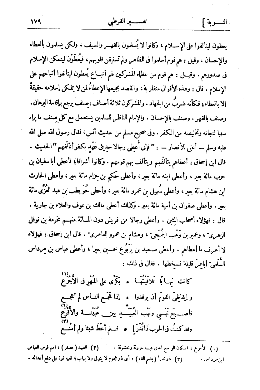 يُعْطَوْنَ لِيُتَأَلَّفُوا عَلَى الْإِسْلَامِ، وَكَانُوا لَا يُسْلِمُونَ بِالْقَهْرِ وَالسَّيْفِ، وَلَكِنْ يُسْلِمُونَ بِالْعَطَاءِ وَالْإِحْسَانِ. وَقِيلَ: هُمْ قَوْمٌ أَسْلَمُوا فِي الظَّاهِرِ وَلَمْ تَسْتَيْقِنْ قُلُوبُهُمْ، فَيُعْطَوْنَ لِيَتَمَكَّنَ الْإِسْلَامُ فِي صُدُورِهِمْ. وَقِيلَ: هُمْ قَوْمٌ مِنْ عُظَمَاءِ الْمُشْرِكِينَ لَهُمْ أَتْبَاعٌ يُعْطَوْنَ لِيَتَأَلَّفُوا أَتْبَاعَهُمْ عَلَى الْإِسْلَامِ. قَالَ: وَهَذِهِ الْأَقْوَالُ مُتَقَارِبَةٌ وَالْقَصْدُ بِجَمِيعِهَا الْإِعْطَاءُ لِمَنْ لَا يَتَمَكَّنُ إِسْلَامُهُ حَقِيقَةً إِلَّا بِالْعَطَاءِ، فَكَأَنَّهُ ضَرْبٌ مِنَ الْجِهَادِ. وَالْمُشْرِكُونَ ثَلَاثَةُ أَصْنَافٍ: صِنْفٌ يَرْجِعُ بِإِقَامَةِ الْبُرْهَانِ. وَصِنْفٌ بِالْقَهْرِ. وَصِنْفٌ بِالْإِحْسَانِ. وَالْإِمَامُ النَّاظِرُ لِلْمُسْلِمِينَ يَسْتَعْمِلُ مَعَ كُلِّ صِنْفٍ مَا يَرَاهُ سَبَبًا لِنَجَاتِهِ وَتَخْلِيصِهِ مِنَ الْكُفْرِ. وَفِي صَحِيحِ مُسْلِمٍ مِنْ حَدِيثِ أَنَسٍ، فَقَالَ رَسُولُ اللَّهِ صَلَّى اللَّهُ عَلَيْهِ وَسَلَّمَ أَعْنِي لِلْأَنْصَارِ-: (فَإِنِّي أُعْطِي رِجَالًا حَدِيثِي عَهْدٍ بِكُفْرٍ أَتَأَلَّفُهُمْ) الْحَدِيثَ. قَالَ ابْنُ إِسْحَاقَ: أَعْطَاهُمْ يَتَأَلَّفُهُمْ وَيَتَأَلَّفُ بِهِمْ قَوْمَهُمْ. وَكَانُوا أَشْرَافًا، فَأَعْطَى أَبَا سُفْيَانَ بْنَ حَرْبٍ مِائَةَ بَعِيرٍ، وَأَعْطَى ابْنَهُ مِائَةَ بَعِيرٍ، وَأَعْطَى حَكِيمَ بْنَ حِزَامٍ مِائَةَ بَعِيرٍ، وأعطى الحارث ابن هِشَامٍ مِائَةَ بَعِيرٍ، وَأَعْطَى سُهَيْلَ بْنَ عَمْرٍو مِائَةَ بَعِيرٍ، وَأَعْطَى حُوَيْطِبَ بْنَ عَبْدِ الْعُزَّى مِائَةَ بَعِيرٍ، وَأَعْطَى صَفْوَانَ بْنَ أُمَيَّةَ مِائَةَ بَعِيرٍ. وَكَذَلِكَ أَعْطَى مَالِكَ بْنَ عَوْفٍ وَالْعَلَاءَ بْنَ جَارِيَةَ. قَالَ: فَهَؤُلَاءِ أَصْحَابُ الْمِئِينَ. وَأَعْطَى رِجَالًا مِنْ قُرَيْشٍ دُونَ الْمِائَةِ مِنْهُمْ مَخْرَمَةُ بْنُ نَوْفَلٍ الزُّهْرِيُّ وَعُمَيْرُ بْنُ وَهْبٍ الْجُمَحِيُّ، وَهِشَامُ بْنُ عَمْرٍو الْعَامِرِيُّ. قَالَ ابْنُ إِسْحَاقَ: فَهَؤُلَاءِ لَا أَعْرِفُ مَا أَعْطَاهُمْ. وَأَعْطَى سَعِيدَ بْنَ يَرْبُوعٍ خَمْسِينَ بَعِيرًا، وَأَعْطَى عَبَّاسَ بْنَ مِرْدَاسٍ السُّلَمِيَّ أَبَاعِرَ قَلِيلَةً فَسَخِطَهَا. فَقَالَ فِي ذَلِكَ: