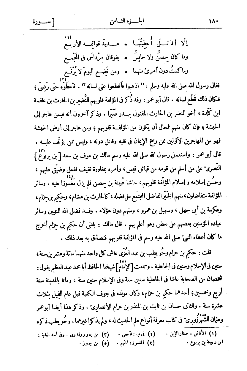 فَقَالَ رَسُولُ اللَّهِ صَلَّى اللَّهُ عَلَيْهِ وَسَلَّمَ: (اذْهَبُوا فَاقْطَعُوا عَنِّي لِسَانَهُ) فَأَعْطَوْهُ «٢» حَتَّى رَضِيَ، فَكَانَ ذَلِكَ قَطْعَ لِسَانِهِ. قَالَ أَبُو عُمَرَ: وَقَدْ ذُكِرَ فِي الْمُؤَلَّفَةِ قُلُوبُهُمِ النُّضَيْرُ بْنُ الْحَارِثِ بْنِ عَلْقَمَةَ ابن كِلْدَةَ، أَخُو النَّضْرِ بْنِ الْحَارِثِ الْمَقْتُولِ بِبَدْرٍ صَبْرًا. وَذَكَرَ آخَرُونَ أَنَّهُ فِيمَنْ هَاجَرَ إِلَى الْحَبَشَةِ، فَإِنْ كَانَ مِنْهُمْ فَمُحَالٌ أَنْ يَكُونَ مِنَ الْمُؤَلَّفَةِ قُلُوبُهُمْ، وَمَنْ هَاجَرَ إِلَى أَرْضِ، الْحَبَشَةِ فَهُوَ مِنَ الْمُهَاجِرِينَ الْأَوَّلِينَ مِمَّنْ رَسَخَ الْإِيمَانُ فِي قَلْبِهِ وَقَاتَلَ دُونَهُ، وَلَيْسَ مِمَّنْ يُؤَلَّفُ عَلَيْهِ. قَالَ أَبُو عُمَرَ: وَاسْتَعْمَلَ رَسُولُ اللَّهِ صَلَّى اللَّهُ عَلَيْهِ وَسَلَّمَ مَالِكَ بْنَ عَوْفِ بْنِ سَعْدِ [بْنِ يَرْبُوعٍ «٣»] النَّصْرِيَّ عَلَى مَنْ أَسْلَمَ مِنْ قَوْمِهِ مِنْ قَبَائِلِ قَيْسٍ، وأمره بمغاورة ثَقِيفٍ فَفَعَلَ وَضَيَّقَ عَلَيْهِمْ، وَحَسُنَ إِسْلَامُهُ وَإِسْلَامُ الْمُؤَلَّفَةِ قُلُوبُهُمْ، حَاشَا عُيَيْنَةَ بْنَ حِصْنٍ فَلَمْ يَزَلْ مَغْمُوزًا «٤» عَلَيْهِ. وَسَائِرُ الْمُؤَلَّفَةِ مُتَفَاضِلُونَ، مِنْهُمُ الْخَيِّرُ الْفَاضِلُ الْمُجْتَمَعُ عَلَى فَضْلِهِ، كَالْحَارِثِ بْنِ هِشَامٍ، وَحَكِيمِ بْنِ حِزَامٍ، وَعِكْرِمَةَ بْنِ أَبِي جَهْلٍ، وَسُهَيْلِ بْنِ عَمْرٍو، وَمِنْهُمْ دُونُ هَؤُلَاءِ. وَقَدْ فَضَّلَ اللَّهُ النَّبِيِّينَ وَسَائِرَ عِبَادِهِ الْمُؤْمِنِينَ بَعْضَهُمْ عَلَى بَعْضٍ وَهُوَ أَعْلَمُ بِهِمْ. قَالَ مَالِكٌ: بَلَغَنِي أَنَّ حَكِيمَ بْنَ حِزَامٍ أَخْرَجَ مَا كَانَ أَعْطَاهُ النَّبِيُّ صَلَّى اللَّهُ عَلَيْهِ وَسَلَّمَ فِي الْمُؤَلَّفَةِ قُلُوبَهُمْ فَتَصَدَّقَ بِهِ بَعْدَ ذَلِكَ. قُلْتُ: حَكِيمُ بْنُ حِزَامٍ وَحُوَيْطِبُ بْنُ عَبْدِ الْعُزَّى عَاشَ كُلُّ وَاحِدٍ مِنْهُمَا مِائَةً وَعِشْرِينَ سَنَةً سِتِّينَ فِي الْإِسْلَامِ وَسِتِّينَ فِي الْجَاهِلِيَّةِ. وَسَمِعْتُ [الْإِمَامَ «٥»] شَيْخَنَا الْحَافِظَ أَبَا مُحَمَّدٍ عَبْدَ الْعَظِيمِ يَقُولُ: شَخْصَانِ مِنَ الصَّحَابَةِ عَاشَا فِي الْجَاهِلِيَّةِ سِتِّينَ سَنَةً وَفِي الْإِسْلَامِ سِتِّينَ سَنَةً، وَمَاتَا بِالْمَدِينَةِ سَنَةَ أَرْبَعٍ وَخَمْسِينَ، أَحَدُهُمَا حَكِيمُ بْنُ حِزَامٍ، وَكَانَ مَوْلِدُهُ فِي جَوْفِ الْكَعْبَةِ قَبْلَ عَامِ الْفِيلِ بِثَلَاثَ عَشْرَةَ سَنَةً. وَالثَّانِي حَسَّانُ بْنُ ثَابِتِ بْنِ الْمُنْذِرِ بْنِ حَرَامٍ الْأَنْصَارِيُّ. وَذَكَرَ هَذَا أَيْضًا أَبُو عُمَرَ وَعُثْمَانُ الشَّهْرُزُورِيُّ فِي كِتَابِ مَعْرِفَةِ أَنْوَاعِ عِلْمِ الْحَدِيثِ لَهُ، وَلَمْ يَذْكُرَا غَيْرَهُمَا. وَحُوَيْطِبُ ذَكَرَهُ