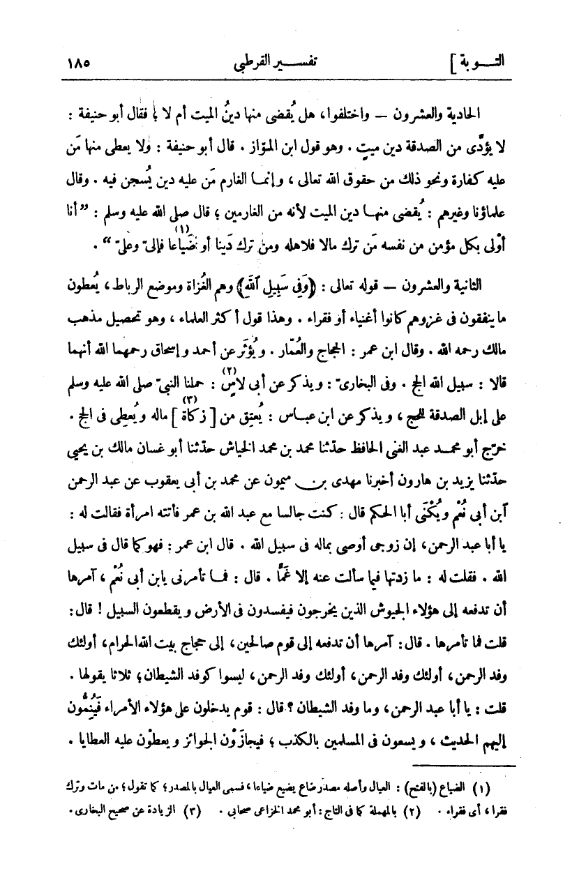 الْحَادِيَةُ وَالْعِشْرُونَ- وَاخْتَلَفُوا، هَلْ يُقْضَى مِنْهَا دَيْنُ الْمَيِّتِ أَمْ لَا، فَقَالَ أَبُو حَنِيفَةَ: لَا يُؤَدَّى مِنَ الصَّدَقَةِ دَيْنُ مَيِّتٍ. وَهُوَ قَوْلُ ابْنِ الْمَوَّازِ. قَالَ أَبُو حَنِيفَةَ: وَلَا يُعْطَى مِنْهَا مَنْ عَلَيْهِ كَفَّارَةٌ وَنَحْوُ ذَلِكَ مِنْ حُقُوقِ اللَّهِ تَعَالَى، وَإِنَّمَا الْغَارِمُ مَنْ عَلَيْهِ دَيْنٌ يُسْجَنُ فِيهِ. وَقَالَ عُلَمَاؤُنَا وَغَيْرُهُمْ: يُقْضَى مِنْهَا دَيْنُ الْمَيِّتِ لِأَنَّهُ مِنَ الْغَارِمِينَ، قَالَ صَلَّى اللَّهُ عَلَيْهِ وَسَلَّمَ: (أَنَا أَوْلَى بِكُلِّ مُؤْمِنٍ مِنْ نَفْسِهِ مَنْ تَرَكَ مَالًا فَلِأَهْلِهِ وَمَنْ تَرَكَ دَيْنًا أَوْ ضَيَاعًا «١» فَإِلَيَّ وَعَلَيَّ). الثانية والعشرون- قوله تعالى: (وَفِي سَبِيلِ اللَّهِ) وَهُمُ الْغُزَاةُ وَمَوْضِعُ الرِّبَاطِ، يُعْطَوْنَ مَا يُنْفِقُونَ فِي غَزْوِهِمْ كَانُوا أَغْنِيَاءَ أَوْ فُقَرَاءَ. وَهَذَا قَوْلُ أَكْثَرِ الْعُلَمَاءِ، وَهُوَ تَحْصِيلُ مَذْهَبِ مَالِكٍ رَحِمَهُ اللَّهُ. وَقَالَ ابْنُ عُمَرَ: الْحُجَّاجُ وَالْعُمَّارُ. وَيُؤْثَرُ عَنْ أَحْمَدَ وَإِسْحَاقَ رَحِمَهُمَا اللَّهُ أَنَّهُمَا قَالَا: سَبِيلُ اللَّهِ الْحَجُّ. وَفِي الْبُخَارِيِّ: وَيُذْكَرُ عَنْ أَبِي لَاسٍ «٢»: حَمَلَنَا النَّبِيُّ صَلَّى اللَّهُ عَلَيْهِ وَسَلَّمَ عَلَى إِبِلِ الصَّدَقَةِ لِلْحَجِّ، وَيُذْكَرُ عَنِ ابْنِ عَبَّاسٍ: يَعْتِقُ مِنْ [زَكَاةِ «٣»] مَالِهِ وَيُعْطِي فِي الْحَجِّ. خَرَّجَ أَبُو مُحَمَّدٍ عَبْدُ الْغَنِيِّ الْحَافِظُ حَدَّثَنَا مُحَمَّدُ بْنُ مُحَمَّدٍ الْخَيَّاشُ حَدَّثَنَا أَبُو غَسَّانَ مَالِكُ بن يحيى حدثنا يزيد بن ها رون أَخْبَرَنَا مَهْدِيُّ بْنُ مَيْمُونٍ عَنْ مُحَمَّدِ بْنِ أبي يعقوب عن عبد الرحمن ابن أَبِي نُعْمٍ وَيُكَنَّى أَبَا الْحَكَمِ قَالَ: كُنْتُ جَالِسًا مَعَ عَبْدِ اللَّهِ بْنِ عُمَرَ فَأَتَتْهُ امْرَأَةٌ فَقَالَتْ لَهُ: يَا أَبَا عَبْدِ الرَّحْمَنِ، إِنَّ زَوْجِي أَوْصَى بِمَالِهِ فِي سَبِيلِ اللَّهِ. قَالَ ابْنُ عُمَرَ: فَهُوَ كَمَا قَالَ فِي سَبِيلِ اللَّهِ. فَقُلْتُ لَهُ: مَا زِدْتَهَا فِيمَا سَأَلَتْ عَنْهُ إِلَّا غَمًّا. قَالَ: فَمَا تَأْمُرُنِي يا ابن أبي نعم، آمر ها أَنْ تَدْفَعَهُ إِلَى هَؤُلَاءِ الْجُيُوشِ الَّذِينَ يَخْرُجُونَ فَيُفْسِدُونَ فِي الْأَرْضِ وَيَقْطَعُونَ السَّبِيلَ! قَالَ: قُلْتُ فما تأمر ها. قَالَ: آمُرُهَا أَنْ تَدْفَعَهُ إِلَى قَوْمٍ صَالِحِينَ، إِلَى حُجَّاجِ بَيْتِ اللَّهِ الْحَرَامِ، أُولَئِكَ وَفْدُ الرَّحْمَنِ، أُولَئِكَ وَفْدُ الرَّحْمَنِ، أُولَئِكَ وَفْدُ الرَّحْمَنِ، لَيْسُوا كَوَفْدِ الشَّيْطَانِ، ثَلَاثًا يَقُولُهَا. قُلْتُ: يَا أَبَا عَبْدِ الرَّحْمَنِ، وَمَا وَفْدُ الشَّيْطَانِ؟ قَالَ: قَوْمٌ يَدْخُلُونَ عَلَى هَؤُلَاءِ الْأُمَرَاءِ فَيُنَمُّونَ إِلَيْهِمُ الْحَدِيثَ، وَيَسْعَوْنَ فِي الْمُسْلِمِينَ بِالْكَذِبِ، فَيُجَازُونَ الْجَوَائِزَ ويعطون عليه العطايا.