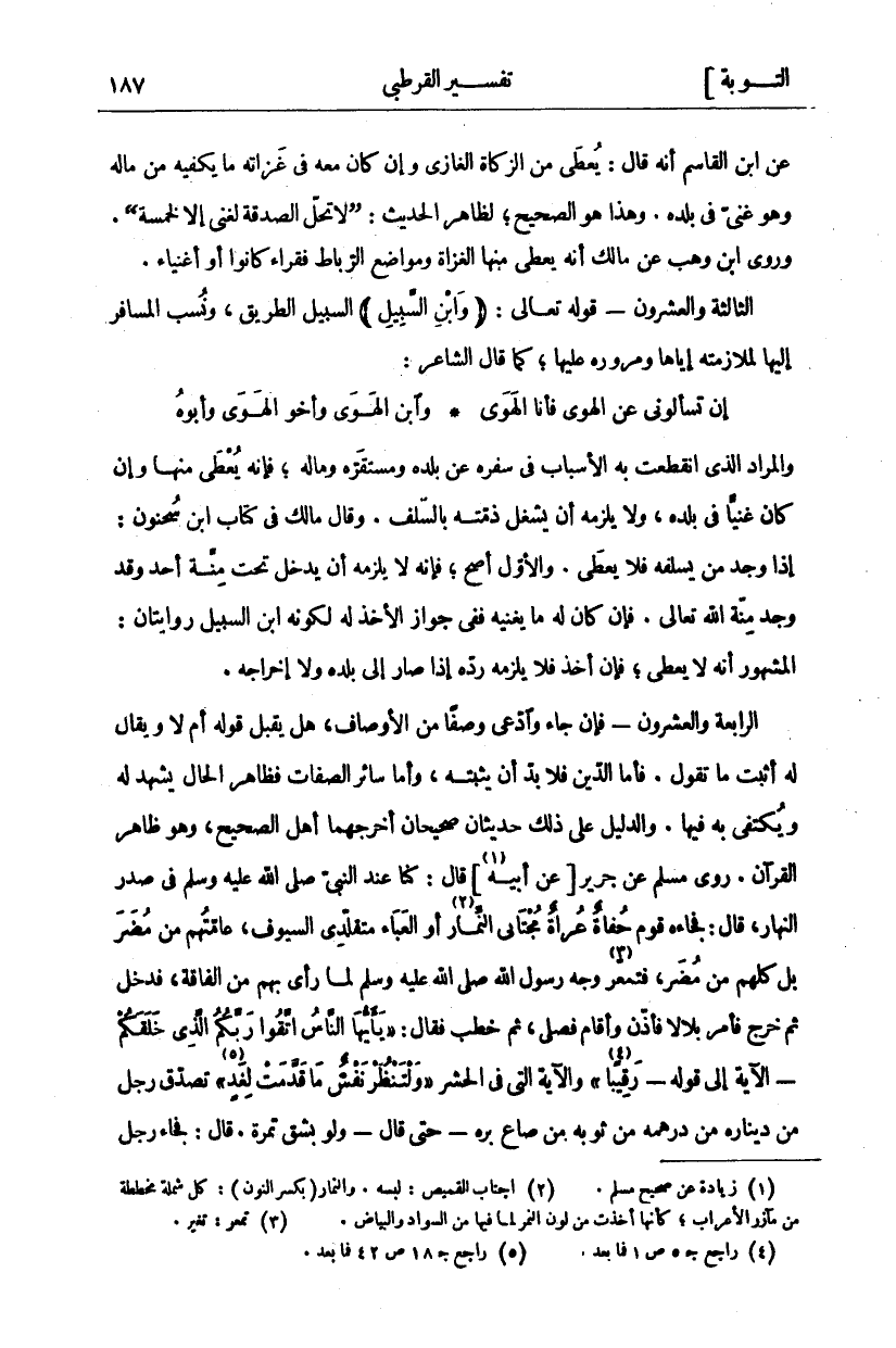 عَنِ ابْنِ الْقَاسِمِ أَنَّهُ قَالَ: يُعْطَى مِنَ الزَّكَاةِ الْغَازِي وَإِنْ كَانَ مَعَهُ فِي غَزَاتِهِ مَا يَكْفِيهِ مِنْ مَالِهِ وَهُوَ غَنِيٌّ فِي بَلَدِهِ. وَهَذَا هُوَ الصَّحِيحُ، لِظَاهِرِ الْحَدِيثِ: (لَا تَحِلُّ الصَّدَقَةُ لِغَنِيٍّ إِلَّا لِخَمْسَةٍ). وَرَوَى ابْنُ وَهْبٍ عَنْ مَالِكٍ أَنَّهُ يُعْطَى مِنْهَا الْغُزَاةُ وَمَوَاضِعُ الرِّبَاطِ فُقَرَاءَ كَانُوا أَوْ أَغْنِيَاءَ. الثَّالِثَةُ والعشرون- قوله تعالى: (وَابْنِ السَّبِيلِ) السَّبِيلُ الطَّرِيقُ، وَنُسِبَ الْمُسَافِرُ إِلَيْهَا لِمُلَازَمَتِهِ إِيَّاهَا وَمُرُورِهِ عَلَيْهَا، كَمَا قَالَ الشَّاعِرُ: