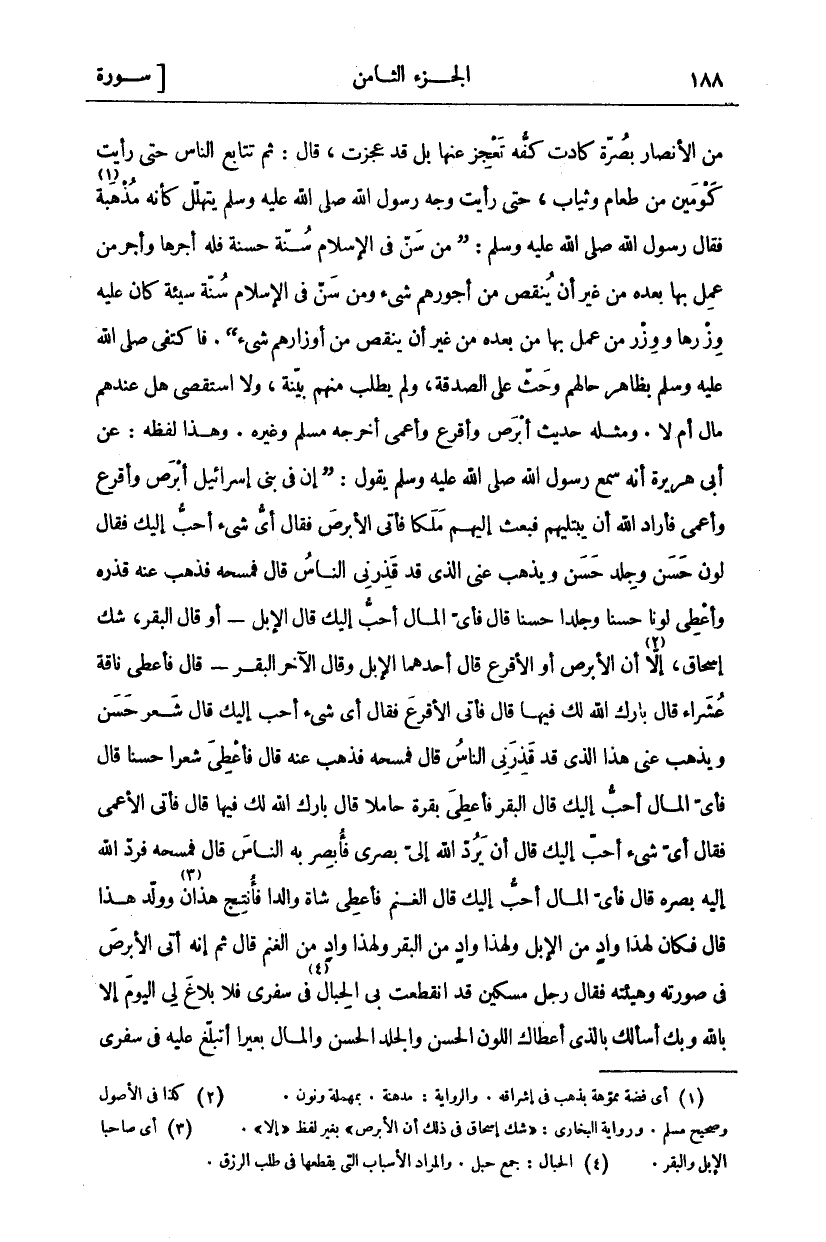 مِنَ الْأَنْصَارِ بِصُرَّةٍ كَادَتْ كَفُّهُ تَعْجِزُ عَنْهَا بَلْ قَدْ عَجَزَتْ، قَالَ: ثُمَّ تَتَابَعَ النَّاسُ حَتَّى رَأَيْتُ كَوْمَيْنِ مِنْ طَعَامٍ وَثِيَابٍ، حَتَّى رَأَيْتُ وَجْهُ رَسُولِ اللَّهِ صَلَّى اللَّهُ عَلَيْهِ وَسَلَّمَ يَتَهَلَّلُ كَأَنَّهُ مُذْهَبَةٌ «١» فَقَالَ رَسُولُ اللَّهِ صَلَّى اللَّهُ عَلَيْهِ وَسَلَّمَ: (مَنْ سَنَّ فِي الْإِسْلَامِ سُنَّةً حَسَنَةً فَلَهُ أَجْرُهَا وَأَجْرُ مَنْ عَمِلَ بِهَا بَعْدِهِ مِنْ غَيْرِ أَنْ يَنْقُصَ مِنْ أُجُورِهِمْ شي وَمَنْ سَنَّ فِي الْإِسْلَامِ سُنَّةً سَيِّئَةً كَانَ عليه وزر ها وَوِزْرُ مَنْ عَمِلَ بِهَا مِنْ بَعْدِهِ مِنْ غبر أن ينقص من أوزار هم شي (. فَاكْتَفَى صَلَّى اللَّهُ عَلَيْهِ وَسَلَّمَ بِظَاهِرِ حَالِهِمْ وَحَثَّ عَلَى الصَّدَقَةِ، وَلَمْ يَطْلُبْ مِنْهُمْ بَيِّنَةً، ولا استقصى هل عند هم مَالٌ أَمْ لَا. وَمِثْلُهُ حَدِيثُ أَبْرَصَ وَأَقْرَعَ وَأَعْمَى أَخْرَجَهُ مُسْلِمٌ وَغَيْرُهُ. وَهَذَا لَفْظُهُ: عَنْ أَبِي هُرَيْرَةَ أَنَّهُ سَمِعَ رَسُولَ اللَّهِ صَلَّى اللَّهُ عَلَيْهِ وَسَلَّمَ يقول: (إن فِي بَنِي إِسْرَائِيلَ أَبْرَصُ وَأَقْرَعُ وَأَعْمَى فَأَرَادَ اللَّهُ أَنْ يَبْتَلِيَهُمْ فَبَعَثَ إِلَيْهِمْ مَلَكًا فَأَتَى الأبرص فقال أي شي أَحَبُّ إِلَيْكَ فَقَالَ لَوْنٌ حَسَنٌ وَجِلْدٌ حَسَنٌ وَيَذْهَبُ عَنِّي الَّذِي قَدْ قَذِرَنِي النَّاسُ قَالَ فَمَسَحَهُ فَذَهَبَ عَنْهُ قَذَرُهُ وَأُعْطِيَ لَوْنًا حَسَنًا وَجِلْدًا حَسَنًا قَالَ فَأَيُّ الْمَالِ أَحَبُّ إِلَيْكَ قَالَ الْإِبِلُ- أَوْ قَالَ الْبَقَرُ، شَكَّ إِسْحَاقُ، إِلَّا «٢» أَنَّ الْأَبْرَصَ أَوِ الْأَقْرَعَ قَالَ أَحَدُهُمَا الْإِبِلُ وَقَالَ الْآخَرُ الْبَقَرُ- قَالَ فَأُعْطِيَ نَاقَةً عُشَرَاءَ قَالَ بَارَكَ اللَّهُ لَكَ فِيهَا قَالَ فأتى الأقرع فقال أي شي أَحَبُّ إِلَيْكَ قَالَ شَعْرٌ حَسَنٌ وَيَذْهَبُ عَنِّي هَذَا الَّذِي قَدْ قَذِرَنِي النَّاسُ قَالَ فَمَسَحَهُ فَذَهَبَ عَنْهُ قَالَ فَأُعْطِيَ شَعْرًا حَسَنًا قَالَ فَأَيُّ الْمَالِ أَحَبُّ إِلَيْكَ قَالَ الْبَقَرُ فَأُعْطِيَ بَقَرَةً حَامِلًا قَالَ بَارَكَ اللَّهُ لَكَ فِيهَا قال فأتى الأعمى فقال أي شي أَحَبُّ إِلَيْكَ قَالَ أَنْ يَرُدَّ اللَّهُ إِلَيَّ بَصَرِي فَأُبْصِرَ بِهِ النَّاسَ قَالَ فَمَسَحَهُ فَرَدَّ اللَّهُ إِلَيْهِ بَصَرَهُ قَالَ فَأَيُّ الْمَالِ أَحَبُّ إِلَيْكَ قَالَ الْغَنَمُ فَأُعْطِيَ شَاةً وَالِدًا فَأُنْتِجَ هَذَانَ «٣» وَوَلَّدَ هَذَا قَالَ فَكَانَ لِهَذَا وَادٍ مِنَ الْإِبِلِ وَلِهَذَا وَادٍ مِنَ الْبَقَرِ وَلِهَذَا وَادٍ مِنَ الْغَنَمِ قَالَ ثُمَّ إِنَّهُ أَتَى الْأَبْرَصَ فِي صُورَتِهِ وَهَيْئَتِهِ فَقَالَ رَجُلٌ مِسْكِينٌ قَدِ انْقَطَعَتْ بِي الْحِبَالُ «٤» فِي سَفَرِي فَلَا بَلَاغَ لِي الْيَوْمَ إِلَّا بِاللَّهِ وَبِكَ أَسْأَلُكَ بِالَّذِي أَعْطَاكَ اللَّوْنَ الْحَسَنَ وَالْجِلْدَ الْحَسَنَ وَالْمَالَ بعيرا أتبلغ عليه في سفري