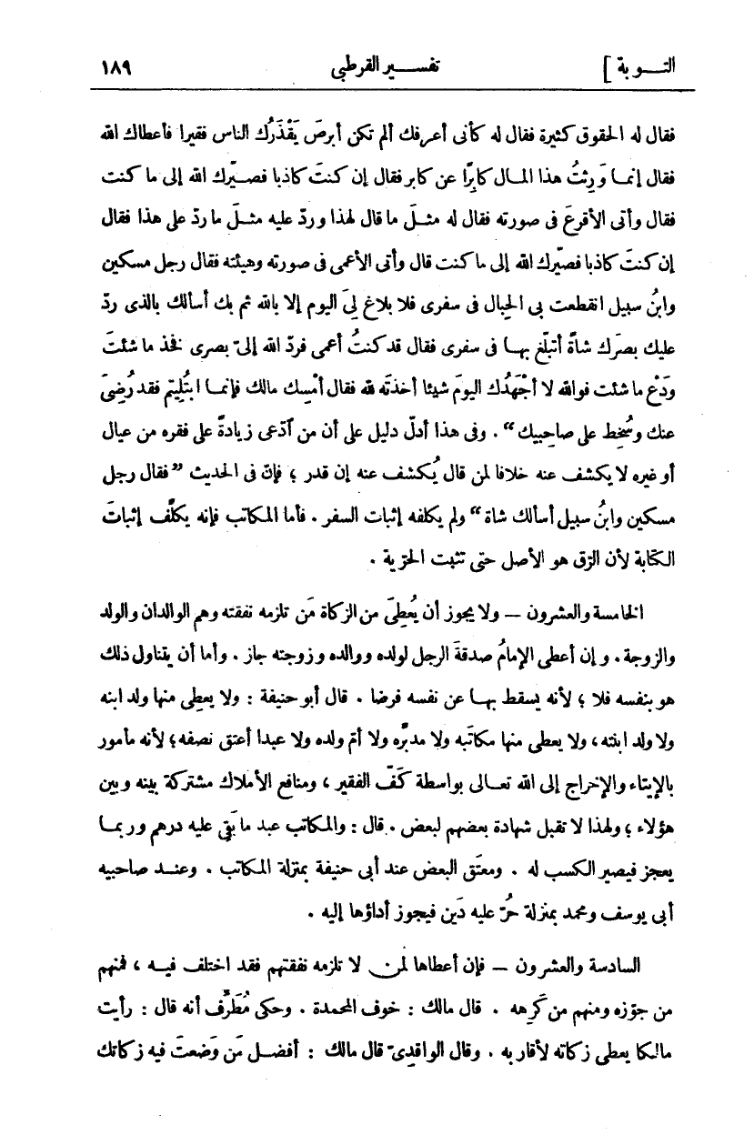 فَقَالَ لَهُ الْحُقُوقُ كَثِيرَةٌ فَقَالَ لَهُ كَأَنِّي أَعْرِفُكَ أَلَمْ تَكُنْ أَبْرَصَ يَقْذَرُكَ النَّاسُ فَقِيرًا فَأَعْطَاكَ اللَّهُ فَقَالَ إِنَّمَا وَرِثْتُ هَذَا الْمَالَ كَابِرًا عَنْ كَابِرٍ فَقَالَ إِنْ كُنْتَ كَاذِبًا فَصَيَّرَكَ اللَّهُ إِلَى مَا كُنْتَ فَقَالَ وَأَتَى الْأَقْرَعَ فِي صُورَتِهِ فَقَالَ لَهُ مِثْلَ مَا قَالَ لِهَذَا وَرَدَّ عَلَيْهِ مِثْلَ مَا رَدَّ عَلَى هَذَا فَقَالَ إِنْ كُنْتَ كَاذِبًا فَصَيَّرَكَ اللَّهُ إِلَى مَا كُنْتَ قَالَ وَأَتَى الْأَعْمَى فِي صُورَتِهِ وَهَيْئَتِهِ فَقَالَ رَجُلٌ مِسْكِينٌ وَابْنُ سَبِيلٍ انْقَطَعَتْ بِي الْحِبَالُ فِي سَفَرِي فَلَا بَلَاغَ لِي الْيَوْمَ إِلَّا بِاللَّهِ ثُمَّ بِكَ أَسْأَلُكَ بِالَّذِي رَدَّ عَلَيْكَ بَصَرَكَ شَاةً أَتَبَلَّغُ بِهَا فِي سَفَرِي فَقَالَ قَدْ كُنْتُ أَعْمَى فَرَدَّ اللَّهُ إِلَيَّ بَصَرِي فَخُذْ مَا شِئْتَ وَدَعْ مَا شِئْتَ فَوَاللَّهِ لَا أَجْهَدُكَ الْيَوْمَ شَيْئًا أَخَذْتَهُ لِلَّهِ فَقَالَ أَمْسِكْ مَالَكَ فَإِنَّمَا ابْتُلِيتُمْ فَقَدْ رُضِيَ عَنْكَ وَسُخِطَ عَلَى صَاحِبَيْكَ (. وَفِي هَذَا أَدَلُّ دَلِيلٍ عَلَى أَنَّ مَنِ ادَّعَى زِيَادَةً عَلَى فَقْرِهِ مِنْ عِيَالٍ أَوْ غَيْرِهِ لَا يُكْشَفُ عَنْهُ خِلَافًا لِمَنْ قَالَ يُكْشَفُ عَنْهُ إِنْ قُدِرَ، فَإِنَّ فِي الْحَدِيثِ (فَقَالَ رَجُلٌ مِسْكِينٌ وَابْنُ سَبِيلٍ أَسْأَلُكَ شَاةً) وَلَمْ يُكَلِّفْهُ إِثْبَاتَ السَّفَرِ. فَأَمَّا الْمُكَاتَبُ فَإِنَّهُ يُكَلَّفُ إِثْبَاتَ الْكِتَابَةِ لِأَنَّ الرِّقَّ هُوَ الْأَصْلُ حَتَّى تَثْبُتَ الْحُرِّيَّةُ. الْخَامِسَةُ وَالْعِشْرُونَ- وَلَا يَجُوزُ أَنْ يُعْطِيَ مِنَ الزَّكَاةِ مِنْ تَلْزَمُهُ نَفَقَتُهُ وَهُمُ الْوَالِدَانِ وَالْوَلَدُ وَالزَّوْجَةُ. وَإِنْ أَعْطَى الْإِمَامُ صَدَقَةَ الرَّجُلِ لِوَلَدِهِ وَوَالِدِهِ وَزَوْجَتِهِ جَازَ. وَأَمَّا أن يتناول ذلك هو نفسه فَلَا، لِأَنَّهُ يُسْقِطُ بِهَا عَنْ نَفْسِهِ فَرْضًا. قَالَ أَبُو حَنِيفَةَ: وَلَا يُعْطِي مِنْهَا وَلَدَ ابْنِهِ وَلَا وَلَدَ ابْنَتِهِ، وَلَا يُعْطِي مِنْهَا مُكَاتَبَهُ وَلَا مُدَّبَّرَهُ وَلَا أُمَّ وَلَدِهِ وَلَا عَبْدًا أَعْتَقَ نِصْفَهُ، لِأَنَّهُ مَأْمُورٌ بِالْإِيتَاءِ وَالْإِخْرَاجِ إِلَى اللَّهِ تَعَالَى بِوَاسِطَةِ كَفِّ الْفَقِيرِ، وَمَنَافِعُ الْأَمْلَاكِ مُشْتَرَكَةٌ بَيْنَهُ وَبَيْنَ هَؤُلَاءِ، وَلِهَذَا لَا تُقْبَلُ شَهَادَةُ بَعْضِهِمْ لِبَعْضٍ. قَالَ: وَالْمُكَاتَبُ عَبْدٌ ما بقي عليه در هم وَرُبَّمَا يَعْجِزُ فَيَصِيرُ الْكَسْبُ لَهُ. وَمُعْتَقُ الْبَعْضِ عِنْدَ أَبِي حَنِيفَةَ بِمَنْزِلَةِ الْمُكَاتَبِ. وَعِنْدَ صَاحِبَيْهِ أَبِي يُوسُفَ وَمُحَمَّدٍ بِمَنْزِلَةِ حُرٍّ عَلَيْهِ دَيْنٌ فَيَجُوزُ أَدَاؤُهَا إِلَيْهِ. السَّادِسَةُ وَالْعِشْرُونَ- فَإِنْ أَعْطَاهَا لِمَنْ لَا تَلْزَمُهُ نَفَقَتُهُمْ فَقَدِ اخْتُلِفَ فِيهِ، فَمِنْهُمْ مَنْ جَوَّزَهُ وَمِنْهُمْ مَنْ كَرِهَهُ. قَالَ مَالِكٌ: خَوْفُ الْمَحْمَدَةِ. وَحَكَى مُطَرِّفٌ أَنَّهُ قَالَ: رَأَيْتُ مَالِكًا يُعْطِي زَكَاتَهُ لِأَقَارِبِهِ. وَقَالَ الْوَاقِدِيُّ قَالَ مَالِكٌ: أَفْضَلُ مَنْ وَضَعْتَ فِيهِ زَكَاتَكَ