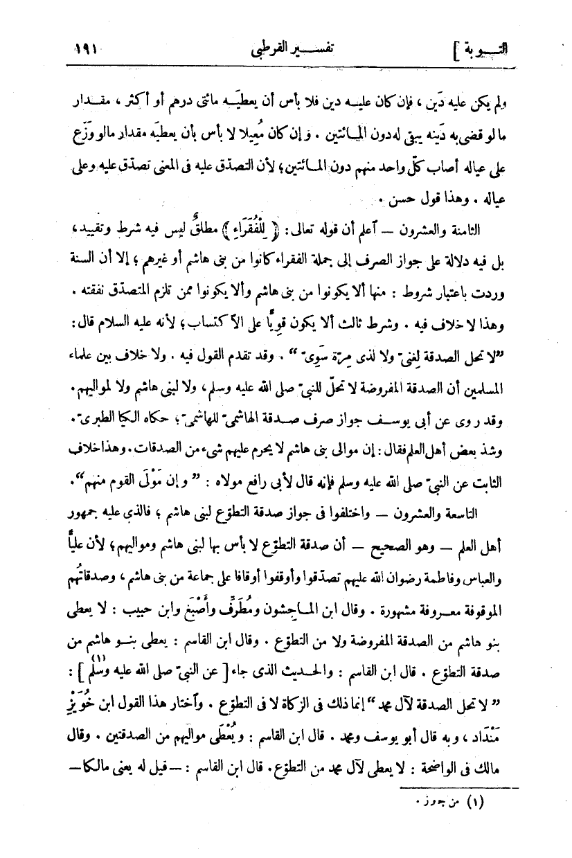 وَلَمْ يَكُنْ عَلَيْهِ دَيْنٌ، فَإِنْ كَانَ عَلَيْهِ دين فلا بأس أن يعطيه مائتي در هم أَوْ أَكْثَرَ، مِقْدَارَ مَا لَوْ قَضَى بِهِ دَيْنَهُ يَبْقَى لَهُ دُونَ الْمِائَتَيْنِ. وَإِنْ كَانَ مُعِيلًا لَا بَأْسَ بِأَنْ يُعْطِيَهُ مِقْدَارَ مَا لَوْ وُزِّعَ عَلَى عِيَالِهِ أَصَابَ كُلُّ وَاحِدٍ مِنْهُمْ دُونَ الْمِائَتَيْنِ، لِأَنَّ التَّصَدُّقَ عَلَيْهِ فِي الْمَعْنَى تَصَدُّقٌ عَلَيْهِ وَعَلَى عِيَالِهِ. وَهَذَا قَوْلٌ حَسَنٌ. الثَّامِنَةُ وَالْعِشْرُونَ- اعْلَمْ أَنَّ قَوْلَهُ تَعَالَى: (لِلْفُقَراءِ) مُطْلَقٌ لَيْسَ فِيهِ شَرْطٌ وَتَقْيِيدٌ، بَلْ فِيهِ دَلَالَةٌ عَلَى جَوَازِ الصَّرْفِ إِلَى جُمْلَةِ الفقراء كانوا من بني هاشم أو غير هم إِلَّا أَنَّ السُّنَّةَ وَرَدَتْ بِاعْتِبَارِ شُرُوطٍ: مِنْهَا أَلَّا يَكُونُوا مِنْ بَنِي هَاشِمٍ وَأَلَّا يَكُونُوا مِمَّنْ تَلْزَمُ الْمُتَصَدِّقَ نَفَقَتُهُ. وَهَذَا لَا خِلَافَ فِيهِ. وَشَرْطٌ ثَالِثٌ أَلَّا يَكُونَ قَوِيًّا عَلَى الاكتاسب لأنه عيه السَّلَامُ قَالَ: (لَا تَحِلُّ الصَّدَقَةُ لِغَنِيٍّ وَلَا لِذِي مِرَّةٍ سَوِيٍّ). وَقَدْ تَقَدَّمَ الْقَوْلُ فِيهِ. وَلَا خِلَافَ بَيْنِ عُلَمَاءِ الْمُسْلِمِينَ أَنَّ الصَّدَقَةَ الْمَفْرُوضَةَ لَا تَحِلُّ لِلنَّبِيِّ صَلَّى اللَّهُ عَلَيْهِ وَسَلَّمَ وَلَا لِبَنِي هَاشِمٍ وَلَا لِمَوَالِيهِمْ. وَقَدْ روى عن أبي يوسف صَرْفِ صَدَقَةِ الْهَاشِمِيِّ لِلْهَاشِمِيِّ: حَكَاهُ الْكِيَا الطَّبَرِيُّ. وَشَذَّ بَعْضُ أَهْلِ الْعِلْمِ فَقَالَ: إِنَّ مَوَالِيَ بني هاشم لا يحرم عليهم شي مِنَ الصَّدَقَاتِ. وَهَذَا خِلَافُ الثَّابِتِ عَنِ النَّبِيِّ صَلَّى اللَّهُ عَلَيْهِ وَسَلَّمَ فَإِنَّهُ قَالَ لِأَبِي رَافِعٍ مَوْلَاهُ: (وَإِنَّ مَوْلَى الْقَوْمِ مِنْهُمْ). التَّاسِعَةُ وَالْعِشْرُونَ- وَاخْتَلَفُوا فِي جَوَازِ صَدَقَةِ التَّطَوُّعِ لِبَنِي هَاشِمٍ، فَالَّذِي عَلَيْهِ جُمْهُورُ أَهْلِ الْعِلْمِ- وَهُوَ الصَّحِيحُ- أَنَّ صَدَقَةَ التَّطَوُّعِ لَا بَأْسَ بِهَا لِبَنِي هَاشِمٍ وَمَوَالِيهِمْ، لِأَنَّ عَلِيًّا وَالْعَبَّاسَ وَفَاطِمَةَ رِضْوَانُ اللَّهِ عَلَيْهِمْ تَصَدَّقُوا وَأَوْقَفُوا أَوْقَافًا عَلَى جماعة من بني هاشم، وصدقا تهم الْمَوْقُوفَةُ مَعْرُوفَةٌ مَشْهُورَةٌ. وَقَالَ ابْنُ الْمَاجِشُونَ وَمُطَرِّفٌ وَأَصْبَغُ وَابْنُ حَبِيبٍ: لَا يُعْطَى بَنُو هَاشِمٍ مِنَ الصَّدَقَةِ الْمَفْرُوضَةِ وَلَا مِنَ التَّطَوُّعِ. وَقَالَ ابْنُ الْقَاسِمِ: يُعْطَى بَنُو هَاشِمٍ مِنْ صَدَقَةِ التَّطَوُّعِ. قَالَ ابْنُ الْقَاسِمِ: وَالْحَدِيثُ الَّذِي جَاءَ [عَنِ النَّبِيِّ صَلَّى اللَّهُ عَلَيْهِ وَسَلَّمَ «١»]: (لَا تَحِلُّ الصَّدَقَةُ لِآلِ مُحَمَّدٍ) إِنَّمَا ذَلِكَ فِي الزَّكَاةِ لَا فِي التَّطَوُّعِ. وَاخْتَارَ هَذَا الْقَوْلَ ابن خويز منداد، وَبِهِ قَالَ أَبُو يُوسُفَ وَمُحَمَّدٌ. قَالَ ابْنُ الْقَاسِمِ: وَيُعْطَى مَوَالِيهِمْ مِنَ الصَّدَقَتَيْنِ. وَقَالَ مَالِكٌ فِي الْوَاضِحَةِ: لَا يُعْطَى لِآلِ مُحَمَّدٍ مِنَ التَّطَوُّعِ. قَالَ ابْنُ الْقَاسِمِ:- قِيلَ لَهُ يَعْنِي مالكا-