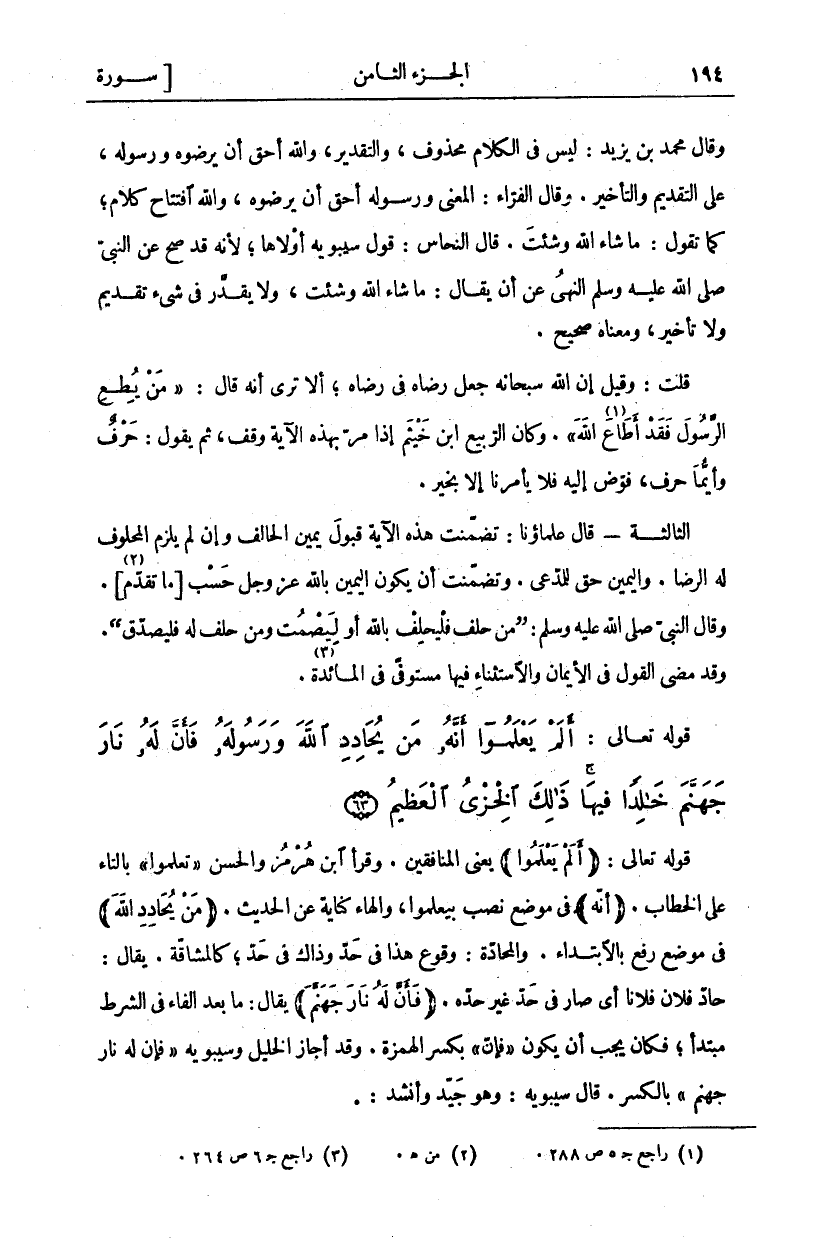 قَوْلُهُ تَعَالَى: (أَلَمْ يَعْلَمُوا) يَعْنِي الْمُنَافِقِينَ. وَقَرَأَ ابْنُ هُرْمُزَ وَالْحَسَنُ" تَعْلَمُوا" بِالتَّاءِ على الخطاب. (أَنَّهُ) في موضع نصب بيعلموا، وَالْهَاءُ كِنَايَةُ عَنِ الْحَدِيثِ. (مَنْ يُحَادِدِ اللَّهَ) فِي مَوْضِعِ رَفْعٍ بِالِابْتِدَاءِ. وَالْمُحَادَّةُ: وُقُوعُ هَذَا فِي حَدٍّ وَذَاكَ فِي حَدٍّ، كَالْمُشَاقَّةِ. يُقَالُ: حَادَّ فُلَانٌ فُلَانًا أَيْ صَارَ فِي حَدٍّ غَيْرِ حَدِّهِ. (فَأَنَّ لَهُ نارَ جَهَنَّمَ) يُقَالُ: مَا بَعْدَ الْفَاءِ فِي الشَّرْطِ مُبْتَدَأٌ، فَكَانَ يَجِبُ أَنْ يَكُونَ" فَإِنَّ" بِكَسْرِ الْهَمْزَةِ. وَقَدْ أَجَازَ الْخَلِيلُ وَسِيبَوَيْهِ" فَأَنَّ لَهُ نارَ جَهَنَّمَ" بالكسر. قال سيبويه: وهو جيد وأنشد: