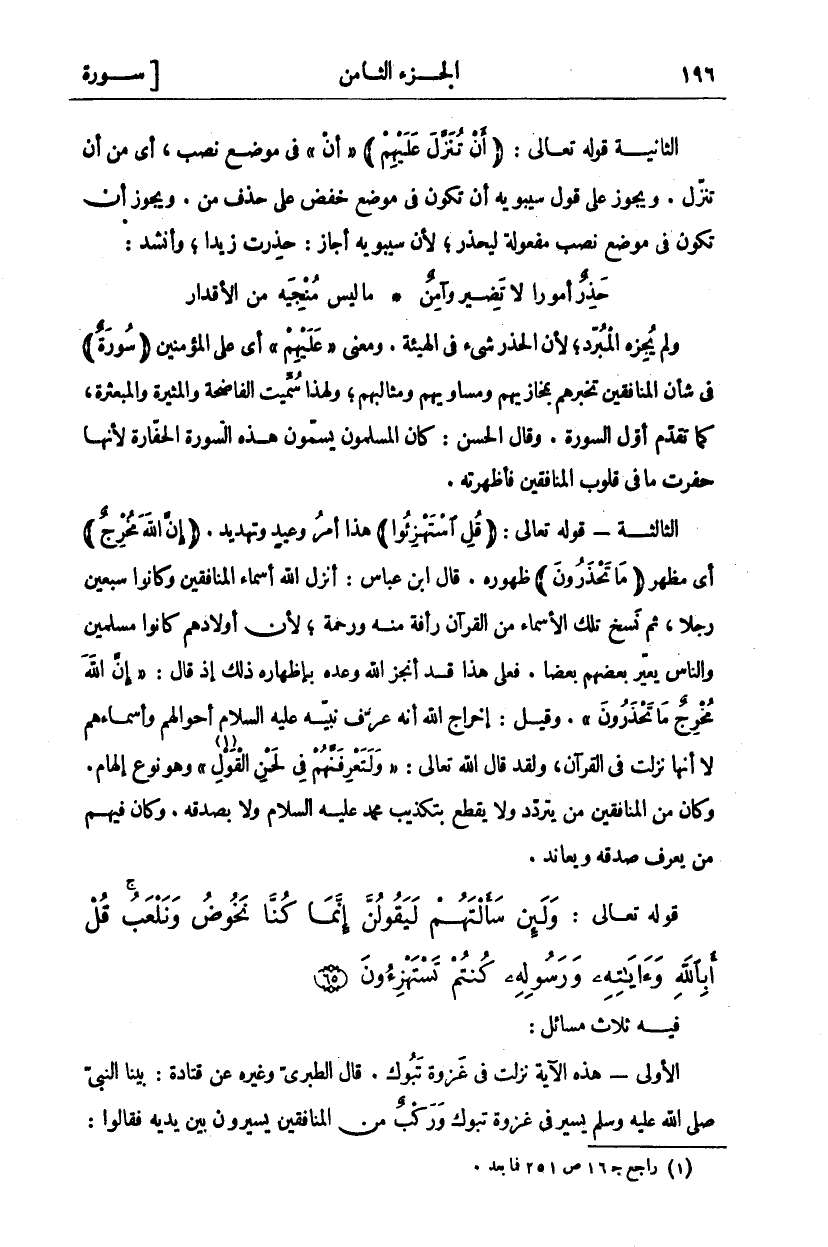 فِيهِ ثَلَاثُ مَسَائِلَ: الْأُولَى- هَذِهِ الْآيَةُ نَزَلَتْ فِي غَزْوَةِ تَبُوكَ. قَالَ الطَّبَرِيُّ وَغَيْرُهُ عَنْ قَتَادَةَ: بَيْنَا النَّبِيُّ صَلَّى اللَّهُ عَلَيْهِ وَسَلَّمَ يَسِيرُ فِي غَزْوَةِ تَبُوكَ وَرَكْبٌ مِنَ الْمُنَافِقِينَ يسيرون بين يديه فقالوا: