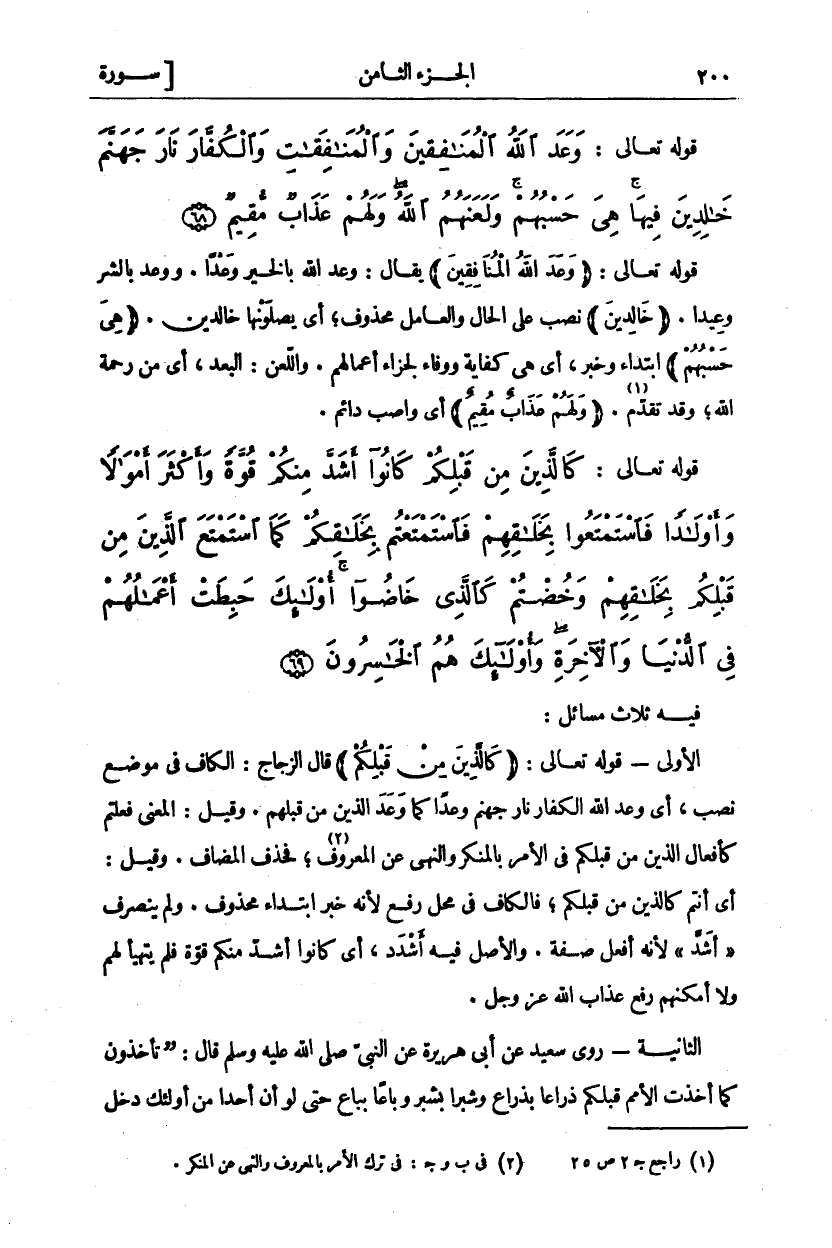 فِيهِ ثَلَاثُ مَسَائِلَ: الْأُولَى- قَوْلُهُ تَعَالَى:" كَالَّذِينَ مِنْ قَبْلِكُمْ" قَالَ الزَّجَّاجُ: الْكَافُ فِي مَوْضِعِ نَصْبٍ، أَيْ وَعَدَ اللَّهُ الْكُفَّارَ نَارَ جَهَنَّمَ وَعْدًا كَمَا وَعَدَ الَّذِينَ مِنْ قَبْلِهِمْ. وَقِيلَ: الْمَعْنَى فَعَلْتُمْ كَأَفْعَالِ الَّذِينَ مِنْ قَبْلِكُمْ فِي الْأَمْرِ بِالْمُنْكَرِ وَالنَّهْيِ عَنِ الْمَعْرُوفِ «٢»، فَحَذَفَ الْمُضَافَ. وَقِيلَ: أَيْ أَنْتُمْ كَالَّذِينَ مِنْ قَبْلِكُمْ، فَالْكَافُ فِي مَحَلِّ رَفْعٍ لِأَنَّهُ خَبَرُ ابْتِدَاءٍ مَحْذُوفٍ. وَلَمْ يَنْصَرِفْ" أَشَدَّ" لِأَنَّهُ أَفْعَلُ صِفَةٌ. وَالْأَصْلُ فِيهِ أَشْدَدُ، أَيْ كَانُوا أَشَدَّ مِنْكُمْ قُوَّةً فَلَمْ يَتَهَيَّأْ لَهُمْ ولا أمكنهم رفع عذاب الله عَزَّ وَجَلَّ. الثَّانِيَةُ- رَوَى سَعِيدٌ عَنْ أَبِي هُرَيْرَةَ عَنِ النَّبِيِّ صَلَّى اللَّهُ عَلَيْهِ وَسَلَّمَ قَالَ (تَأْخُذُونَ كَمَا أَخَذَتِ الْأُمَمُ قَبْلَكُمْ ذِرَاعًا بِذِرَاعٍ وَشِبْرًا بِشِبْرٍ وَبَاعًا بِبَاعٍ حَتَّى لَوْ أن أحدا من أولئك دخل