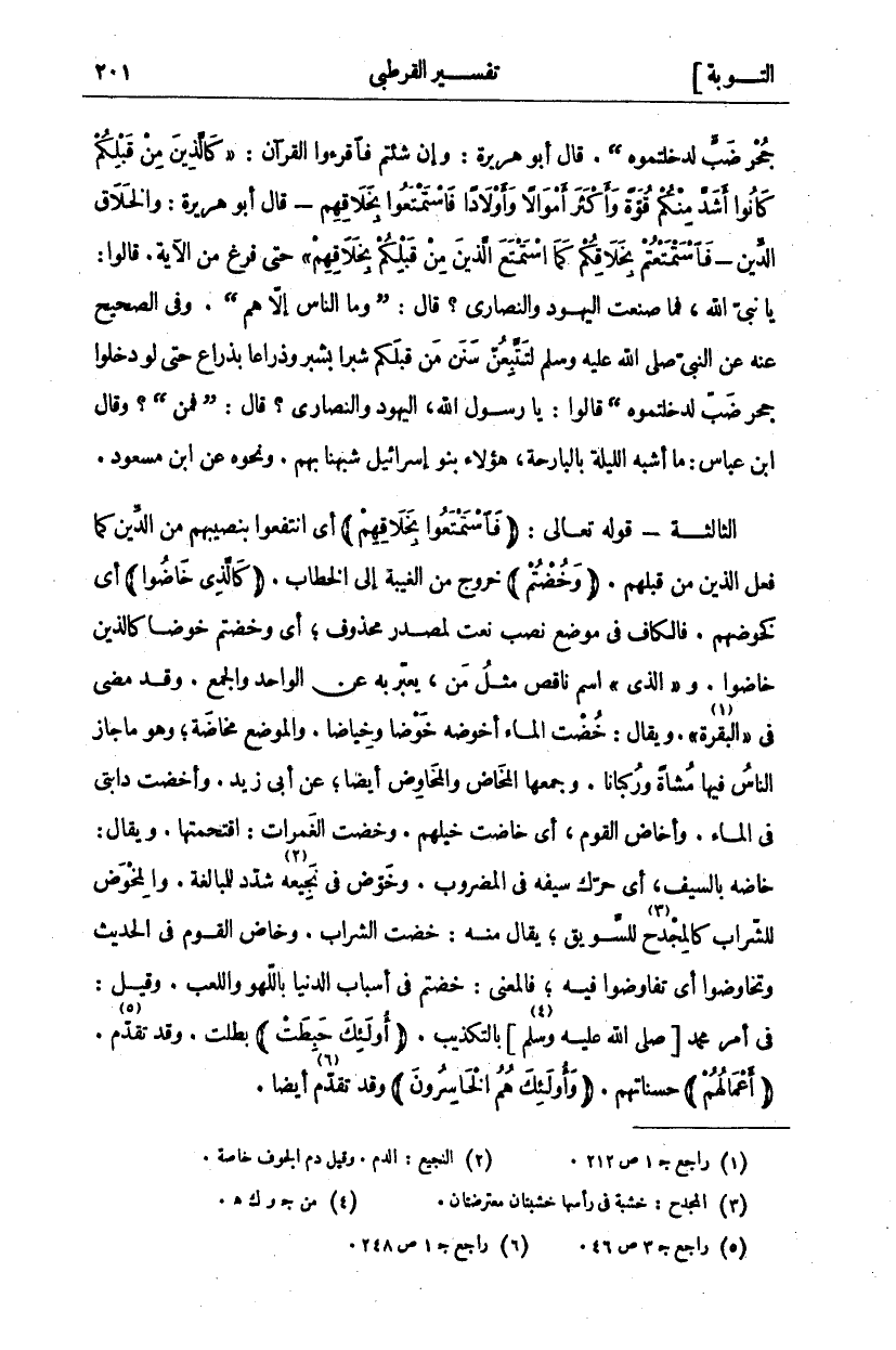 جُحْرَ ضَبٍّ لَدَخَلْتُمُوهُ (. قَالَ أَبُو هُرَيْرَةَ: وَإِنْ شِئْتُمْ فَاقْرَءُوا الْقُرْآنَ:" كَالَّذِينَ مِنْ قَبْلِكُمْ كانُوا أَشَدَّ مِنْكُمْ قُوَّةً وَأَكْثَرَ أَمْوالًا وَأَوْلاداً فَاسْتَمْتَعُوا بِخَلاقِهِمْ" قَالَ أَبُو هُرَيْرَةَ: وَالْخَلَاقُ، الدِّينُ- فَاسْتَمْتَعْتُمْ بِخَلَاقِكُمْ كَمَا اسْتَمْتَعَ الَّذِينَ مِنْ قَبْلِكُمْ بِخَلَاقِهِمْ حَتَّى فَرَغَ مِنَ الْآيَةِ. قَالُوا: يَا نَبِيَّ اللَّهِ، فَمَا صَنَعَتِ الْيَهُودُ وَالنَّصَارَى؟ قَالَ: (وَمَا النَّاسُ إِلَّا هُمْ). وَفِي الصَّحِيحِ عَنْهُ عَنِ النَّبِيِّ صَلَّى اللَّهُ عَلَيْهِ وَسَلَّمَ (لَتَتَّبِعُنَّ سَنَنَّ مَنْ قَبْلَكُمْ شِبْرًا بِشِبْرٍ وَذِرَاعًا بِذِرَاعٍ حَتَّى لَوْ دَخَلُوا جُحْرَ ضَبٍّ لَدَخَلْتُمُوهُ) قَالُوا: يَا رَسُولَ اللَّهِ، الْيَهُودُ وَالنَّصَارَى؟ قَالَ: (فَمَنْ)؟ وَقَالَ ابْنُ عَبَّاسٍ: مَا أَشْبَهَ اللَّيْلَةَ بِالْبَارِحَةِ، هَؤُلَاءِ بَنُو إِسْرَائِيلَ شُبِّهْنَا بِهِمْ. وَنَحْوَهُ عَنِ ابْنِ مسعود. الثالثة- قوله تعالى:" فَاسْتَمْتَعُوا بِخَلاقِهِمْ" أَيِ انْتَفَعُوا بِنَصِيبِهِمْ مِنَ الدِّينِ كَمَا فَعَلَ الَّذِينَ مِنْ قَبْلِهِمْ." وَخُضْتُمْ" خُرُوجٌ مِنَ الْغَيْبَةِ إِلَى الْخِطَابِ." كَالَّذِي خاضُوا" أَيْ كَخَوْضِهِمْ. فَالْكَافُ فِي مَوْضِعِ نَصْبٍ نَعْتٌ لِمَصْدَرٍ مَحْذُوفٍ، أَيْ وَخُضْتُمْ خَوْضًا كَالَّذِينَ خَاضُوا. وَ" الَّذِي" اسْمٌ نَاقِصٌ مِثْلُ مَنْ، يُعَبَّرُ بِهِ عَنِ الْوَاحِدِ وَالْجَمْعِ. وَقَدْ مَضَى فِي (الْبَقَرَةِ) «١». وَيُقَالُ: خُضْتُ الْمَاءَ أَخُوضُهُ خَوْضًا وَخِيَاضًا. وَالْمَوْضِعُ مَخَاضَةٌ، وَهُوَ مَا جَازَ النَّاسُ فِيهَا مُشَاةً وَرُكْبَانًا. وَجَمْعُهَا الْمَخَاضُ وَالْمَخَاوِضُ أَيْضًا، عَنْ أَبِي زَيْدٍ. وَأَخَضْتُ دَابَّتِي فِي الْمَاءِ. وَأَخَاضَ الْقَوْمُ، أَيْ خَاضَتْ خَيْلُهُمْ. وَخُضْتُ الْغَمَرَاتِ: اقْتَحَمْتُهَا. وَيُقَالُ: خَاضَهُ بِالسَّيْفِ، أَيْ حَرَّكَ سَيْفَهُ فِي الْمَضْرُوبِ. وَخَوَّضَ فِي نَجِيعِهِ «٢» شَدَّدَ لِلْمُبَالَغَةِ. وَالْمِخْوَضُ لِلشَّرَابِ كالمجدح «٣» لِلسَّوِيقِ، يُقَالُ مِنْهُ: خُضْتُ الشَّرَابَ. وَخَاضَ الْقَوْمُ فِي الْحَدِيثِ وَتَخَاوَضُوا أَيْ تَفَاوَضُوا فِيهِ، فَالْمَعْنَى: خُضْتُمْ فِي أَسْبَابِ الدُّنْيَا بِاللَّهْوِ وَاللَّعِبِ. وَقِيلَ: فِي أَمْرِ مُحَمَّدٍ [صَلَّى اللَّهُ عَلَيْهِ وَسَلَّمَ «٤»] بِالتَّكْذِيبِ. (أُولئِكَ حَبِطَتْ) بَطَلَتْ وَقَدْ تَقَدَّمَ «٥». (أَعْمالُهُمْ) حَسَنَاتُهُمْ. (وَأُولئِكَ هُمُ الْخاسِرُونَ) وَقَدْ تَقَدَّمَ أَيْضًا «٦».