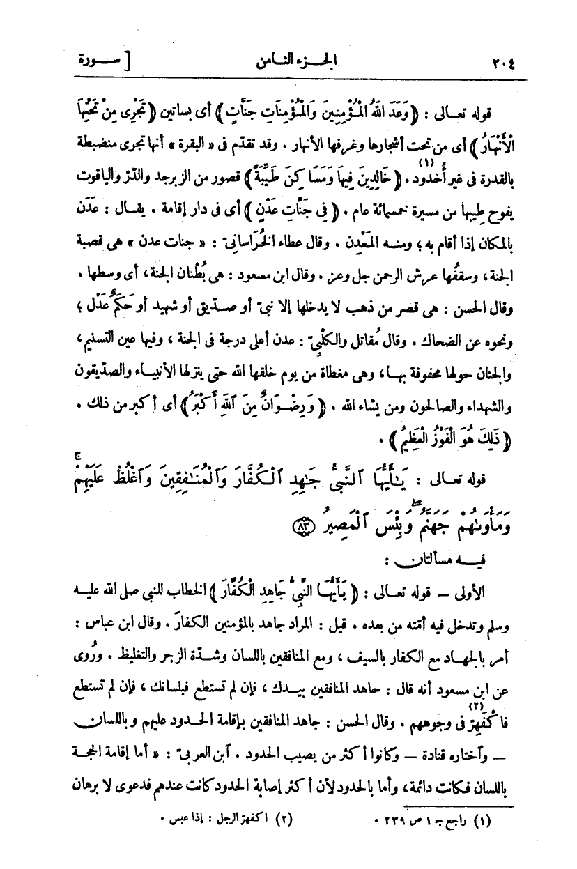 قَوْلُهُ تَعَالَى: (وَعَدَ اللَّهُ الْمُؤْمِنِينَ وَالْمُؤْمِناتِ جَنَّاتٍ) أَيْ بَسَاتِينَ (تَجْرِي مِنْ تَحْتِهَا الْأَنْهارُ) أَيْ مِنْ تَحْتِ أَشْجَارِهَا وَغُرَفِهَا الْأَنْهَارُ. وَقَدْ تَقَدَّمَ فِي" الْبَقَرَةِ" أَنَّهَا تَجْرِي مُنْضَبِطَةً بِالْقُدْرَةِ فِي غَيْرِ أُخْدُودٍ «١». (خالِدِينَ فِيها وَمَساكِنَ طَيِّبَةً) قُصُورٌ مِنَ الزَّبَرْجَدِ وَالدُّرِّ وَالْيَاقُوتِ يَفُوحُ طِيبُهَا مِنْ مَسِيرَةِ خَمْسِمِائَةِ عَامٍ. (فِي جَنَّاتِ عَدْنٍ) أَيْ فِي دَارِ إِقَامَةٍ. يُقَالُ: عَدَنَ بِالْمَكَانِ إِذَا أَقَامَ بِهِ، وَمِنْهُ الْمَعْدِنُ. وَقَالَ عَطَاءٌ الْخُرَاسَانِيُّ:" جَنَّاتِ عَدْنٍ" هِيَ قَصَبَةُ الْجَنَّةِ، وَسَقْفُهَا عَرْشُ الرحمن عز وجل. وَقَالَ ابْنُ مَسْعُودٍ: هِيَ بُطْنَانُ الْجَنَّةِ، أَيْ وَسَطُهَا. وَقَالَ الْحَسَنُ: هِيَ قَصْرٌ مِنْ ذَهَبٍ لَا يَدْخُلُهَا إِلَّا نَبِيٌّ أَوْ صِدِّيقٌ أَوْ شَهِيدٌ أَوْ حَكَمٌ عَدْلٌ، وَنَحْوَهُ عَنِ الضَّحَّاكِ. وَقَالَ مُقَاتِلٌ وَالْكَلْبِيُّ: عَدْنٍ أَعْلَى دَرَجَةٍ فِي الْجَنَّةِ، وَفِيهَا عَيْنُ التَّسْنِيمِ، وَالْجِنَانُ حَوْلَهَا مَحْفُوفَةٌ بِهَا، وَهِيَ مُغَطَّاةٌ مِنْ يَوْمِ خَلَقَهَا اللَّهُ حَتَّى يَنْزِلَهَا الْأَنْبِيَاءُ وَالصِّدِّيقُونَ وَالشُّهَدَاءُ وَالصَّالِحُونَ وَمَنْ يَشَاءُ اللَّهُ. (وَرِضْوَانٌ مِنَ اللَّهِ أَكْبَرُ) أَيْ أَكْبَرُ مِنْ ذَلِكَ." ذلِكَ هُوَ الْفَوْزُ الْعَظِيمُ".