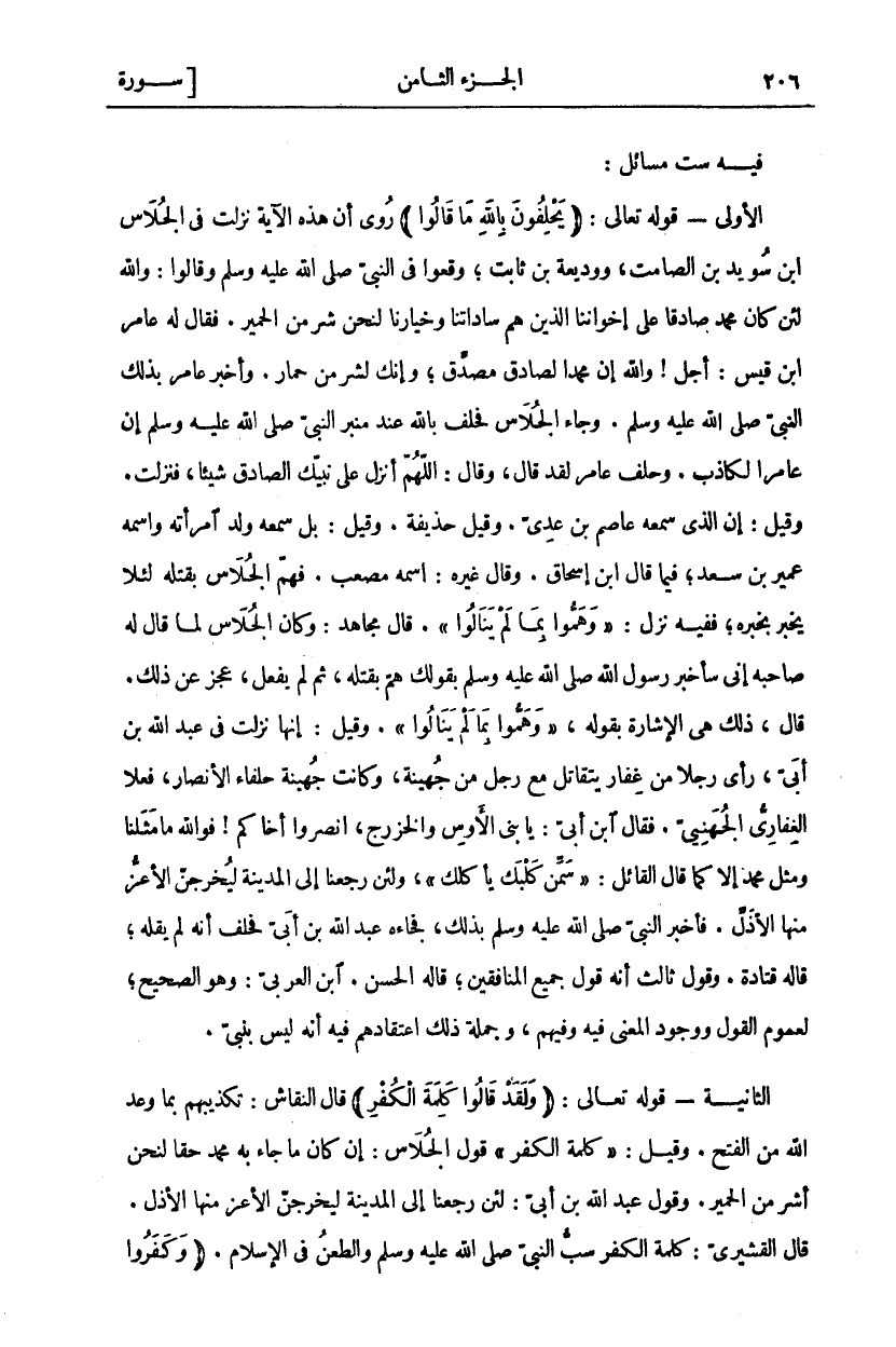 فِيهِ سِتُّ مَسَائِلَ: الْأُولَى- قَوْلُهُ تَعَالَى: (يَحْلِفُونَ بِاللَّهِ مَا قالُوا) رُوِيَ أَنَّ هَذِهِ الْآيَةَ نزلت في الجلاس ابن سُوَيْدِ بْنِ الصَّامِتِ، وَوَدِيعَةَ بْنِ ثَابِتٍ، وَقَعُوا فِي النَّبِيِّ صَلَّى اللَّهُ عَلَيْهِ وَسَلَّمَ وَقَالُوا: وَاللَّهِ لَئِنْ كَانَ مُحَمَّدٌ صَادِقًا عَلَى إِخْوَانِنَا الَّذِينَ هُمْ سَادَاتُنَا وَخِيَارُنَا لَنَحْنُ شَرٌّ مِنَ الحمير. فقال له عامر ابن قَيْسٍ: أَجَلْ! وَاللَّهِ إِنَّ مُحَمَّدًا لَصَادِقٌ مُصَدَّقٌ، وَإِنَّكَ لَشَرٌّ مِنْ حِمَارٍ. وَأَخْبَرَ عَامِرٌ بِذَلِكَ النَّبِيَّ صَلَّى اللَّهُ عَلَيْهِ وَسَلَّمَ. وَجَاءَ الْجُلَاسُ فَحَلَفَ بِاللَّهِ عِنْدَ مِنْبَرِ النَّبِيِّ صَلَّى اللَّهُ عَلَيْهِ وَسَلَّمَ إِنَّ عَامِرًا لَكَاذِبٌ. وَحَلَفَ عَامِرٌ لَقَدْ قَالَ، وَقَالَ: اللَّهُمَّ أَنْزِلْ عَلَى نَبِيِّكَ الصَّادِقِ شَيْئًا، فَنَزَلَتْ. وَقِيلَ: إِنَّ الَّذِي سَمِعَهُ عَاصِمُ بْنُ عَدِيٍّ. وَقِيلَ حُذَيْفَةُ. وَقِيلَ: بَلْ سَمِعَهُ وَلَدُ امْرَأَتِهِ وَاسْمُهُ عُمَيْرُ بْنُ سَعْدٍ، فِيمَا قَالَ ابْنُ إِسْحَاقَ. وَقَالَ غَيْرُهُ: اسْمُهُ مُصْعَبٌ. فَهَمَّ الْجُلَاسُ بِقَتْلِهِ لِئَلَّا يُخْبِرَ بِخَبَرِهِ، فَفِيهِ نَزَلَ:" وَهَمُّوا بِمَا لَمْ يَنَالُوا". قَالَ مُجَاهِدٌ: وَكَانَ الْجُلَاسُ لَمَّا قَالَ لَهُ صَاحِبُهُ إِنِّي سَأُخْبِرُ رَسُولَ اللَّهِ صَلَّى اللَّهُ عَلَيْهِ وَسَلَّمَ بِقَوْلِكَ هَمَّ بِقَتْلِهِ، ثُمَّ لَمْ يَفْعَلْ، عَجَزَ عَنْ ذَلِكَ. قَالَ، ذَلِكَ هِيَ الْإِشَارَةُ بِقَوْلِهِ،" وَهَمُّوا بِمَا لَمْ يَنَالُوا". وَقِيلَ: إِنَّهَا نَزَلَتْ فِي عَبْدِ اللَّهِ بْنِ أُبَيٍّ، رَأَى رَجُلًا مِنْ غِفَارٍ يَتَقَاتَلُ مَعَ رَجُلٍ مِنْ جُهَيْنَةَ، وَكَانَتْ جُهَيْنَةُ حُلَفَاءَ الْأَنْصَارِ، فَعَلَا الْغِفَارِيُّ الْجُهَنِيَّ. فَقَالَ ابْنُ أُبَيٍّ: يَا بَنِي الْأَوْسِ وَالْخَزْرَجِ، انْصُرُوا أَخَاكُمْ! فَوَاللَّهِ مَا مَثَلُنَا وَمَثَلُ مُحَمَّدٍ إِلَّا كَمَا قَالَ الْقَائِلُ:" سَمِّنْ كَلْبَكَ يأكلك"، ولين رَجَعْنَا إِلَى الْمَدِينَةِ لَيُخْرِجَنَّ الْأَعَزُّ مِنْهَا الْأَذَلَّ. فَأَخْبَرَ النَّبِيَّ صَلَّى اللَّهُ عَلَيْهِ وَسَلَّمَ بِذَلِكَ، فَجَاءَهُ عَبْدُ اللَّهِ بْنُ أُبَيٍّ فَحَلَفَ أَنَّهُ لَمْ يَقُلْهُ، قَالَهُ قَتَادَةُ. وَقَوْلٌ ثَالِثٌ أَنَّهُ قَوْلُ جَمِيعِ الْمُنَافِقِينَ، قَالَهُ الْحَسَنُ. ابْنُ الْعَرَبِيِّ: وَهُوَ الصَّحِيحُ، لِعُمُومِ الْقَوْلِ وَوُجُودِ الْمَعْنَى فِيهِ وَفِيهِمْ، وَجُمْلَةُ ذَلِكَ اعْتِقَادُهُمْ فِيهِ أَنَّهُ لَيْسَ بِنَبِيٍّ. الثَّانِيَةُ- قَوْلُهُ تَعَالَى: (وَلَقَدْ قالُوا كَلِمَةَ الْكُفْرِ) قَالَ النَّقَّاشُ: تَكْذِيبُهُمْ بِمَا وَعَدَ اللَّهُ مِنَ الْفَتْحِ. وَقِيلَ:" كَلِمَةُ الْكُفْرِ" قَوْلُ الْجُلَاسِ: إِنْ كَانَ مَا جَاءَ بِهِ مُحَمَّدٌ حَقًّا لَنَحْنُ أَشَرُّ مِنَ الْحَمِيرِ. وَقَوْلُ عَبْدِ اللَّهِ بْنِ أُبَيٍّ: لَئِنْ رَجَعْنَا إِلَى الْمَدِينَةِ لَيُخْرِجَنَّ الْأَعَزُّ مِنْهَا الْأَذَلَّ. قَالَ الْقُشَيْرِيُّ: كَلِمَةُ الْكُفْرِ سَبُّ النَّبِيِّ صَلَّى اللَّهُ عَلَيْهِ وَسَلَّمَ وَالطَّعْنُ فِي الْإِسْلَامِ. (وَكَفَرُوا
