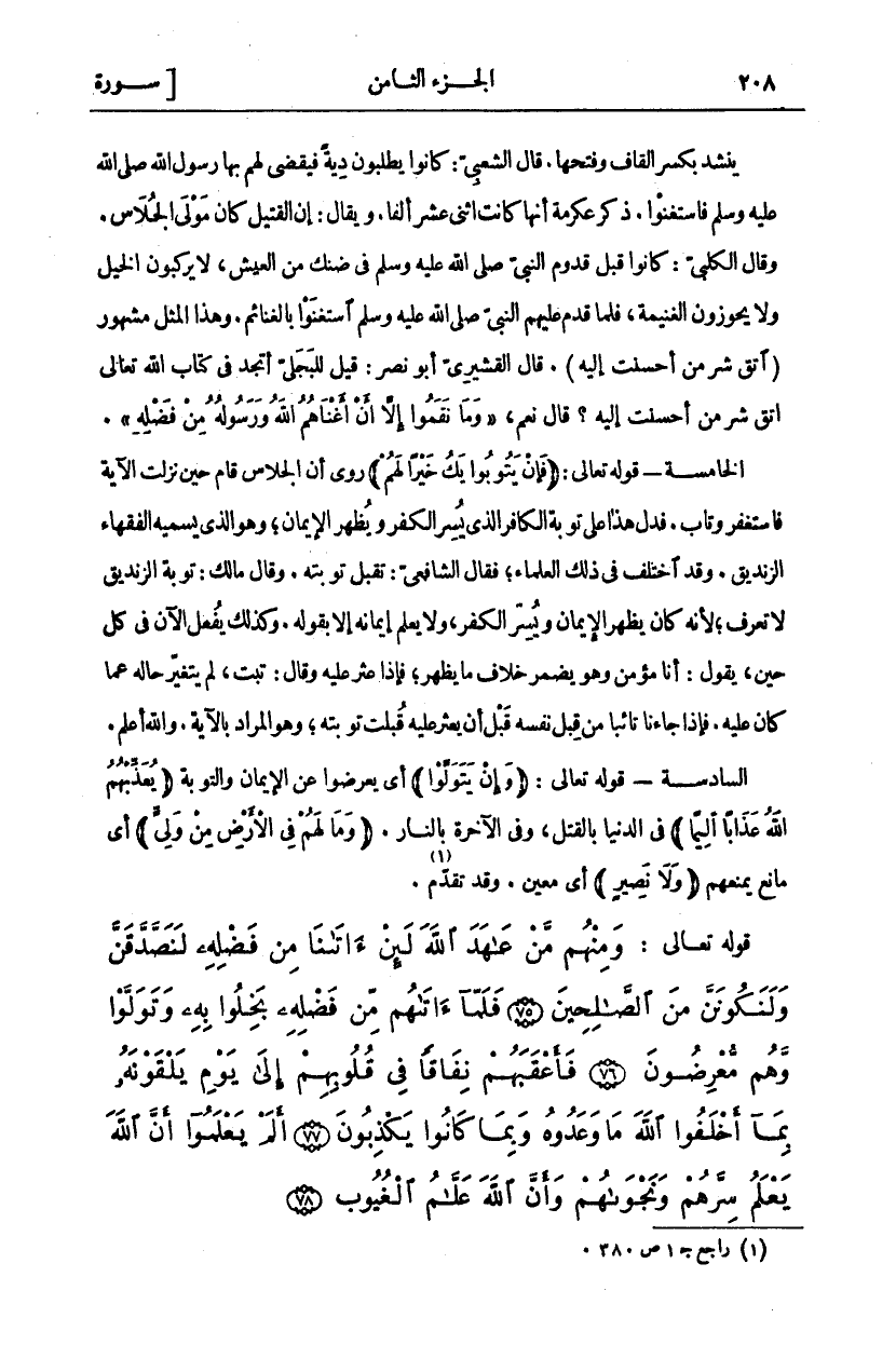 وَمِنْهُمْ مَنْ عاهَدَ اللَّهَ لَئِنْ آتَانَا مِنْ فَضْلِهِ لَنَصَّدَّقَنَّ وَلَنَكُونَنَّ مِنَ الصَّالِحِينَ (٧٥) فَلَمَّا آتاهُمْ مِنْ فَضْلِهِ بَخِلُوا بِهِ وَتَوَلَّوْا وَهُمْ مُعْرِضُونَ (٧٦) فَأَعْقَبَهُمْ نِفاقاً فِي قُلُوبِهِمْ إِلى يَوْمِ يَلْقَوْنَهُ بِما أَخْلَفُوا اللَّهَ مَا وَعَدُوهُ وَبِما كانُوا يَكْذِبُونَ (٧٧) أَلَمْ يَعْلَمُوا أَنَّ اللَّهَ يَعْلَمُ سِرَّهُمْ وَنَجْواهُمْ وَأَنَّ اللَّهَ عَلاَّمُ الْغُيُوبِ (٧٨)