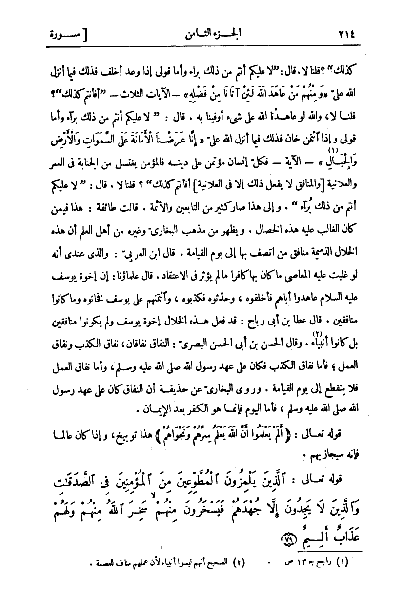 كَذَلِكَ؟ قُلْنَا: لَا. قَالَ: (لَا عَلَيْكُمْ أَنْتُمْ مِنْ ذَلِكَ بُرَآءُ وَأَمَّا قَوْلِي إِذَا وَعَدَ أَخْلَفَ فَذَلِكَ فِيمَا أَنْزَلَ اللَّهُ عَلَيَّ (وَمِنْهُمْ مَنْ عاهَدَ اللَّهَ لَئِنْ آتَانَا مِنْ فَضْلِهِ) - الْآيَاتِ الثَّلَاثَ- (أَفَأَنْتُمْ كَذَلِكَ)؟ قُلْنَا لَا، وَاللَّهِ لو عاهدنا الله على شي أو فينا بِهِ. قَالَ: (لَا عَلَيْكُمْ أَنْتُمْ مِنْ ذَلِكَ بُرَآءُ وَأَمَّا قَوْلِي وَإِذَا اؤْتُمِنَ خَانَ فَذَلِكَ فِيمَا أَنْزَلَ اللَّهُ عَلَيَّ" إِنَّا عَرَضْنَا الْأَمانَةَ عَلَى السَّماواتِ وَالْأَرْضِ وَالْجِبالِ" «١» [الأحزاب: ٧٢]- الْآيَةَ- (فَكُلُّ إِنْسَانٍ مُؤْتَمَنٌ عَلَى دِينِهِ فَالْمُؤْمِنُ يَغْتَسِلُ مِنَ الْجَنَابَةِ فِي السِّرِّ وَالْعَلَانِيَةِ [وَالْمُنَافِقُ لَا يَفْعَلُ ذَلِكَ إِلَّا فِي الْعَلَانِيَةِ] أَفَأَنْتُمْ كَذَلِكَ (؟ قُلْنَا لَا قَالَ:) لَا عَلَيْكُمْ أَنْتُمْ مِنْ ذَلِكَ بُرَآءُ (. وَإِلَى هَذَا صَارَ كَثِيرٌ مِنَ التَّابِعِينَ وَالْأَئِمَّةِ. قَالَتْ طَائِفَةٌ: هَذَا فِيمَنْ كَانَ الْغَالِبُ عَلَيْهِ هَذِهِ الْخِصَالَ. وَيَظْهَرُ مِنْ مَذْهَبِ الْبُخَارِيِّ وَغَيْرِهِ مِنْ أَهْلِ الْعِلْمِ أَنَّ هَذِهِ الْخِلَالَ الذَّمِيمَةَ مُنَافِقٌ مَنِ اتَّصَفَ بِهَا إِلَى يَوْمِ الْقِيَامَةِ. قَالَ ابْنُ الْعَرَبِيِّ: وَالَّذِي عِنْدِي أَنَّهُ لَوْ غَلَبَتْ عَلَيْهِ الْمَعَاصِي مَا كَانَ بِهَا كَافِرًا مَا لَمْ يُؤَثِّرْ فِي الِاعْتِقَادِ. قَالَ عُلَمَاؤُنَا: إِنَّ إِخْوَةَ يُوسُفَ عَلَيْهِ السَّلَامُ عَاهَدُوا أَبَاهُمْ فَأَخْلَفُوهُ، وَحَدَّثُوهُ فَكَذَبُوهُ، وَائْتَمَنَهُمْ عَلَى يُوسُفَ فَخَانُوهُ وَمَا كَانُوا مُنَافِقِينَ. قَالَ عَطَاءُ بْنُ أَبِي رَبَاحٍ: قَدْ فَعَلَ هَذِهِ الْخِلَالَ إِخْوَةُ يُوسُفَ وَلَمْ يَكُونُوا مُنَافِقِينَ بَلْ كَانُوا أَنْبِيَاءَ «٢». وَقَالَ الْحَسَنُ بْنُ أَبِي الْحَسَنِ الْبَصْرِيُّ: النِّفَاقُ نِفَاقَانِ، نِفَاقُ الْكَذِبِ وَنِفَاقُ الْعَمَلِ، فَأَمَّا نِفَاقُ الْكَذِبِ فَكَانَ عَلَى عَهْدِ رَسُولِ اللَّهِ صَلَّى اللَّهُ عَلَيْهِ وَسَلَّمَ، وَأَمَّا نِفَاقُ الْعَمَلِ فَلَا يَنْقَطِعُ إِلَى يَوْمِ الْقِيَامَةِ. وَرَوَى الْبُخَارِيُّ عَنْ حُذَيْفَةَ أَنَّ النِّفَاقَ كَانَ عَلَى عَهْدِ رَسُولِ اللَّهِ صَلَّى اللَّهُ عَلَيْهِ وَسَلَّمَ، فَأَمَّا الْيَوْمَ فَإِنَّمَا هُوَ الْكُفْرُ بَعْدَ الْإِيمَانِ. قَوْلُهُ تَعَالَى: (أَلَمْ يَعْلَمُوا أَنَّ اللَّهَ يَعْلَمُ سِرَّهُمْ وَنَجْواهُمْ) هَذَا تَوْبِيخٌ، وَإِذَا كَانَ عَالِمًا فإنه سيجازيهم.