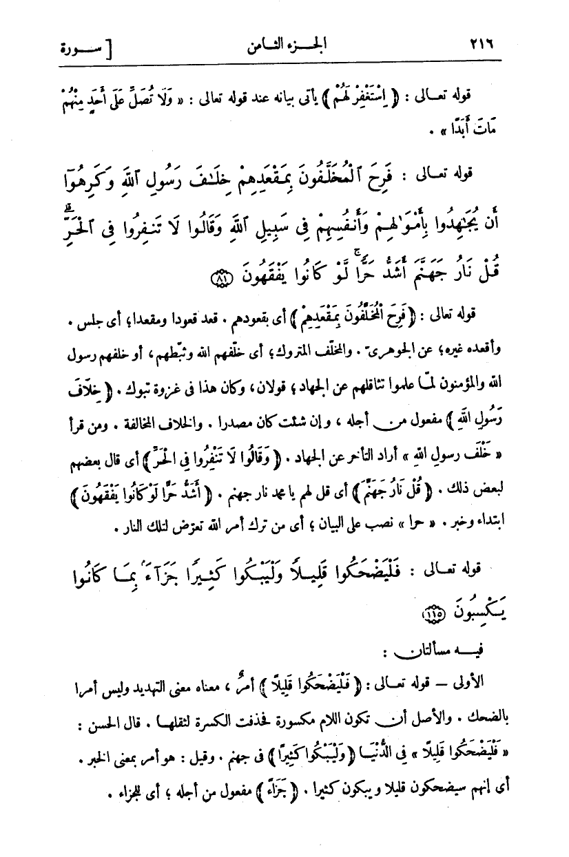 فَرِحَ الْمُخَلَّفُونَ بِمَقْعَدِهِمْ خِلافَ رَسُولِ اللَّهِ وَكَرِهُوا أَنْ يُجاهِدُوا بِأَمْوالِهِمْ وَأَنْفُسِهِمْ فِي سَبِيلِ اللَّهِ وَقالُوا لَا تَنْفِرُوا فِي الْحَرِّ قُلْ نارُ جَهَنَّمَ أَشَدُّ حَرًّا لَوْ كانُوا يَفْقَهُونَ (٨١)