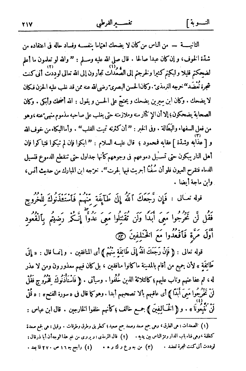 الثَّانِيَةُ- مِنَ النَّاسِ مَنْ كَانَ لَا يَضْحَكُ اهْتِمَامًا بِنَفْسِهِ وَفَسَادِ حَالِهِ فِي اعْتِقَادِهِ مِنْ شِدَّةِ الْخَوْفِ، وَإِنْ كَانَ عَبْدًا صَالِحًا. قَالَ صَلَّى اللَّهُ عَلَيْهِ وَسَلَّمَ: (وَاللَّهِ لَوْ تَعْلَمُونَ مَا أَعْلَمُ لَضَحِكْتُمْ قَلِيلًا وَلَبَكَيْتُمْ كَثِيرًا وَلَخَرَجْتُمْ إِلَى الصُّعُدَاتِ «١» تَجْأَرُونَ إِلَى اللَّهِ تَعَالَى لَوَدِدْتُ «٢» أَنِّي كُنْتُ شَجَرَةً تُعْضَدُ) خَرَّجَهُ التِّرْمِذِيُّ. وَكَانَ الْحَسَنُ الْبَصْرِيُّ رَضِيَ اللَّهُ عَنْهُ مِمَّنْ قَدْ غَلَبَ عَلَيْهِ الْحُزْنُ فَكَانَ لَا يَضْحَكُ. وَكَانَ ابْنُ سِيرِينَ يَضْحَكُ وَيَحْتَجُّ عَلَى الْحَسَنِ وَيَقُولُ: اللَّهُ أَضْحَكَ وَأَبْكَى. وَكَانَ الصَّحَابَةُ يَضْحَكُونَ، إِلَّا أَنَّ الْإِكْثَارَ مِنْهُ وَمُلَازَمَتَهُ حَتَّى يَغْلِبَ عَلَى صَاحِبِهِ مَذْمُومٌ مَنْهِيٌّ عَنْهُ، وَهُوَ مِنْ فِعْلِ السُّفَهَاءِ وَالْبَطَّالَةِ. وَفِي الْخَبَرِ: (أَنَّ كَثْرَتَهُ تُمِيتُ القلب) وأما البكاء من خوف الله و [عذابه وَشِدَّةِ «٣»] عِقَابِهِ فَمَحْمُودٌ، قَالَ عَلَيْهِ السَّلَامُ: (ابْكُوا فَإِنْ لَمْ تَبْكُوا فَتَبَاكَوْا فَإِنَّ أَهْلَ النَّارِ يَبْكُونَ حَتَّى تَسِيلَ دُمُوعُهُمْ فِي وُجُوهِهِمْ كَأَنَّهَا جَدَاوِلُ حَتَّى تَنْقَطِعَ الدُّمُوعُ فَتَسِيلُ الدِّمَاءُ فَتَقَرَّحَ الْعُيُونُ فَلَوْ أَنَّ سُفُنًا أُجْرِيَتْ فِيهَا لَجَرَتْ) خَرَّجَهُ ابْنُ الْمُبَارَكِ مِنْ حَدِيثِ أَنَسٍ وَابْنِ ماجة أيضا.