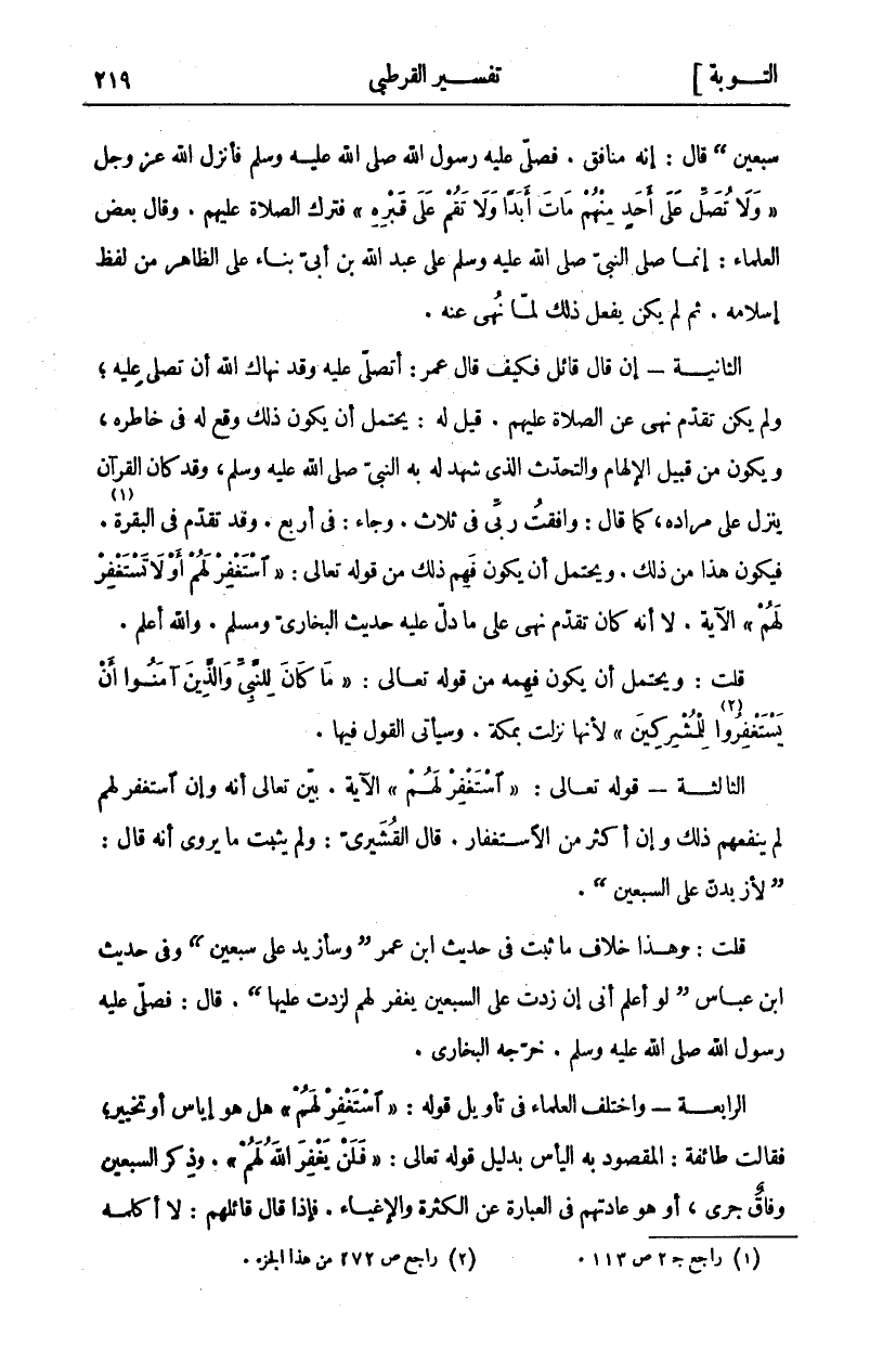 سَبْعِينَ) قَالَ: إِنَّهُ مُنَافِقٌ. فَصَلَّى عَلَيْهِ رَسُولُ اللَّهِ صَلَّى اللَّهُ عَلَيْهِ وَسَلَّمَ فَأَنْزَلَ اللَّهُ عَزَّ وَجَلَّ" وَلا تُصَلِّ عَلى أَحَدٍ مِنْهُمْ ماتَ أَبَداً وَلا تَقُمْ عَلى قَبْرِهِ" فَتَرَكَ الصَّلَاةَ عَلَيْهِمْ. وَقَالَ بَعْضُ الْعُلَمَاءِ: إِنَّمَا صَلَّى النَّبِيُّ صَلَّى اللَّهُ عَلَيْهِ وَسَلَّمَ عَلَى عَبْدِ اللَّهِ بْنِ أُبَيٍّ بِنَاءً عَلَى الظَّاهِرِ مِنْ لَفْظِ إِسْلَامِهِ. ثُمَّ لَمْ يَكُنْ يَفْعَلُ ذَلِكَ لَمَّا نُهِيَ عَنْهُ. الثَّانِيَةُ- إِنْ قَالَ قَائِلٌ فَكَيْفَ قَالَ عُمَرُ: أَتُصَلِّي عَلَيْهِ وَقَدْ نَهَاكَ اللَّهُ أَنْ تُصَلِّيَ عَلَيْهِ، وَلَمْ يَكُنْ تَقَدَّمَ نَهْيٌ عَنِ الصَّلَاةِ عَلَيْهِمْ. قِيلَ لَهُ: يَحْتَمِلُ أَنْ يَكُونَ ذَلِكَ وَقَعَ لَهُ فِي خَاطِرِهِ، وَيَكُونُ مِنْ قَبِيلِ الْإِلْهَامِ وَالتَّحَدُّثِ الَّذِي شَهِدَ لَهُ بِهِ النَّبِيُّ صَلَّى اللَّهُ عَلَيْهِ وَسَلَّمَ، وَقَدْ كَانَ الْقُرْآنُ يَنْزِلُ عَلَى مُرَادِهِ، كَمَا قَالَ: وَافَقْتُ رَبِّي فِي ثَلَاثٍ. وَجَاءَ: فِي أَرْبَعٍ. وَقَدْ تَقَدَّمَ فِي الْبَقَرَةِ «١». فَيَكُونُ هَذَا مِنْ ذَلِكَ. وَيَحْتَمِلُ أَنْ يَكُونَ فَهِمَ ذَلِكَ مِنْ قَوْلِهِ تَعَالَى:" اسْتَغْفِرْ لَهُمْ أَوْ لَا تَسْتَغْفِرْ لَهُمْ" [التوبة: ٨٠] الْآيَةَ. لَا أَنَّهُ كَانَ تَقَدَّمَ نَهْيٌ عَلَى مَا دَلَّ عَلَيْهِ حَدِيثُ الْبُخَارِيِّ وَمُسْلِمٍ. وَاللَّهُ أَعْلَمُ. قُلْتُ: وَيَحْتَمِلُ أَنْ يَكُونَ فَهِمَهُ مِنْ قوله تعالى:" مَا كانَ لِلنَّبِيِّ وَالَّذِينَ آمَنُوا أَنْ يَسْتَغْفِرُوا «٢» لِلْمُشْرِكِينَ" [التوبة: ١١٣] لِأَنَّهَا نَزَلَتْ بِمَكَّةَ. وَسَيَأْتِي الْقَوْلُ فِيهَا. الثَّالِثَةُ- قَوْلُهُ تَعَالَى: (اسْتَغْفِرْ لَهُمْ) الْآيَةَ. بَيَّنَ تَعَالَى أَنَّهُ وَإِنِ اسْتَغْفَرَ لَهُمْ لَمْ يَنْفَعْهُمْ ذَلِكَ وَإِنْ أَكْثَرَ مِنَ الِاسْتِغْفَارِ. قَالَ الْقُشَيْرِيُّ: وَلَمْ يَثْبُتْ مَا يُرْوَى أَنَّهُ قَالَ: (لَأَزِيدَنَّ عَلَى السَّبْعِينَ). قُلْتُ: وَهَذَا خِلَافُ مَا ثَبَتَ فِي حديث ابن عمر (وسأزيد على السبعين) وَفِي حَدِيثِ ابْنِ عَبَّاسٍ (لَوْ أَعْلَمُ أَنِّي إِنْ زِدْتُ عَلَى السَّبْعِينَ يُغْفَرُ لَهُمْ لَزِدْتُ عَلَيْهَا). قَالَ: فَصَلَّى عَلَيْهِ رَسُولُ اللَّهِ صَلَّى اللَّهُ عَلَيْهِ وَسَلَّمَ. خَرَّجَهُ الْبُخَارِيُّ. الرَّابِعَةُ- وَاخْتَلَفَ الْعُلَمَاءُ فِي تَأْوِيلِ قَوْلِهِ: (اسْتَغْفِرْ لَهُمْ) هَلْ هو إياس وتخيير فَقَالَتْ طَائِفَةٌ: الْمَقْصُودُ بِهِ الْيَأْسُ بِدَلِيلِ قَوْلِهِ تَعَالَى: (فَلَنْ يَغْفِرَ اللَّهُ لَهُمْ). وَذِكْرُ السَّبْعِينَ وِفَاقٌ جَرَى أَوْ هُوَ عَادَتُهُمْ فِي الْعِبَارَةِ عن الكثير والاغياء. فإذا قال قائلهم: لا أكلمه