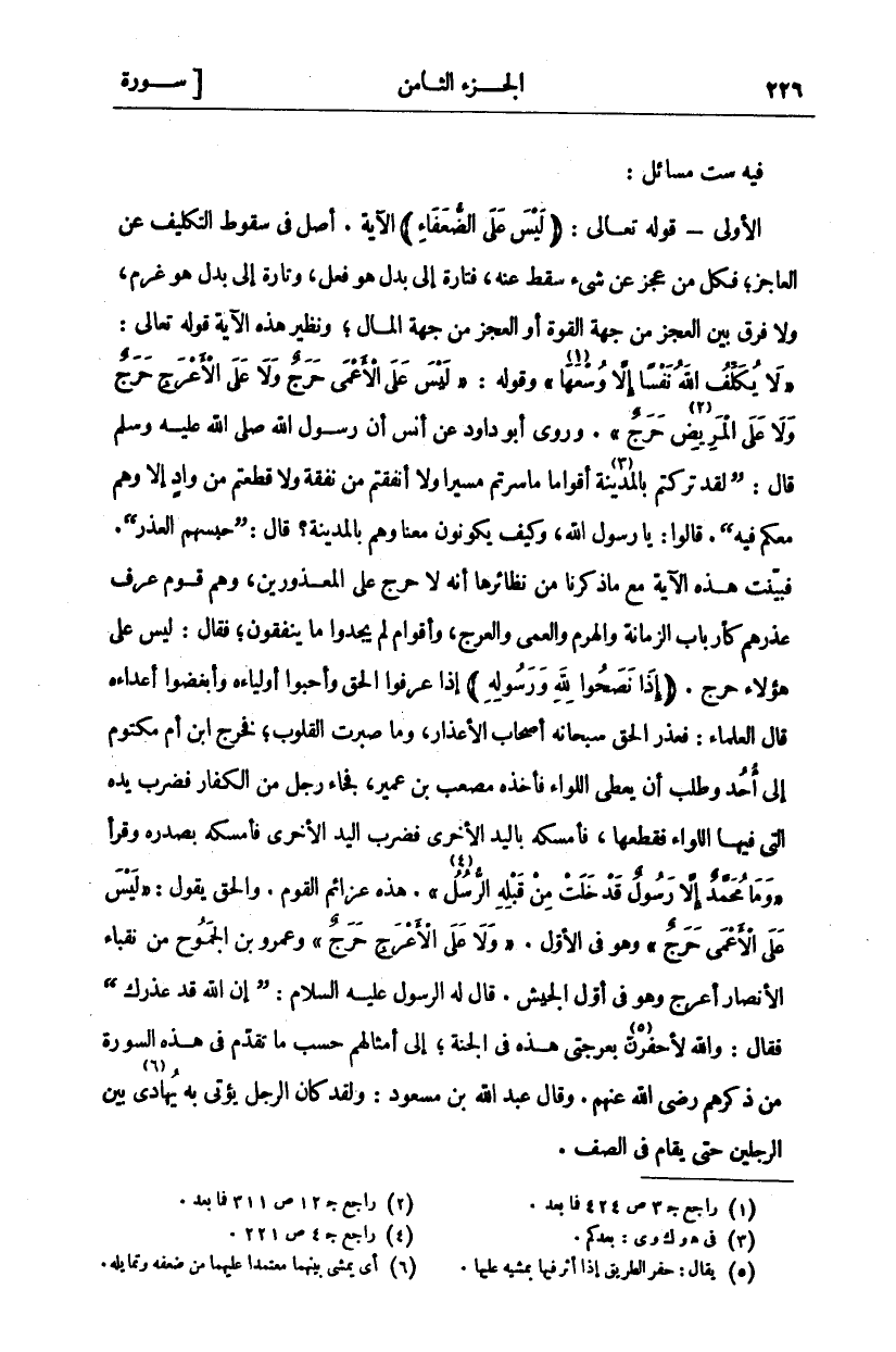 فِيهِ سِتُّ مَسَائِلَ: الْأُولَى- قَوْلُهُ تَعَالَى:" لَيْسَ عَلَى الضُّعَفاءِ" الْآيَةَ. أَصْلٌ فِي سُقُوطُ التَّكْلِيفِ عن العاجز، فكل من عجز عن شي سَقَطَ عَنْهُ، فَتَارَةً إِلَى بَدَلٍ هُوَ فِعْلٌ، وَتَارَةً إِلَى بَدَلٍ هُوَ غُرْمٌ، وَلَا فَرْقَ بَيْنَ الْعَجْزِ مِنْ جِهَةِ الْقُوَّةِ أَوِ الْعَجْزِ مِنْ جِهَةِ الْمَالِ، وَنَظِيرُ هَذِهِ الْآيَةِ قَوْلُهُ تَعَالَى:" لَا يُكَلِّفُ اللَّهُ نَفْساً إِلَّا وُسْعَها" «١» [البقرة: ٢٨٦] وَقَوْلُهُ:" لَيْسَ عَلَى الْأَعْمى حَرَجٌ وَلا عَلَى الْأَعْرَجِ حَرَجٌ وَلا عَلَى الْمَرِيضِ «٢» حَرَجٌ" [النور: ٦١]. وَرَوَى أَبُو دَاوُدَ عَنْ أَنَسٍ أَنَّ رَسُولَ اللَّهِ صَلَّى اللَّهُ عَلَيْهِ وَسَلَّمَ قَالَ: (لَقَدْ تَرَكْتُمْ بِالْمَدِينَةِ «٣» أَقْوَامًا مَا سِرْتُمْ مَسِيرًا وَلَا أَنْفَقْتُمْ مِنْ نَفَقَةٍ وَلَا قَطَعْتُمْ مِنْ وَادٍ إِلَّا وَهُمْ مَعَكُمْ فِيهِ). قَالُوا: يَا رَسُولَ اللَّهِ، وَكَيْفَ يَكُونُونَ مَعَنَا وَهُمْ بِالْمَدِينَةِ؟ قَالَ: (حَبَسَهُمُ الْعُذْرُ). فَبَيَّنَتْ هَذِهِ الْآيَةُ مَعَ مَا ذَكَرْنَا مِنْ نَظَائِرِهَا أَنَّهُ لَا حَرَجَ عَلَى الْمَعْذُورِينَ، وَهُمْ قَوْمٌ عُرِفَ عُذْرُهُمْ كَأَرْبَابِ الزَّمَانَةِ وَالْهَرَمِ وَالْعَمَى وَالْعَرَجِ، وَأَقْوَامٍ لَمْ يَجِدُوا مَا يُنْفِقُونَ، فَقَالَ: لَيْسَ عَلَى هَؤُلَاءِ حَرَجٌ. (إِذَا نَصَحُوا لِلَّهِ وَرَسُولِهِ) إِذَا عَرَفُوا الْحَقَّ وَأَحَبُّوا أَوْلِيَاءَهُ وَأَبْغَضُوا أَعْدَاءَهُ قَالَ الْعُلَمَاءُ: فَعَذَرَ الْحَقُّ سُبْحَانَهُ أَصْحَابَ الْأَعْذَارِ، وَمَا صَبَرَتِ الْقُلُوبُ، فَخَرَجَ ابْنُ أُمِّ مَكْتُومٍ إِلَى أُحُدٍ وَطَلَبَ أَنْ يُعْطَى اللِّوَاءَ فَأَخَذَهُ مُصْعَبُ بْنُ عُمَيْرٍ، فَجَاءَ رَجُلٌ مِنَ الْكُفَّارِ فَضَرَبَ يَدَهُ الَّتِي فِيهَا اللِّوَاءُ فَقَطَعَهَا، فَأَمْسَكَهُ بِالْيَدِ الْأُخْرَى فَضَرَبَ الْيَدَ الْأُخْرَى فَأَمْسَكَهُ بِصَدْرِهِ وَقَرَأَ" وَما مُحَمَّدٌ إِلَّا رَسُولٌ قَدْ خَلَتْ مِنْ قَبْلِهِ الرُّسُلُ" «٤» [آل عمران: ١٤٤]. هَذِهِ عَزَائِمُ الْقَوْمِ. وَالْحَقُّ يَقُولُ:" لَيْسَ عَلَى الْأَعْمى حَرَجٌ" [النور: ٦١] وَهُوَ فِي الْأَوَّلِ." وَلا عَلَى الْأَعْرَجِ حَرَجٌ" [النور: ٦١] وَعَمْرُو بْنُ الْجَمُوحِ مِنْ نُقَبَاءِ الْأَنْصَارِ أَعْرَجُ وَهُوَ فِي أَوَّلِ الْجَيْشِ. قَالَ لَهُ الرَّسُولُ عَلَيْهِ السَّلَامُ: (إِنَّ اللَّهَ قَدْ عَذَرَكَ) فَقَالَ: وَاللَّهِ لَأَحْفِرَنَّ «٥» بِعَرْجَتِي هَذِهِ فِي الْجَنَّةِ، إِلَى أَمْثَالِهِمْ حَسْبَ مَا تَقَدَّمَ فِي هَذِهِ السُّورَةِ مِنْ ذِكْرِهِمْ رَضِيَ اللَّهُ عَنْهُمْ. وَقَالَ عَبْدُ اللَّهِ بْنُ مَسْعُودٍ: وَلَقَدْ كَانَ الرَّجُلُ يُؤْتَى بِهِ يُهَادَى «٦» بَيْنَ الرَّجُلَيْنِ حَتَّى يُقَامَ فِي الصف.